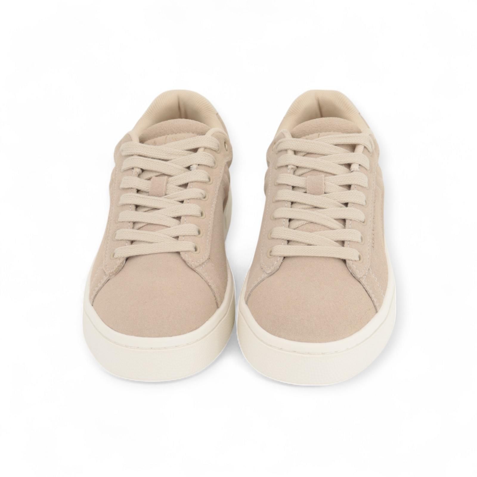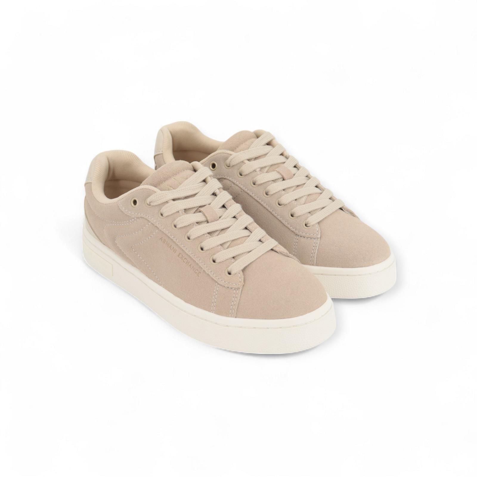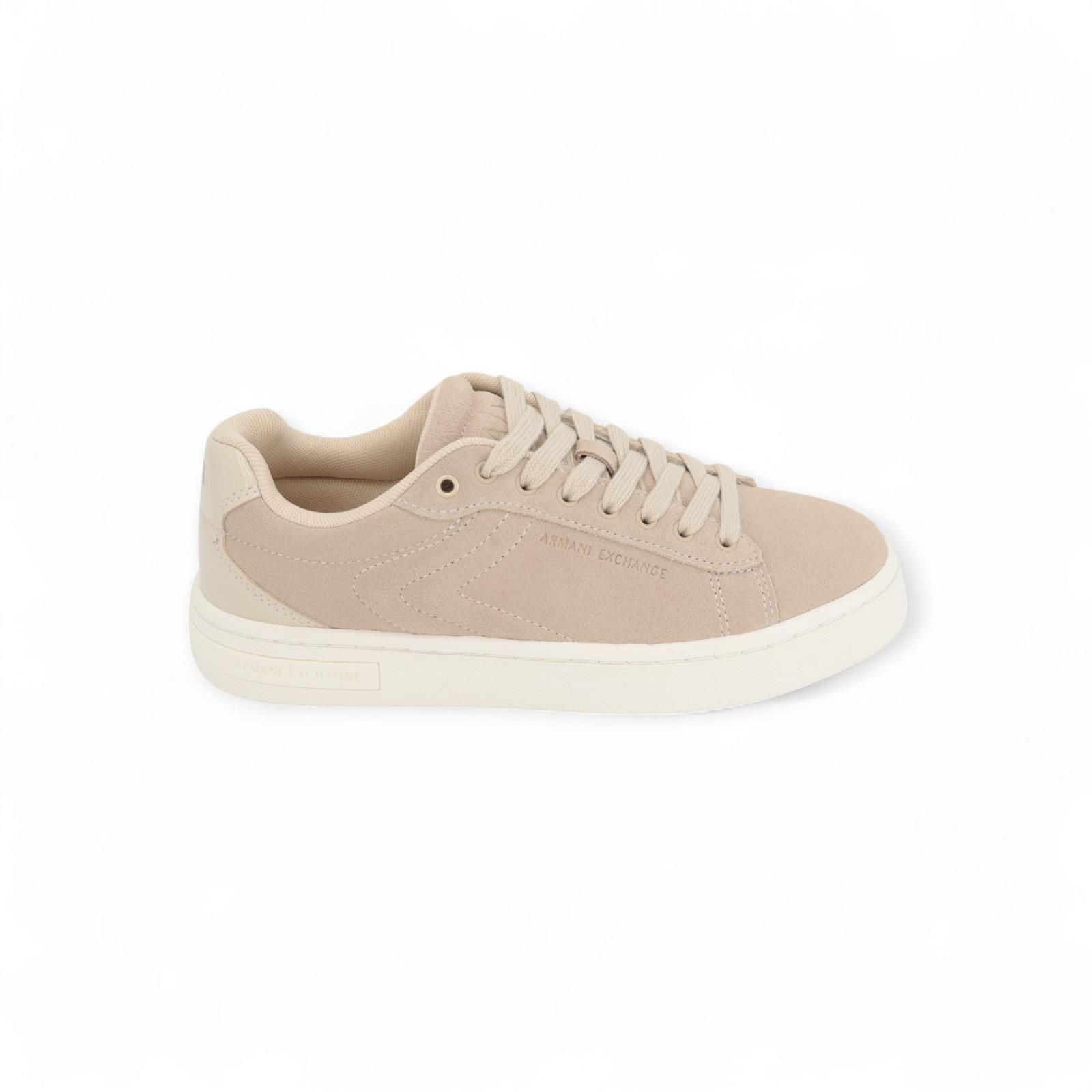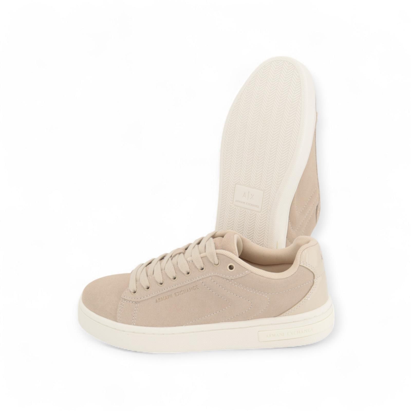 Sneaker Giorgio Armani voor dames. Deze stijlvolle sneaker is uit de Armani Exchange collectie. Is in zand suède met witte stiksels en gewatteerd suède aan de zijkant. Heeft een lakleder beige hielflap met logo in van Armani AX. Is op een witte antislipzool en heeft een uitneembare binnenzool