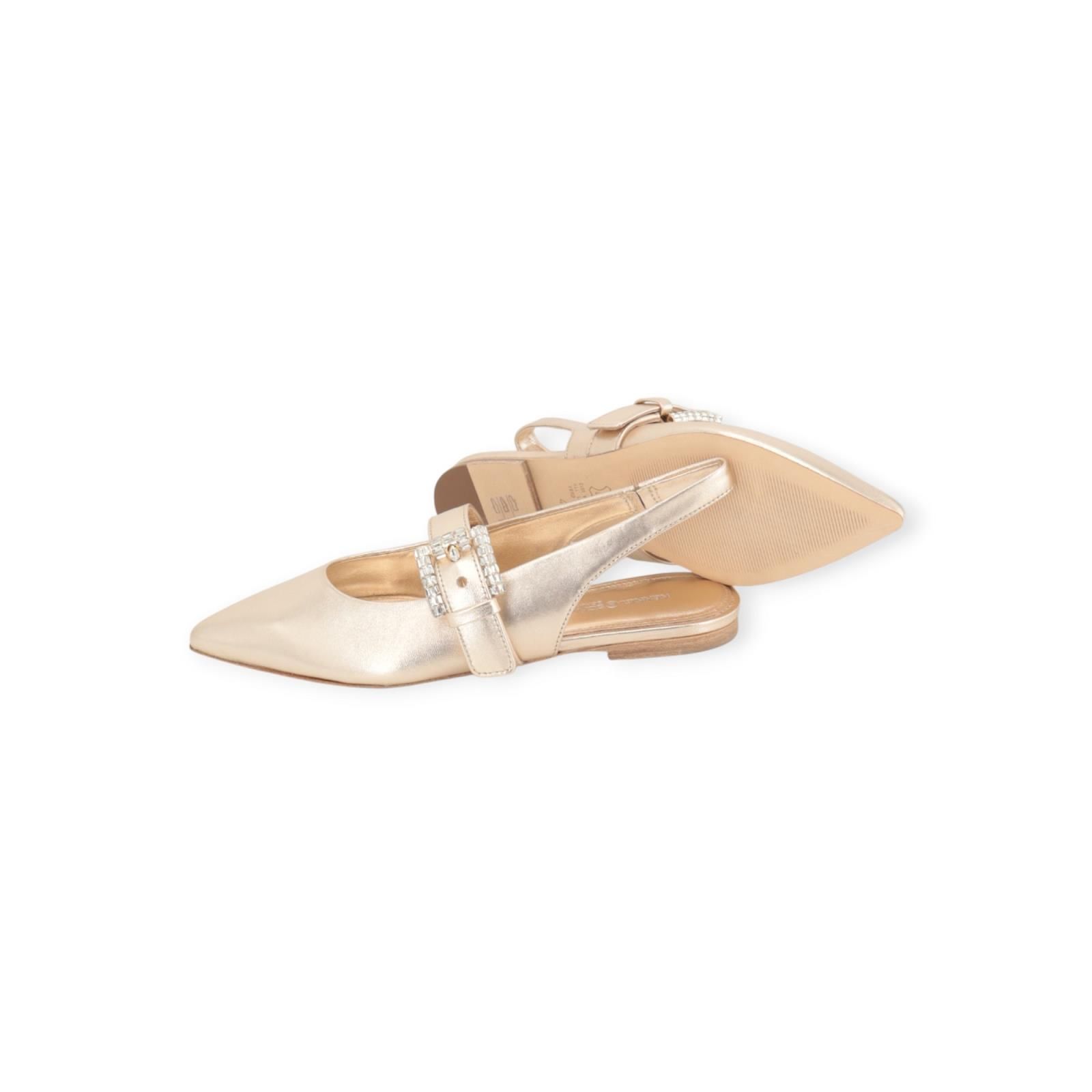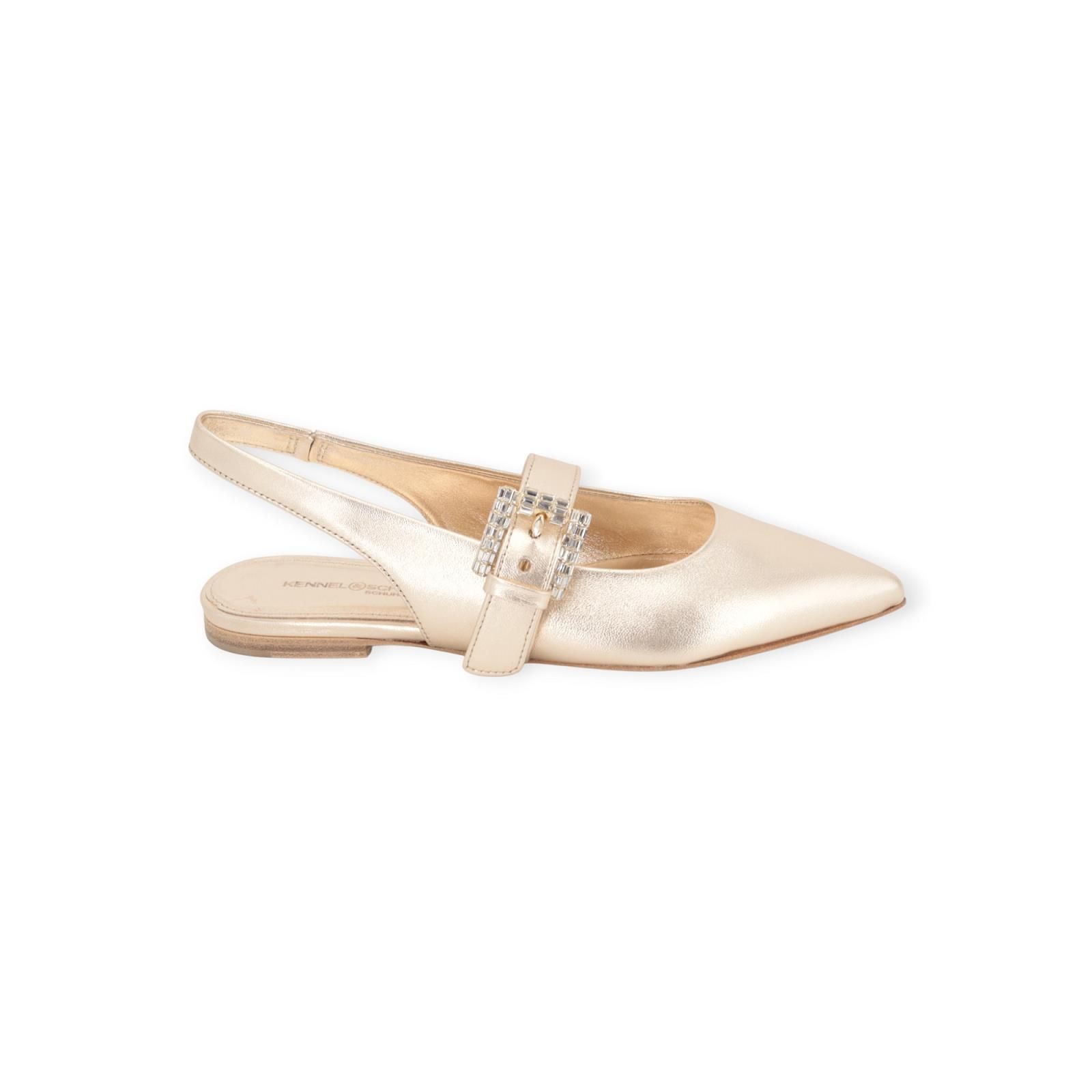 Ballerina Greta van Kennel & Schmenger voor dames. Deze elegante slingback is in goud shining leer. Heeft een bandje over de wreef en rond de enkel met een opvallende gespsluiting en steentjes. De puntige silhouet zorgt voor een vrouwelijke touch. De buitenzool is in leer.