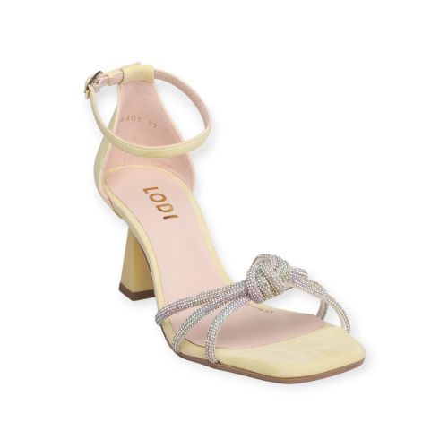 Sandaal Jose van Lodi voor dames. Deze op en top elegante sandaal is in shining goud leer. Heeft een gesloten hiel met een bandje rond de enkel en een gouden gespsluiting. Is op een fijn hakje van 6cm hoog met een leren buitenzool.