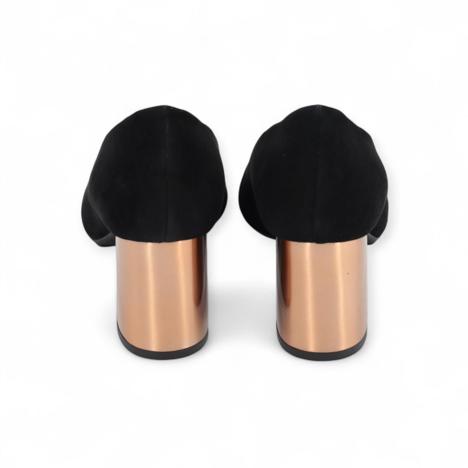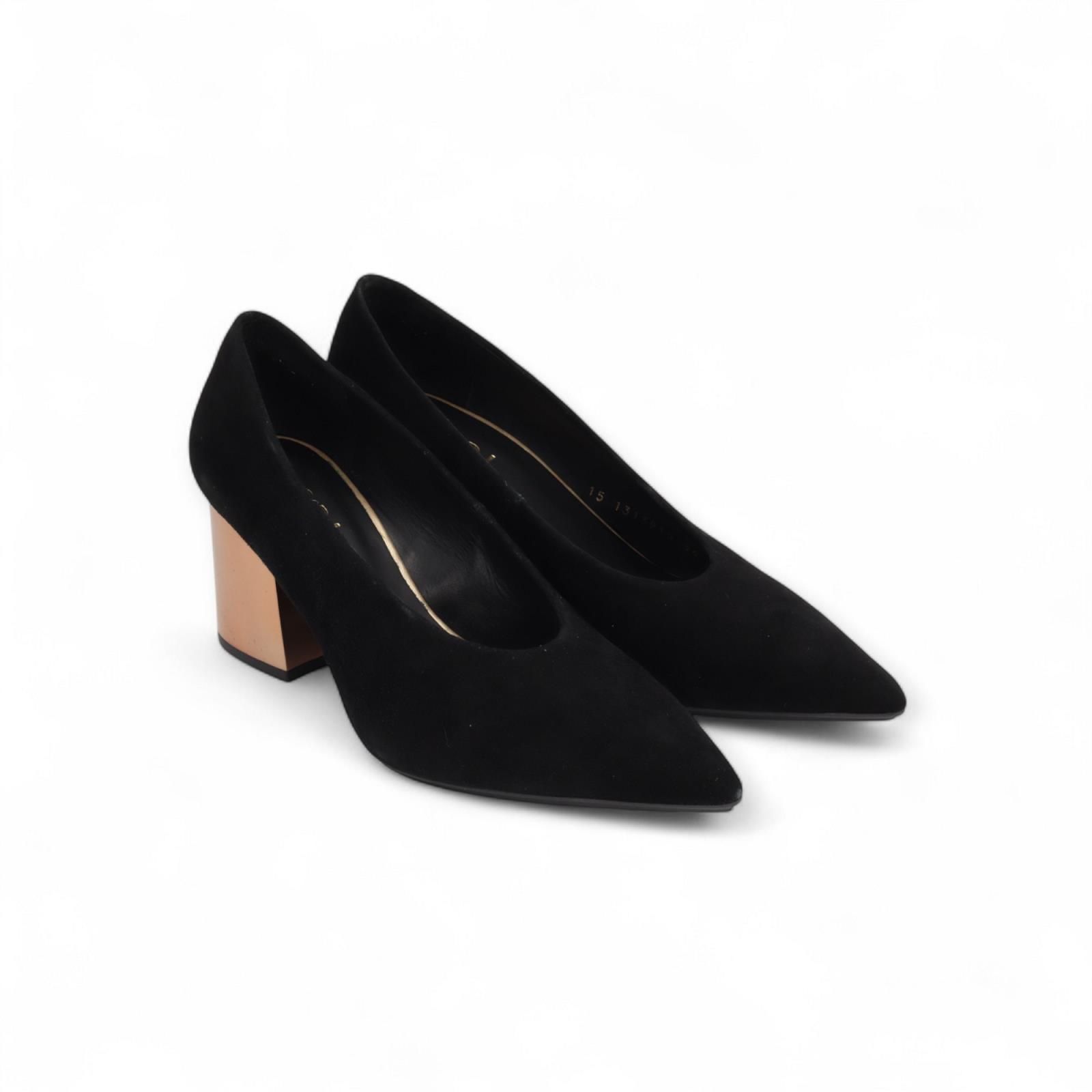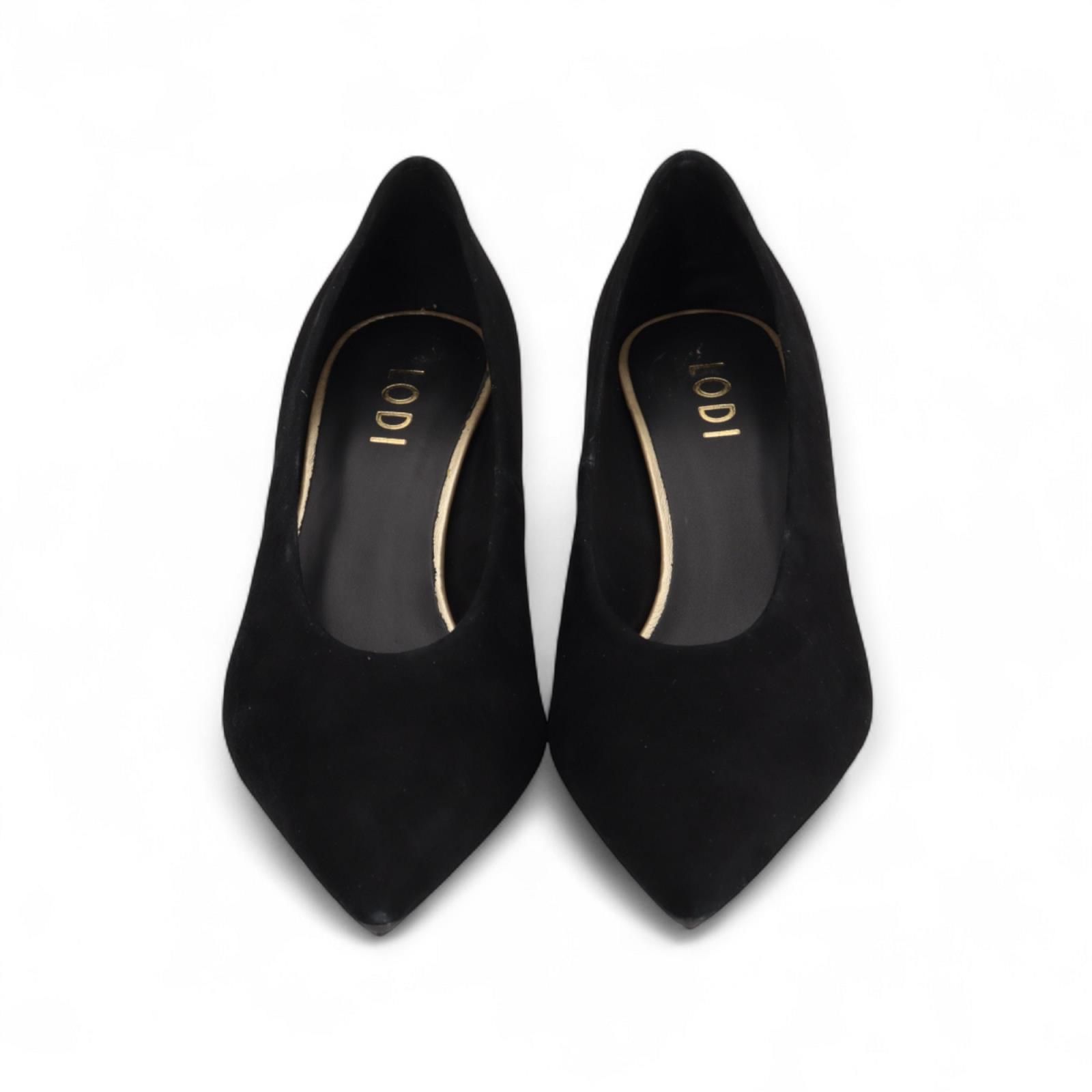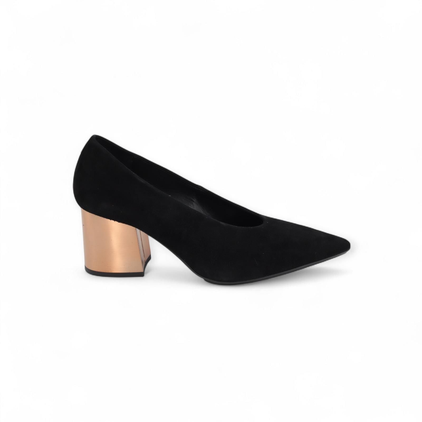 Pump Noria van LODI voor dames. Deze bruine pump is in zwart suède. Heeft een scherpe punt en als eyecatcher een gouden ronde hak van 5-5.5cm hoog.