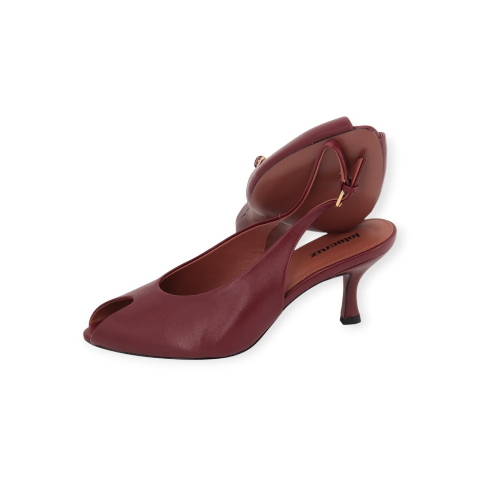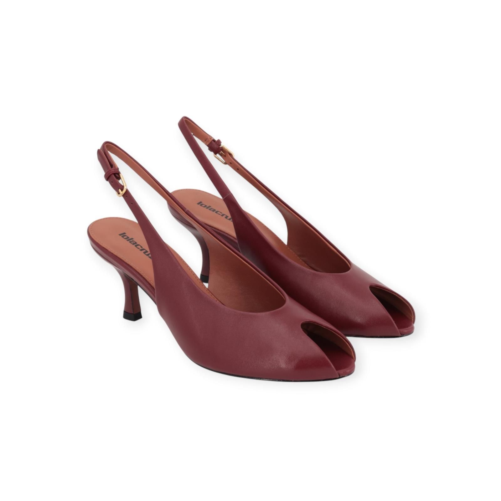 Pump Gabriette van Lola Cruz voor dames. Dit elegant slingback model is in bordeaux leer met een open neus en open hieltje. De spitse open neus verlengt de voet en geeft deze schoen een nog meer vrouwelijke en geraffineerde touch. Is afgesloten met een gouden gespsluiting rond de hiel. Heeft een fijn hakje van 7cm hoog met een leren buitenzool.