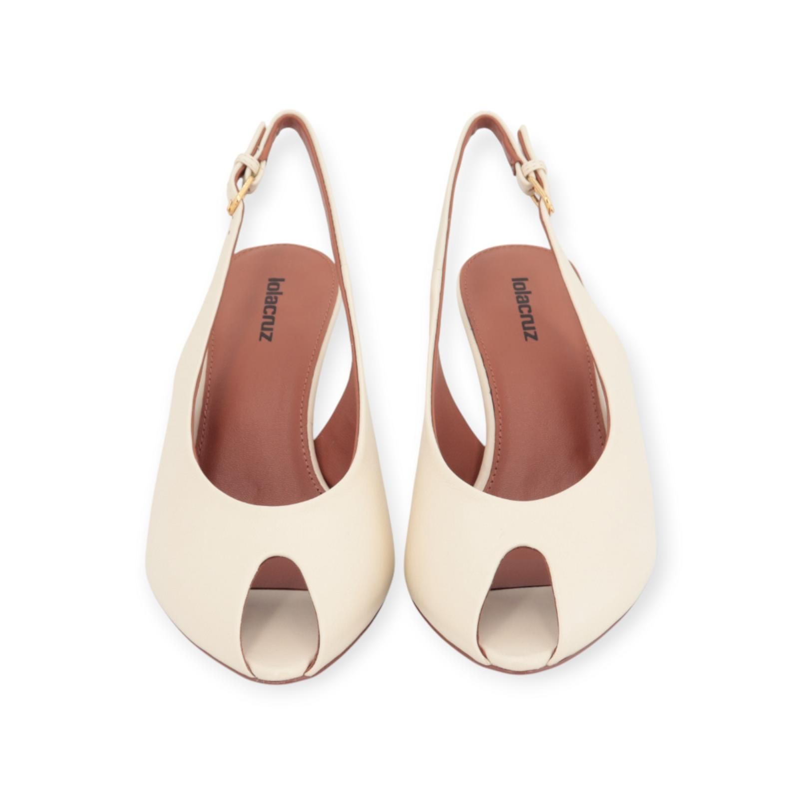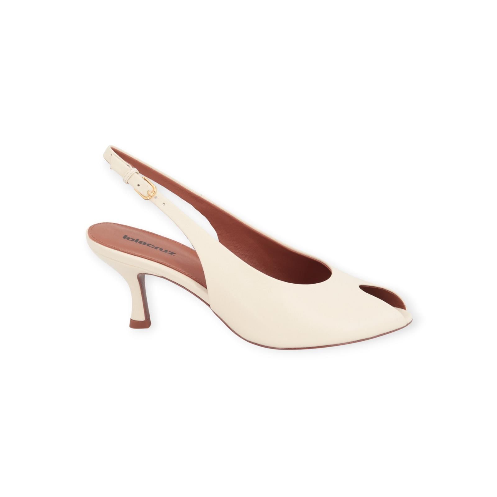 Pump Gabriette van Lola Cruz voor dames. Dit elegant slingback model is in off wit leer met een open neus en open hieltje. De spitse open neus verlengt de voet en geeft deze schoen een nog meer vrouwelijke en geraffineerde touch. Is afgesloten met een gouden gespsluiting rond de hiel. Heeft een fijn hakje van 7cm hoog met een leren buitenzool.
