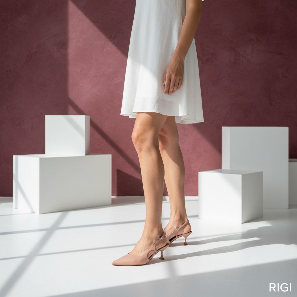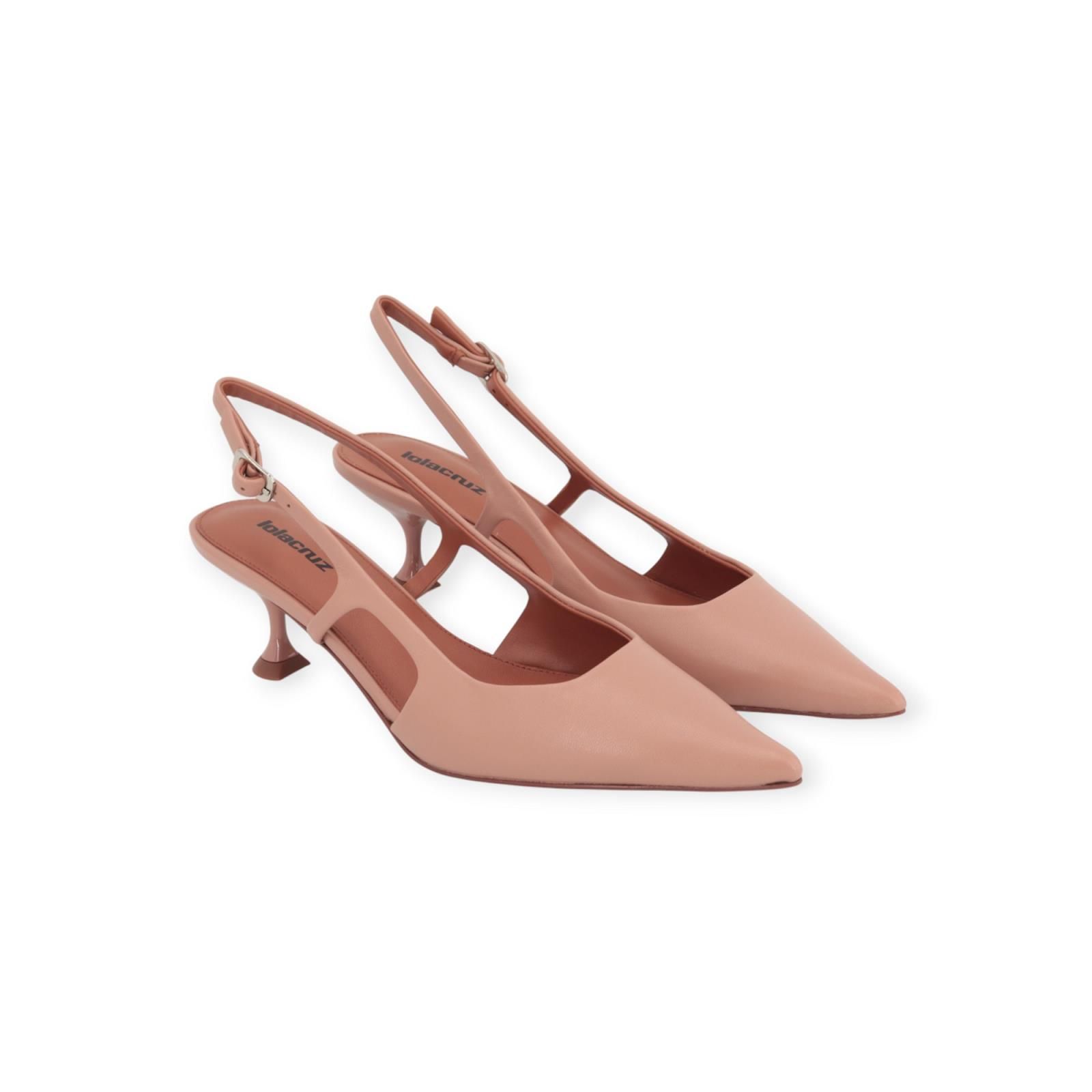 Pump Rhina van Lola Cruz voor dames. Dit elegant slingback model is in warm nude leer met een scherpe neus en open hieltje. Is afgewerkt met fijne bandjes en gesloten met een gouden gespsluiting rond de hiel. Heeft een fijn hakje van 6cm hoog met een leren buitenzool.