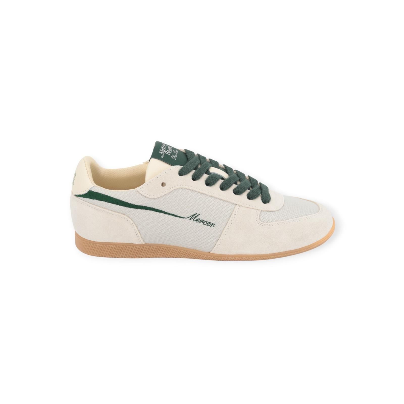 Sneaker Re-Low van Mercer voor dames. Deze sneaker is in in off wit suède met grijze zachte mesh uitvoering. Afgewerkt met groene veters en groene borduring aan de zijkant met Mercer. Is op een Italiaans rubberen buitenzool en een uitneembare binnenzool. Dit laag profiel is zeer clean en ingetogen voor een zachte uitstraling.