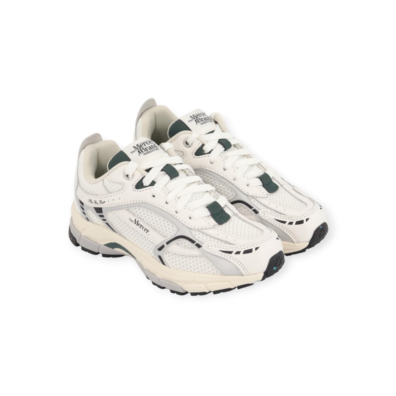 Sneaker The Re-Run van Mercer voor dames. Deze sneaker is in wit leer en wit mesh met shining zilver. Afgewerkt met het groene details in de flap, hielflap en logo. The Re-Run is dé klassieker waar het allemaal mee begon ontworpen voor comfort en volledig uit gerecycled materiaal vervaardigd. Heeft een lichtgewicht EVA-middenzool voor een gedempte stap, gecombineerd met een duurzame buitenzool van gerecycled rubber voor langdurige grip. De binnenzool is uitneembaar. Combineer deze schoen met je favoriete outfit van Mercer.