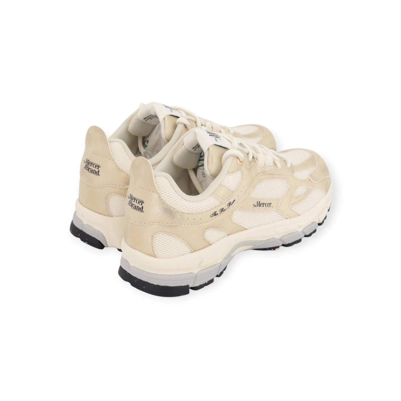 Sneaker The Re-Run Metallic van Mercer voor dames. Deze runner is in goud mat metallic met een vintage finish en een subtiele glans. The Re-Run is ontworpen voor comfort en volledig uit gerecycled materiaal vervaardigd. Heeft een lichtgewicht EVA-middenzool voor een gedempte stap, gecombineerd met een duurzame buitenzool van gerecycled rubber voor langdurige grip. De binnenzool is uitneembaar. Combineer deze schoen met je favoriete outfit van Mercer.