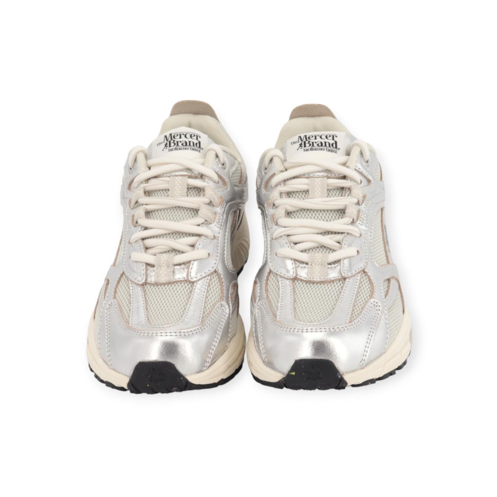 Sneaker The Re-Run Pine van Mercer voor dames. Deze sneaker is in shining zilver afgewerkt met chic, fijnmazig mesh voor een sportieve maar toch high-end look. De binnenzool is uitneembaar. ‘Pine’ voorheen ananasleer. Nu gewoonweg een boterzacht leren bovenwerk van een gecertificeerde leerlooierij. Duurzaam en gaat lang mee. Nog steeds gebouwd met de retro runner: Re-Run lijn. Dezelfde zool, dezelfde vibe, dezelfde slimme details. Alleen duurzamer en hoogwaardiger.