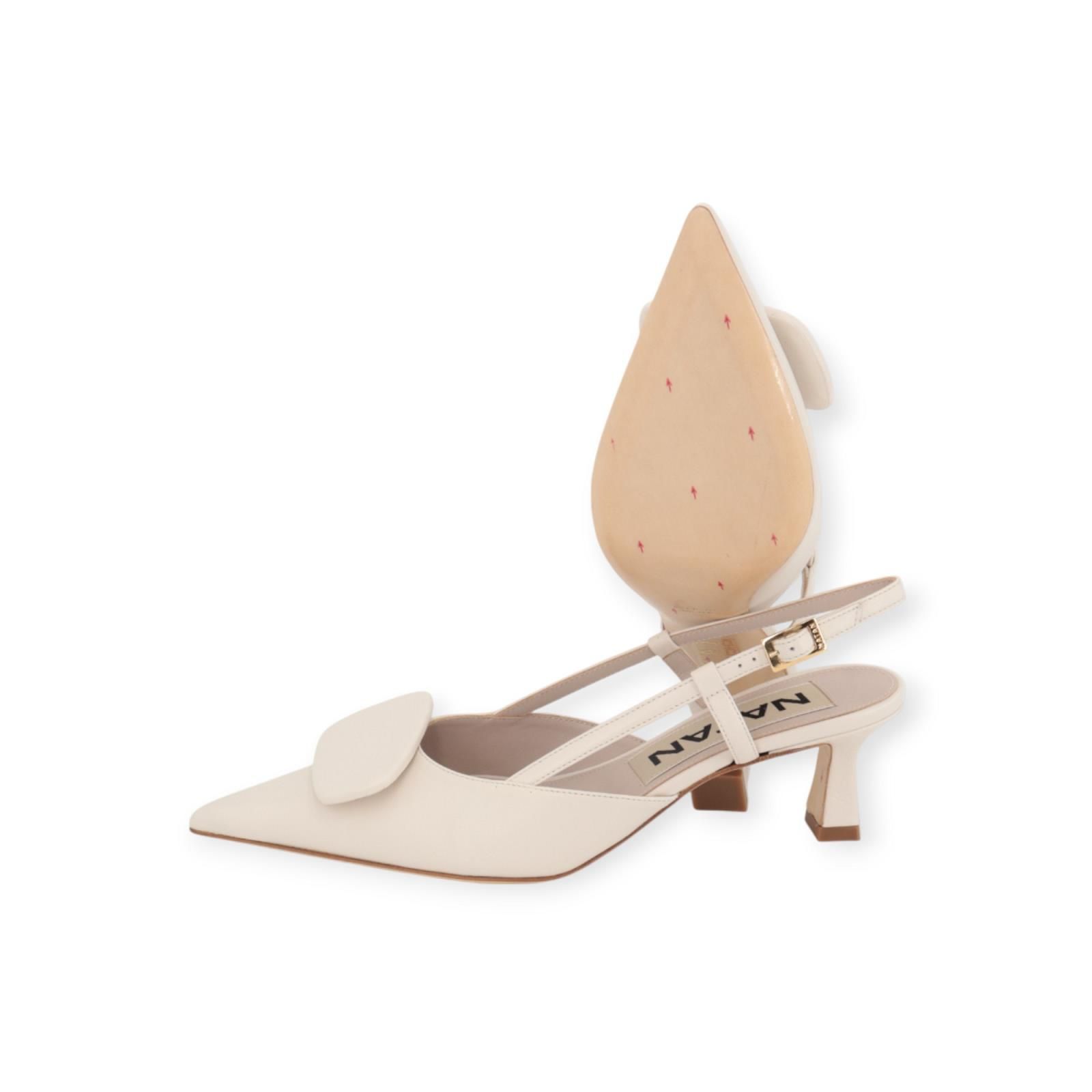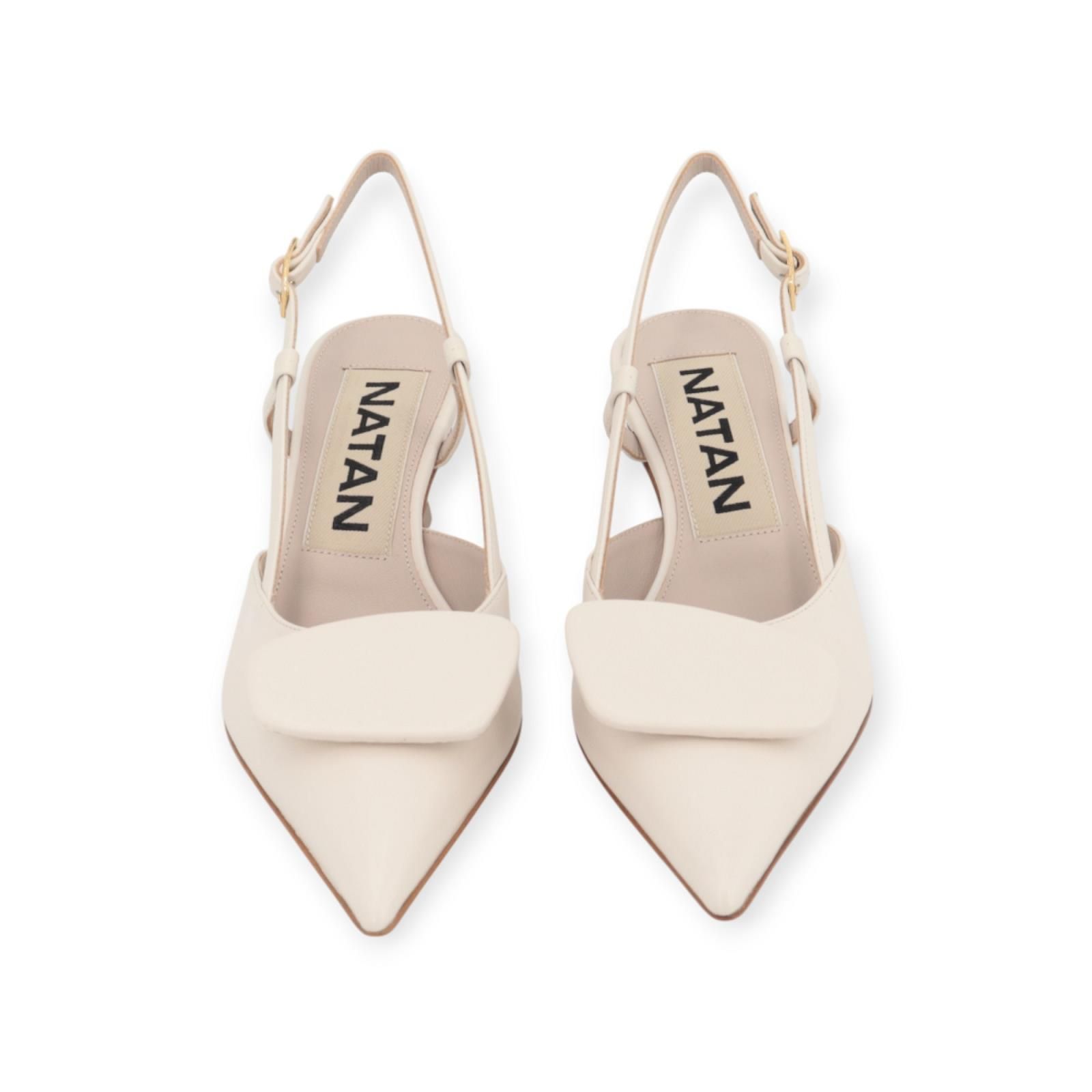 Pump N4106 van Natan voor dames. Deze pump is in nude zacht leer. Heeft een mooi geometrische boekel op de wreef met een scherpe neus. Is op een fijn naaldhakje van 5cm hoog. Dit slingback model heeft een open hiel. Is afgesloten met een bandje rond de enkel met een gouden gespsluiting. De buitenzool is in leer. Combineer deze prachtige pump met de bijpassende clutch.