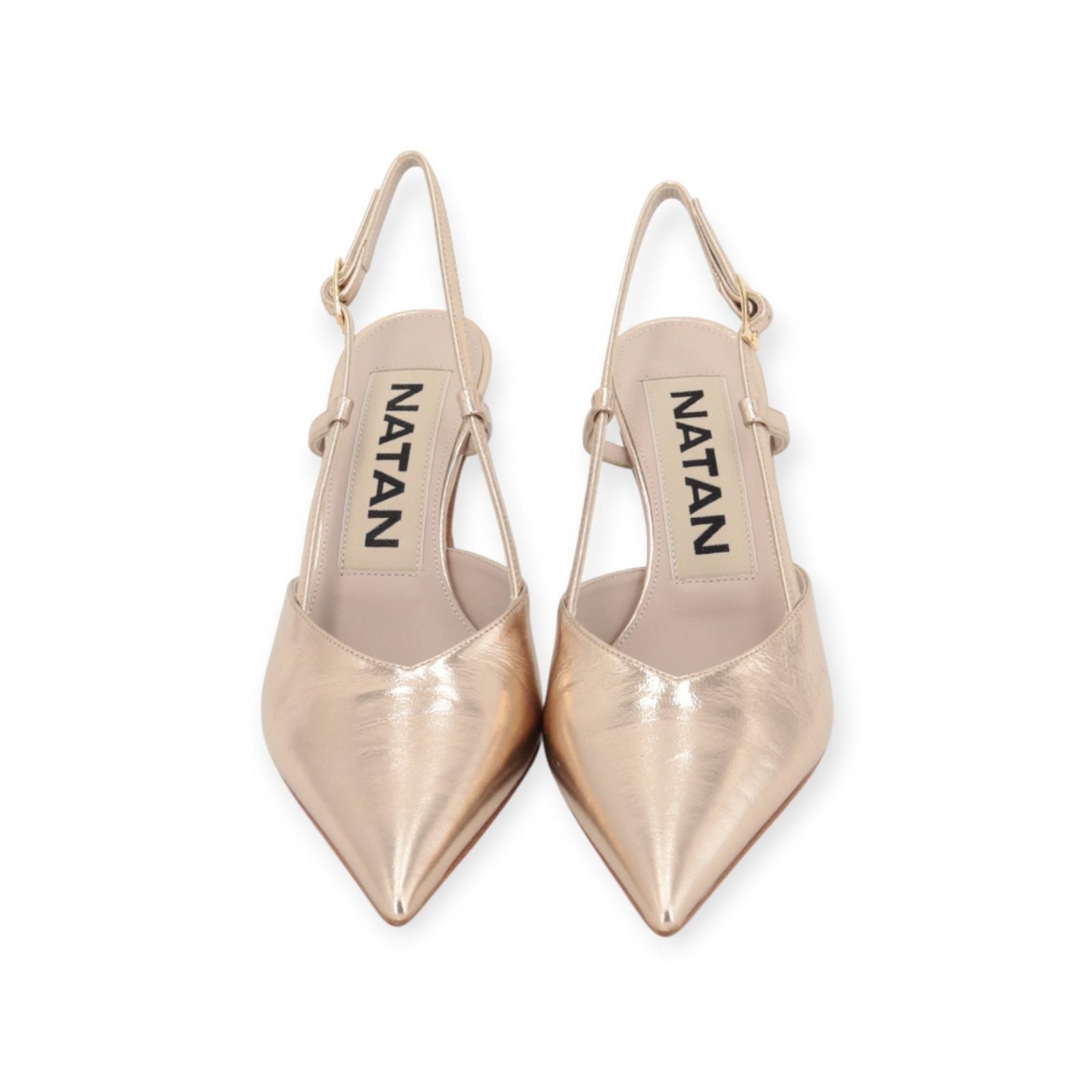 Pump N4107 van Natan voor dames. Dit elegant slingback model is in platino shining leer. Heeft een scherpe neus met een open hieltje. Blijft mooi vast aan de hiel door het leren bandje met gouden gespsluiting. Heeft een elegant fijn hakje van 7,5cm hoog. Combineer deze prachtige pump met bijpassende clutch.