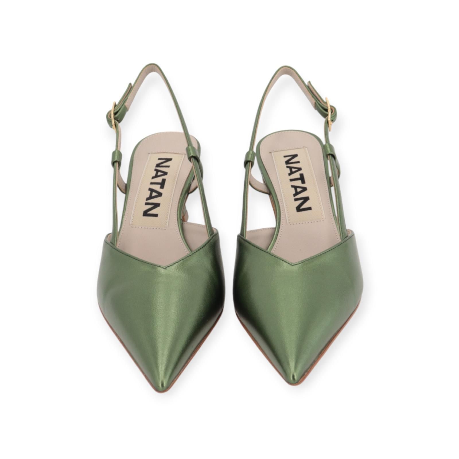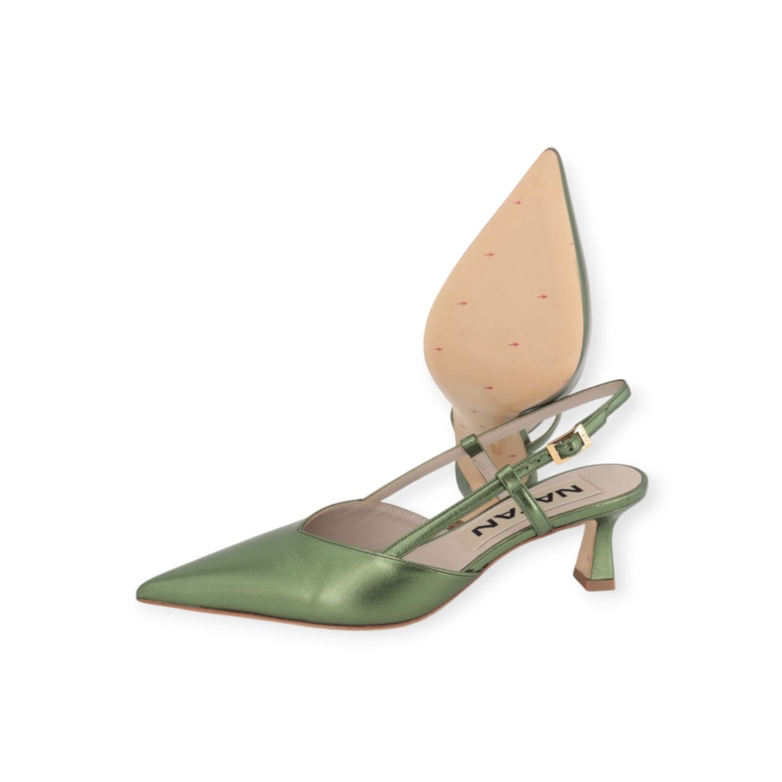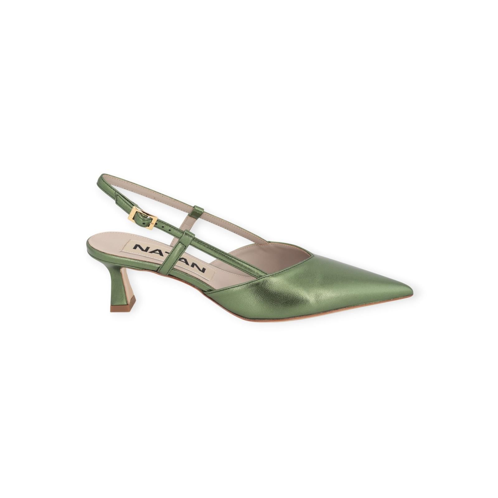 Pump N4108 van Natan voor dames. Dit elegant slingback model is in groen shining leer. Heeft een scherpe neus met een open hieltje. Blijft mooi vast aan de hiel door het leren bandje met gouden gespsluiting. Heeft een elegant fijn hakje van 5cm hoog.