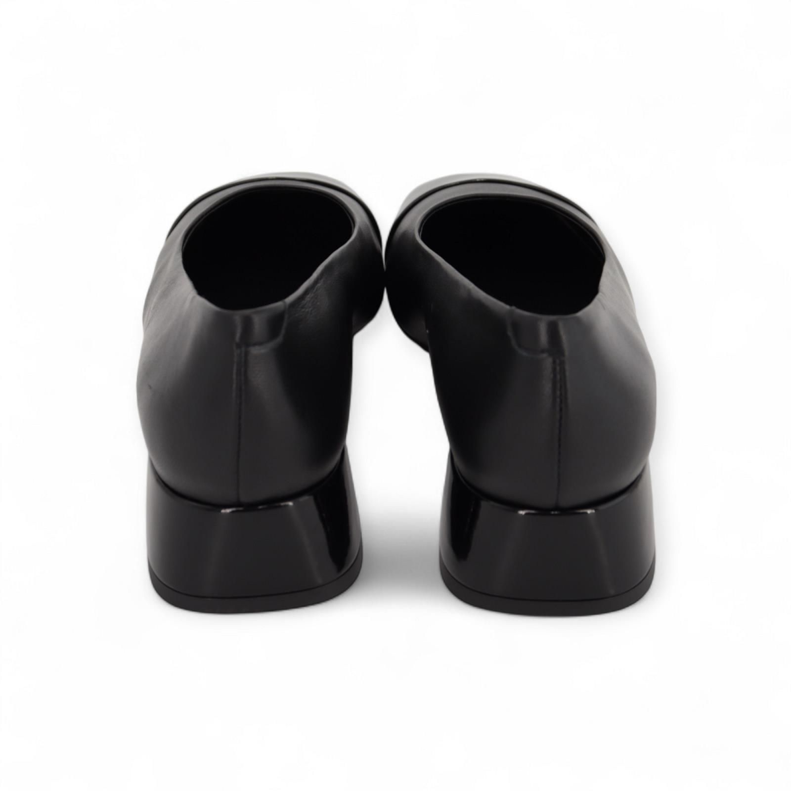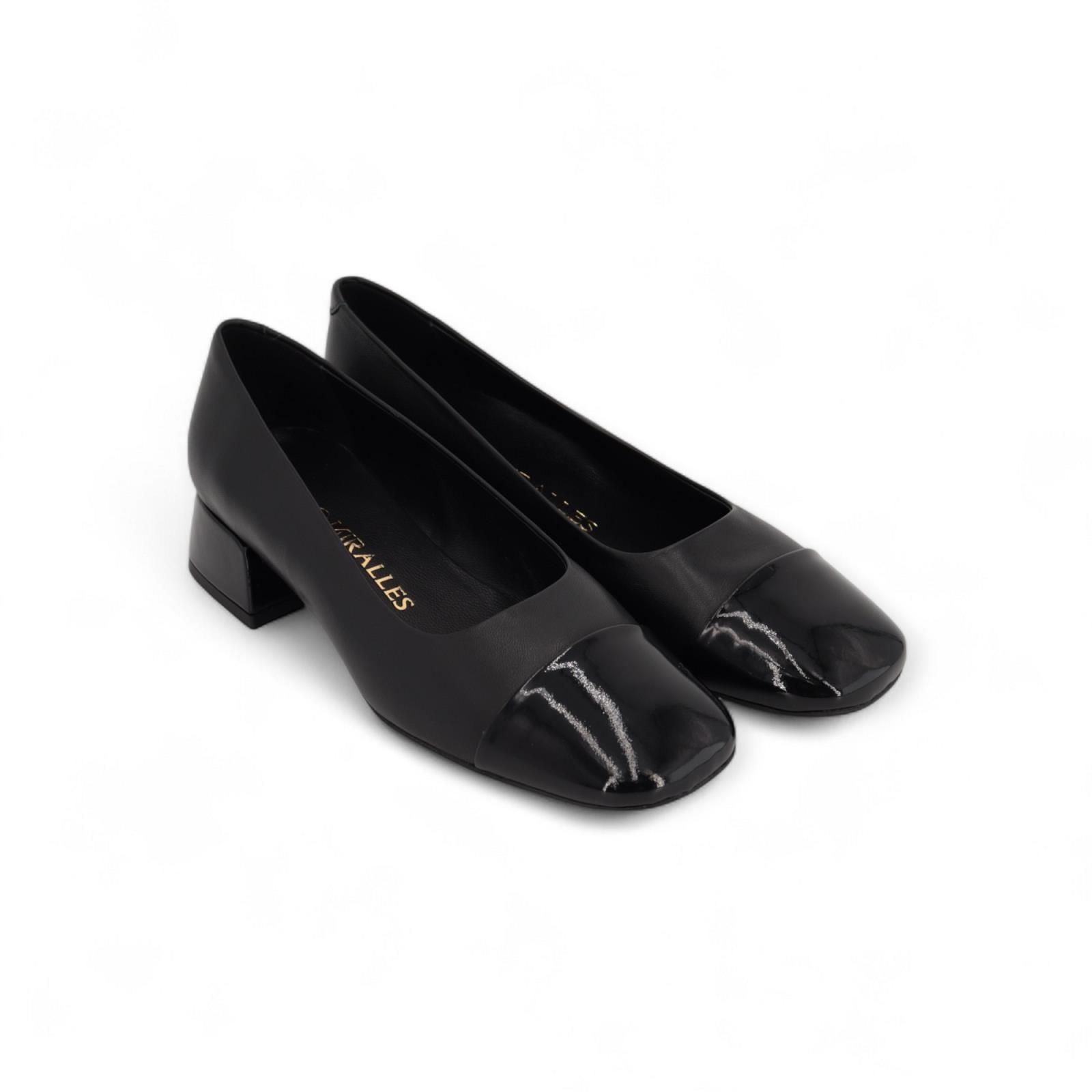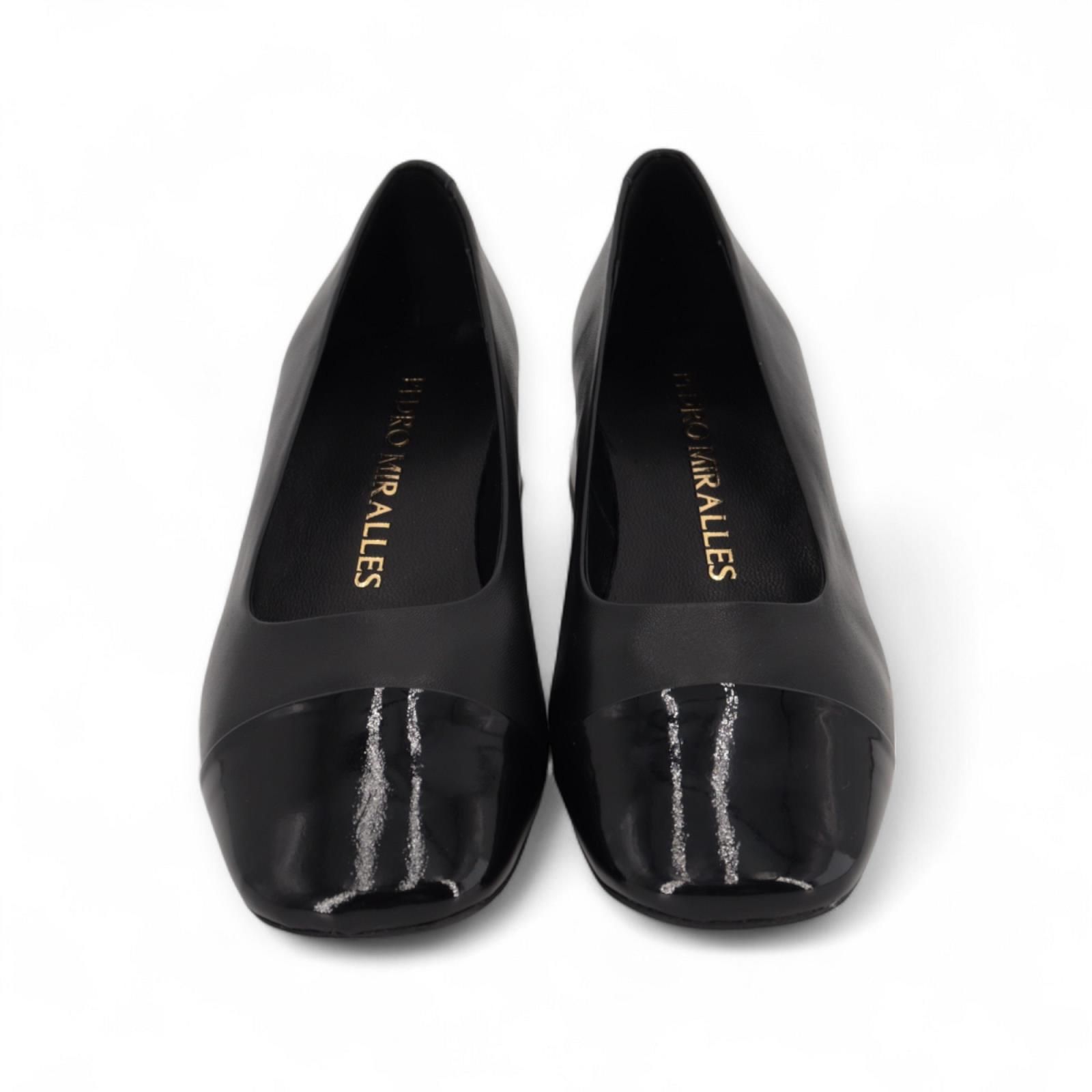 Ballerina van Pedro Miralles voor dames. Dit elegant ballerina model is in zwart leer met een carré top in zwart lak. Is op een blokhakje in lak van 3cm hoog.