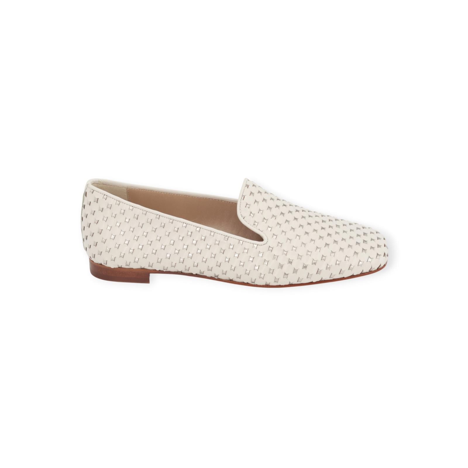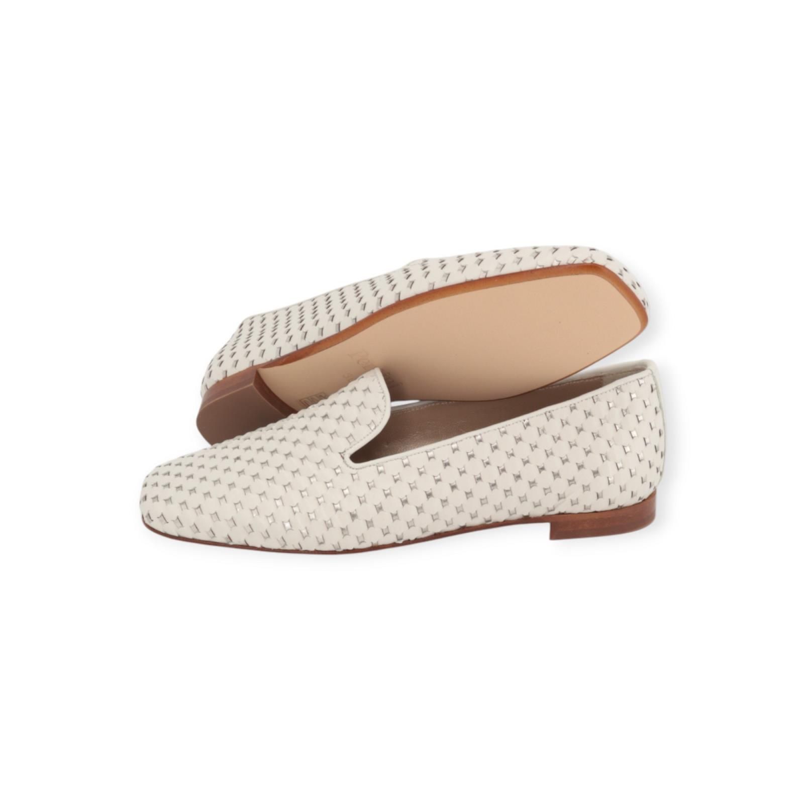 Mocassin van Pertini voor dames in off wit leer. Deze elegante mocassin is in geweven offwit leer met zilver metallic. Is op de wreef mooi uitgesneden aan de zijkant zodat hij makkelijk aantrekbaar is. Heeft een carré top met een fijn hieltje en een leren buitenzool.