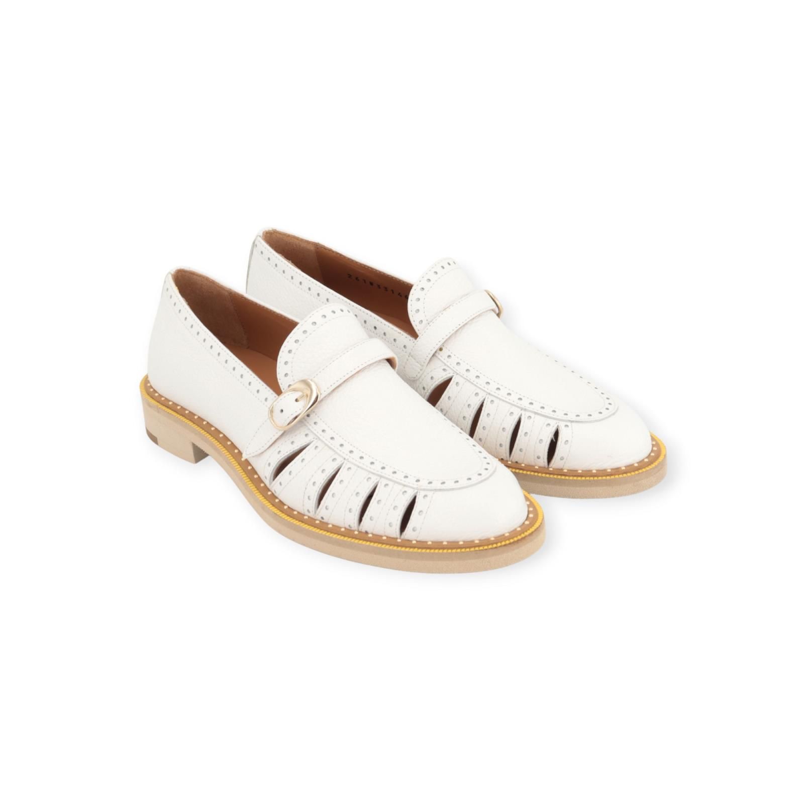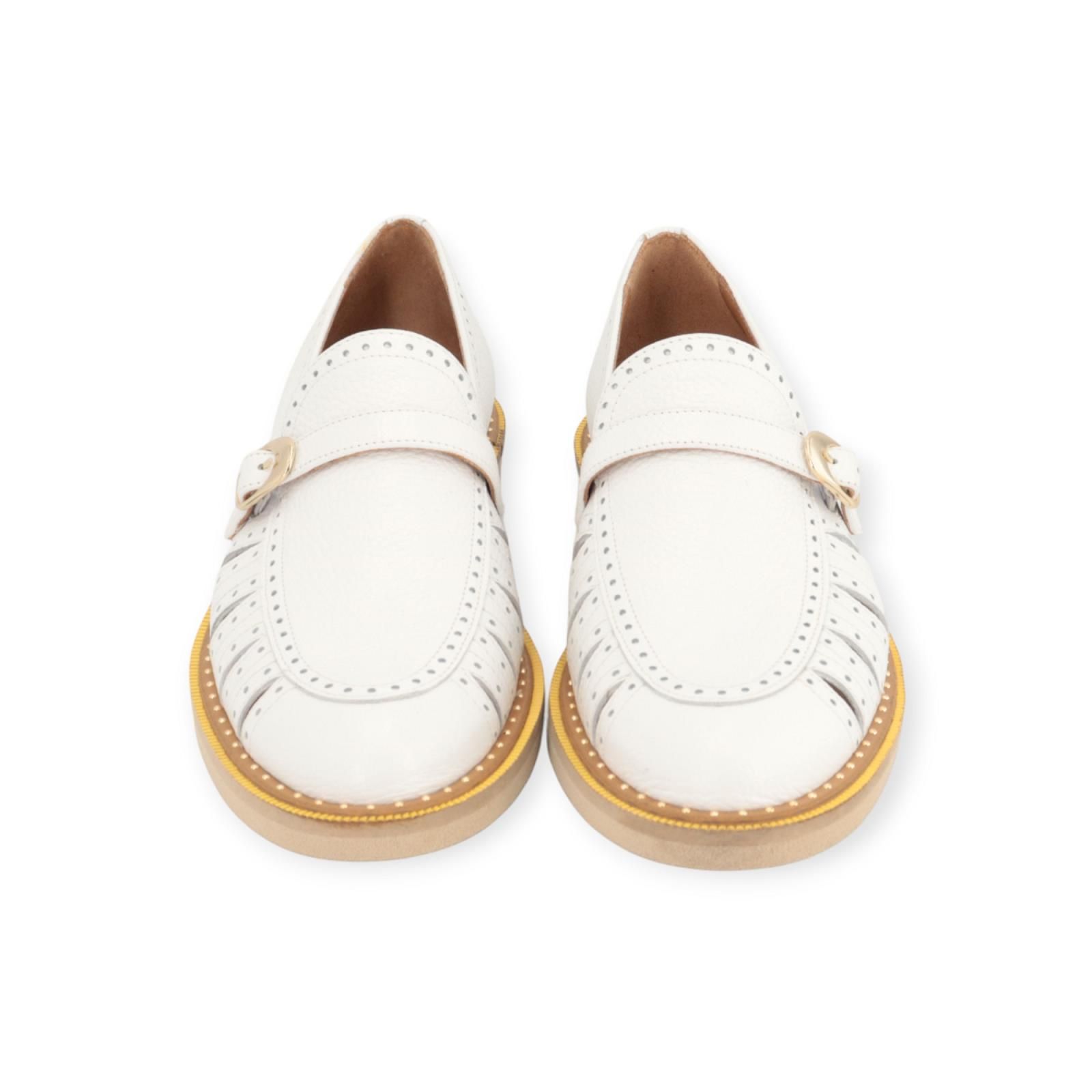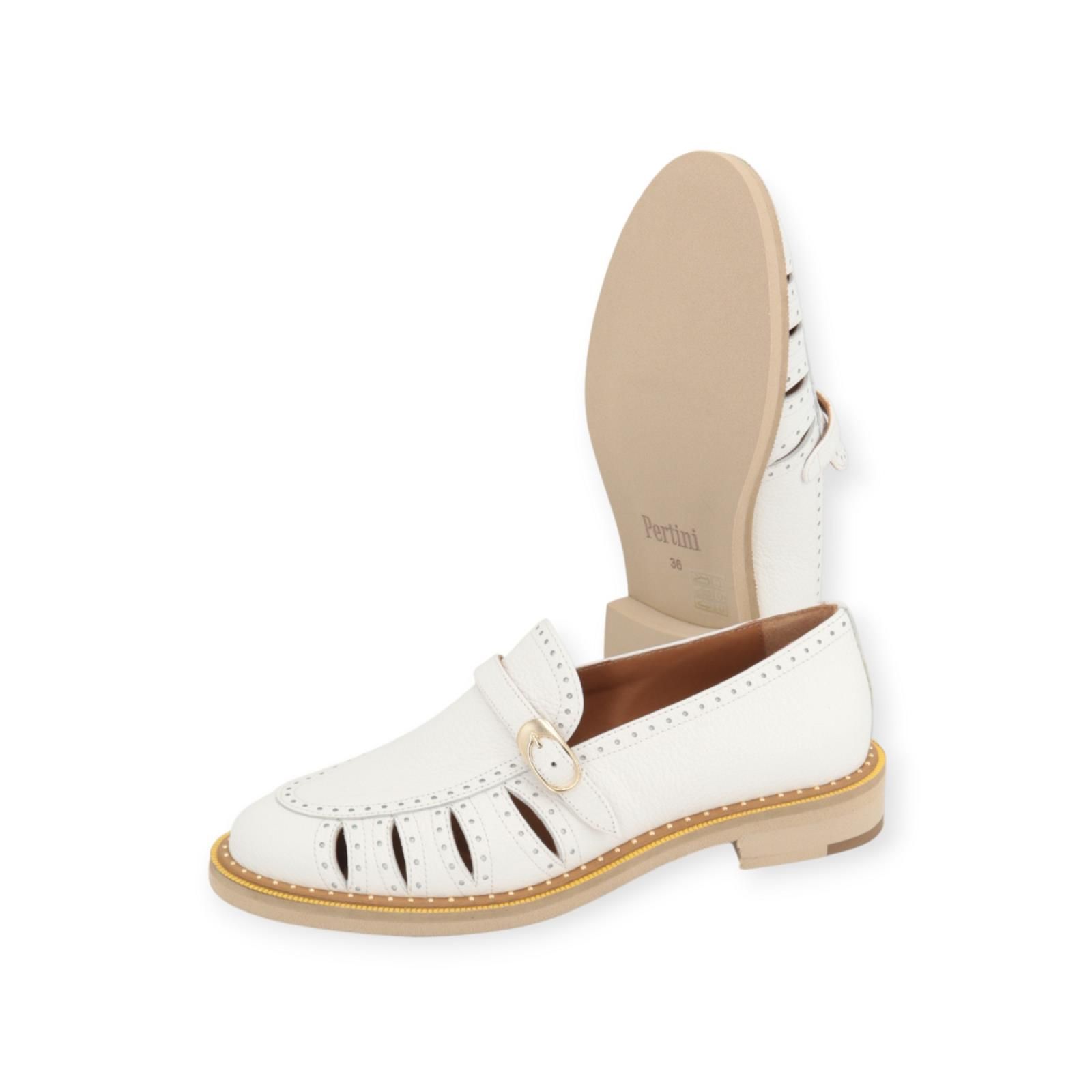 Mocassin van Pertini voor dames in wit leer. Deze mocassin is in wit leer en heeft een fijn bandje over de wreef met gouden gespsluiting. Is afgewerkt met studs rondom de schoen en zool. Is licht open langs de zijkant wat het model zeer uniek maakt. De buitenzool is omrand met cognac leer en gouden studs met een aangename microzool die zeer licht aanvoelt.