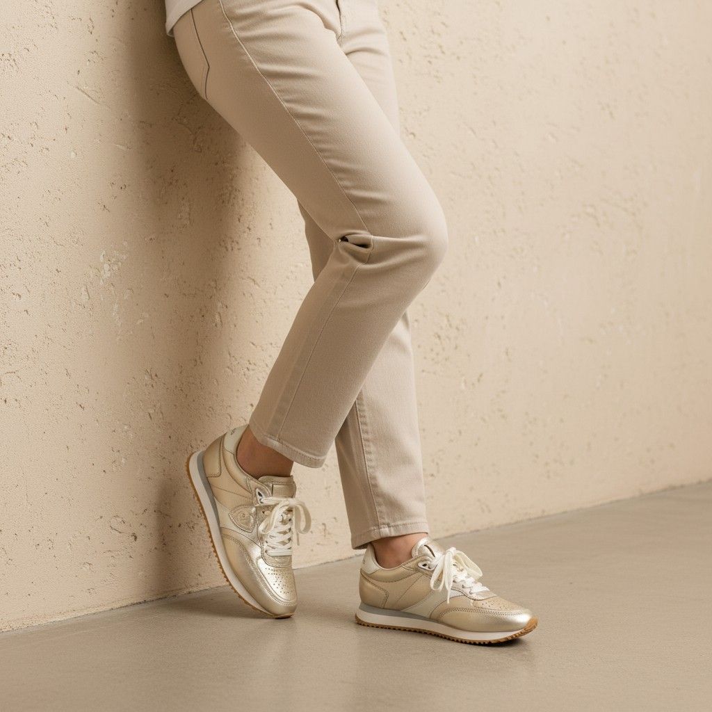 Sneaker Blville van Philippe Model voor dames. De nieuwste reeks Blville: ‘een klassieker met strakke lijnen en een krachtige identiteit’. Deze runner is ontworpen in goud metallic en wit leer. Heeft een genaaid reliëfembleem aan de zijkant en een geperforeerde neus. Is binnenin in badstof en leer met een uitneembare zool. De buitenzool is ultralicht en in microporeus rubber.