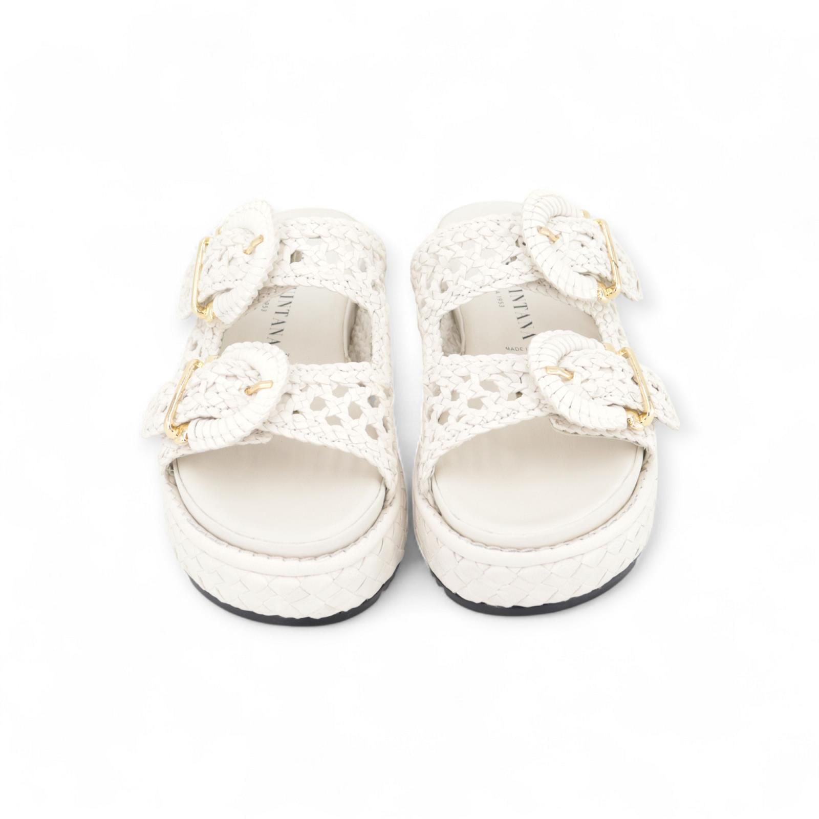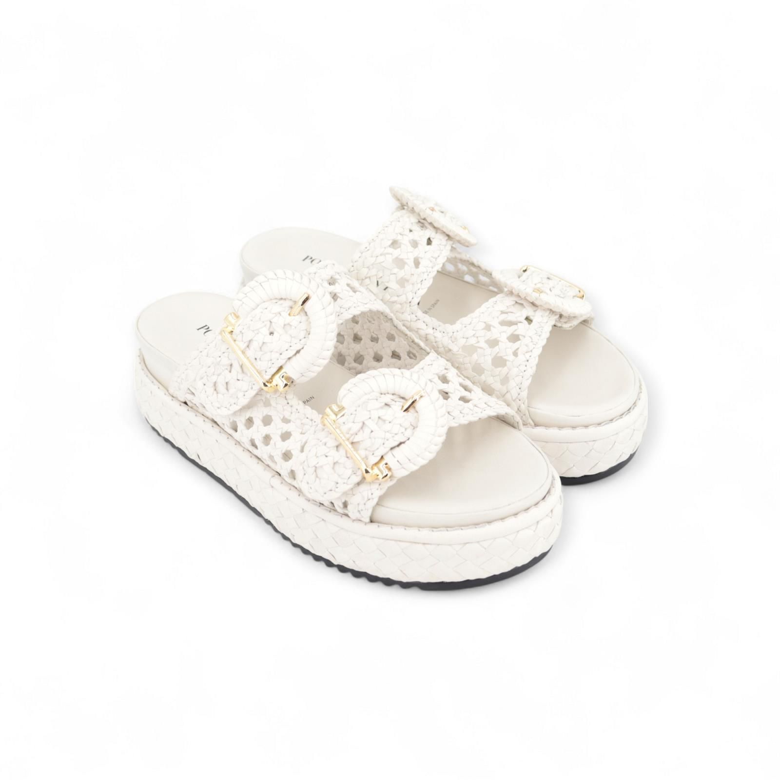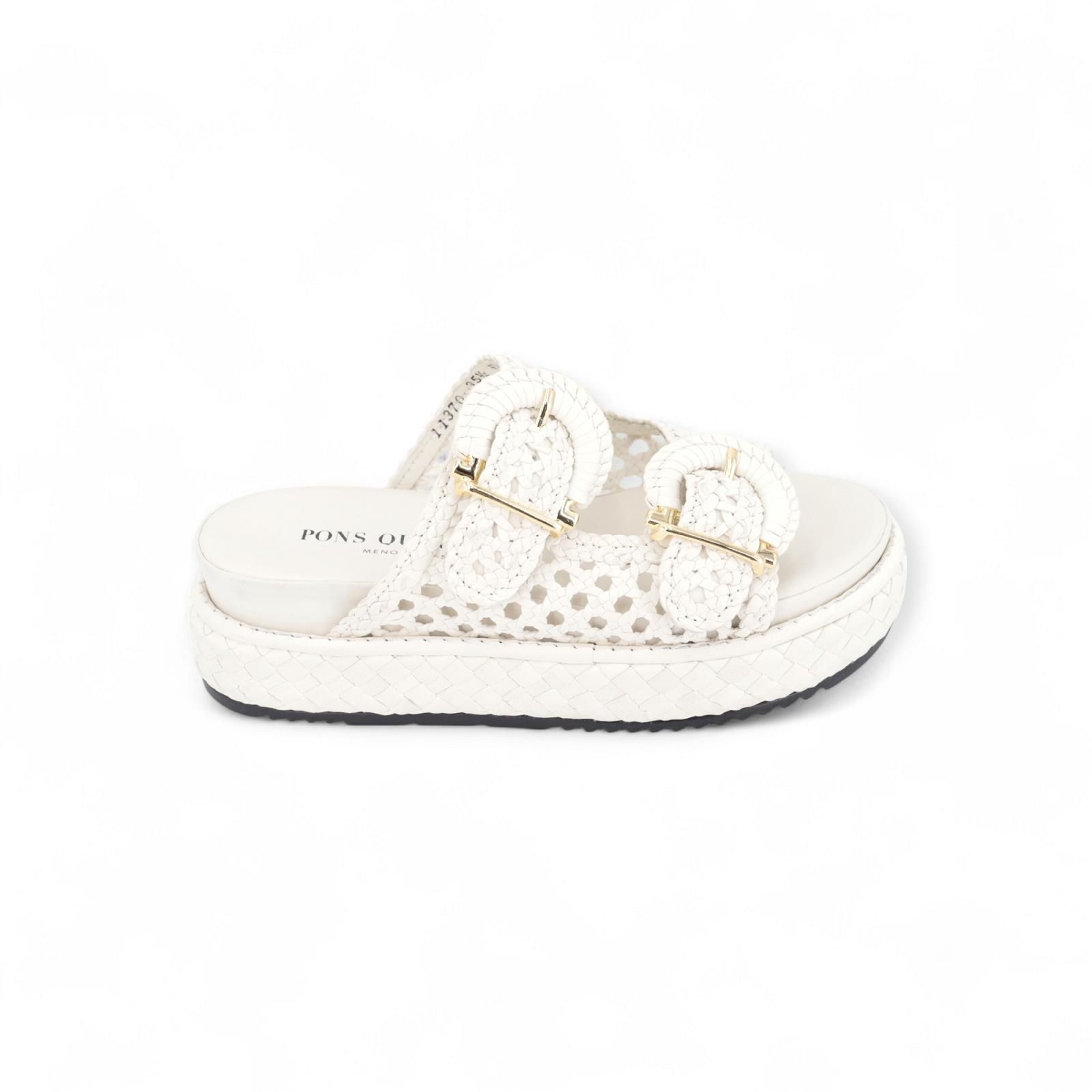 Pons Quintana Maika slipper voor dames. Deze slipper is op een plateauzool die mee gevlochten is. Heeft 2 banden over de wreef die je kan aanpassen naar breedte door de gespsluitingen. Is zeer mooi afgewerkt in wit vlechtwerk / tressée die geperforeerd is.