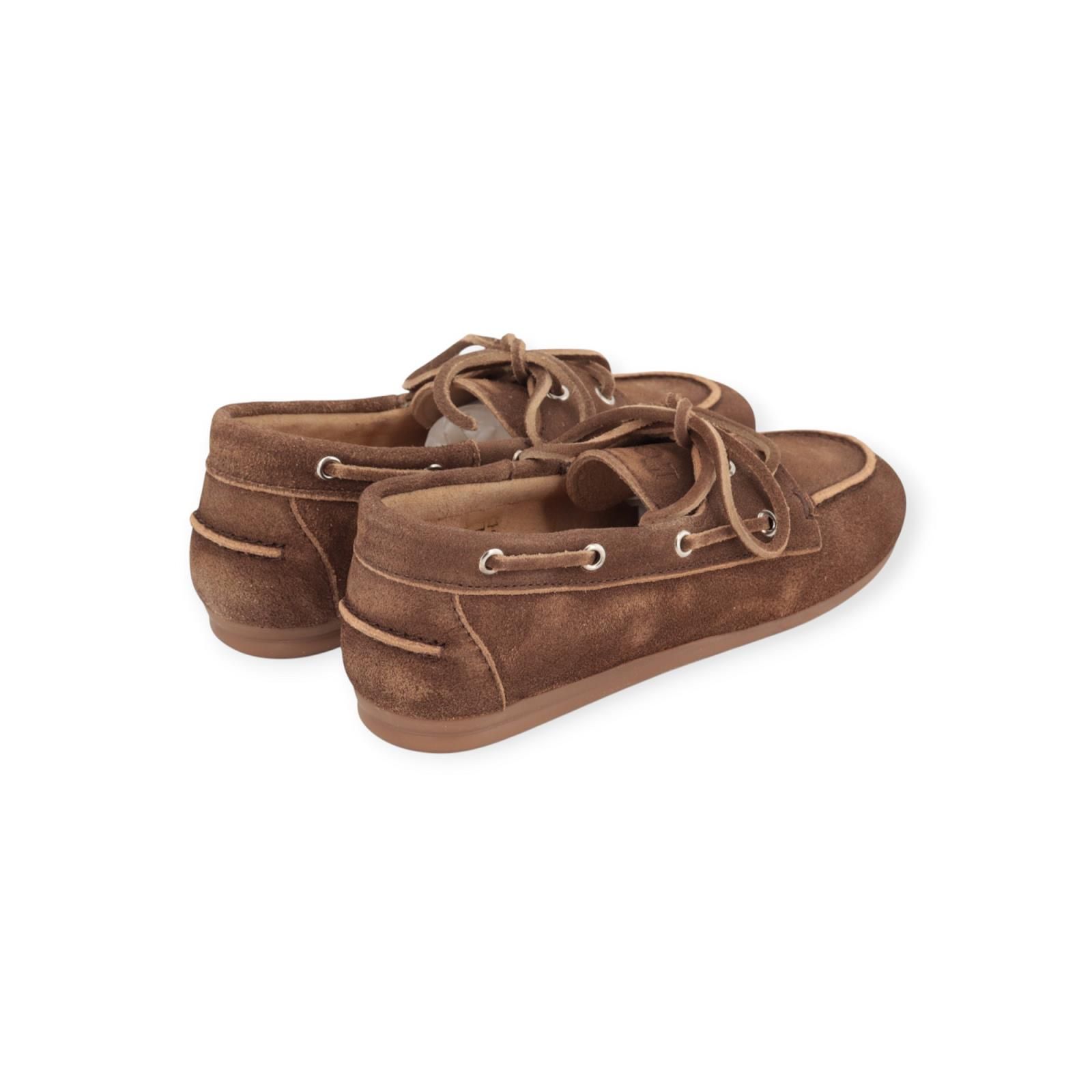 Mocassin Boat Loafer van Posa voor dames. Deze loafer is in bruin suède. Is met vetersluiting en omrand met veters en metalen oogjes. Deze typische bootschoen stijl is de trend voor deze zomer. Is op een aangename antislipzool. Combineer deze met de leuke rode veters om het model nog zomerser en trendy te maken