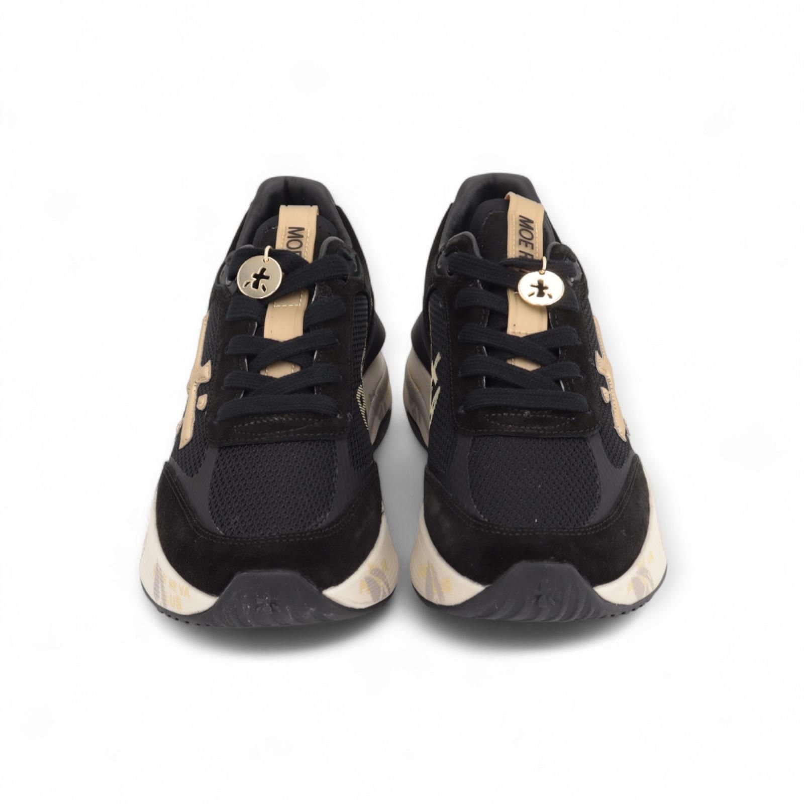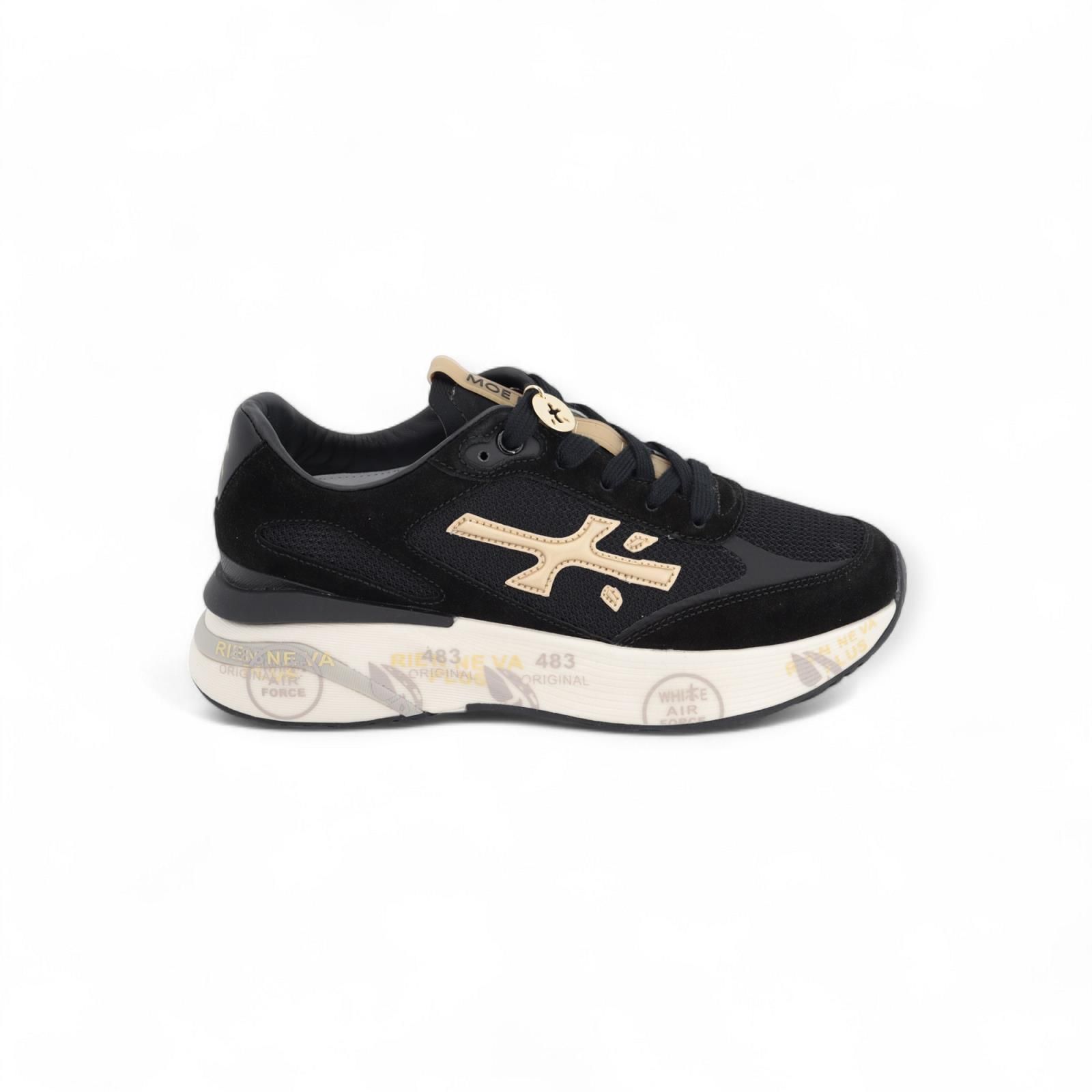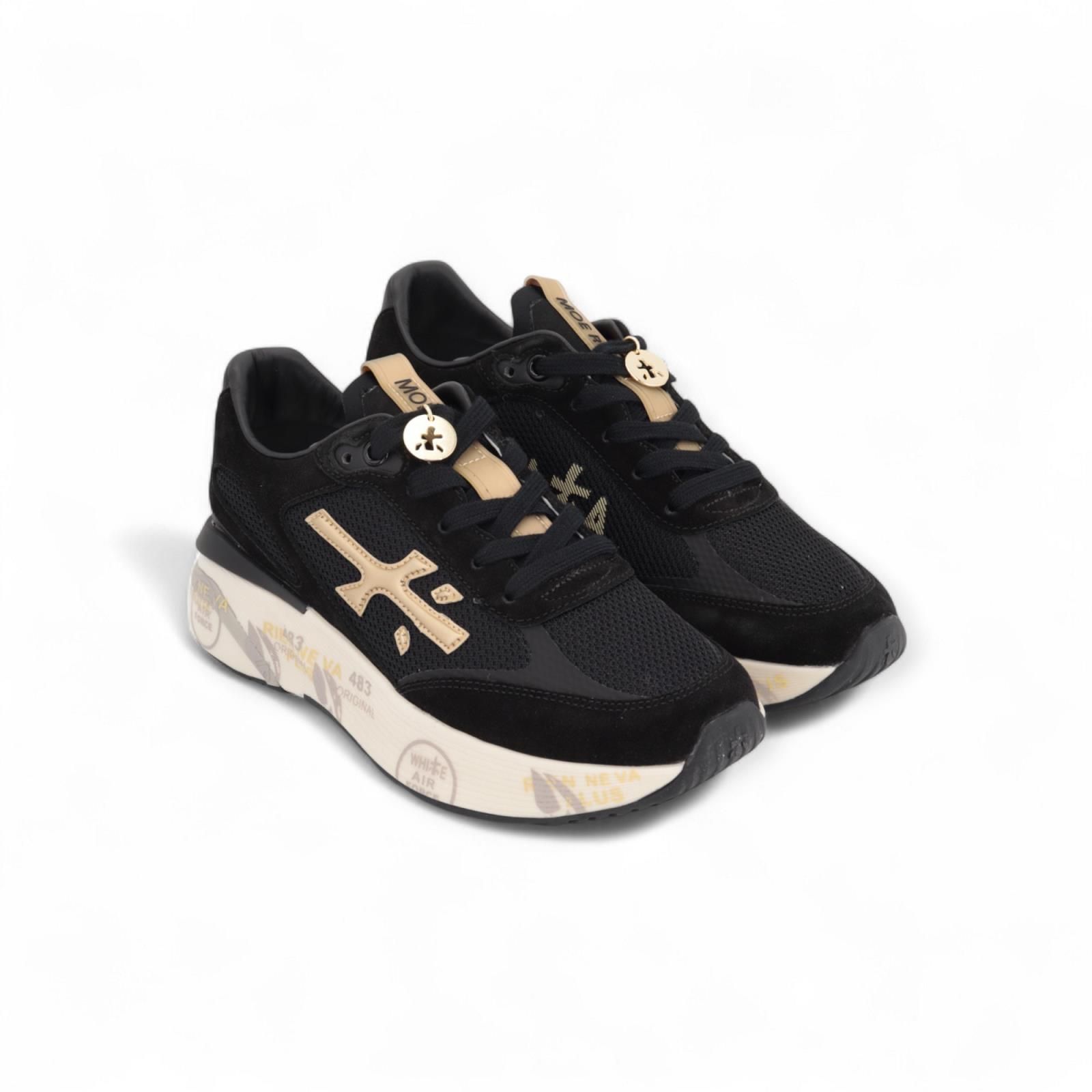 Sneaker Moerund var7799 van Premiata voor dames. Deze zwarte sneaker is ontworpen in mesh met suède. De Moerund is gebaseerd op de lichtheid van beweging, stabiliteit en het dempende gevoel dat de innovatieve onderkant biedt. Het nieuwe silhouet is rijk aan details: het gouden logo aan de buitenkant, PREMIATA-letters aan de binnenkant en modelnaam op het label. De binnenzool is uitneembaar.