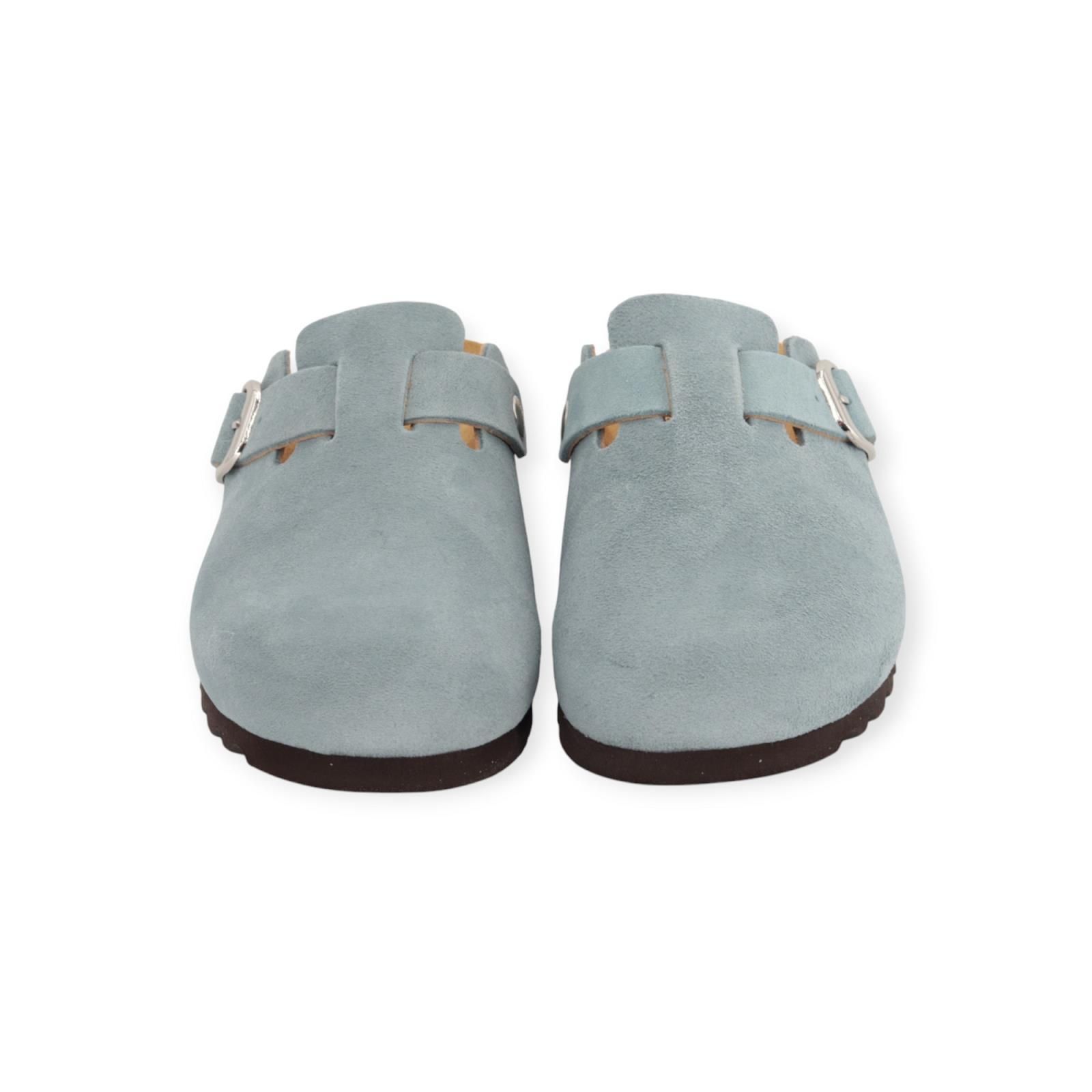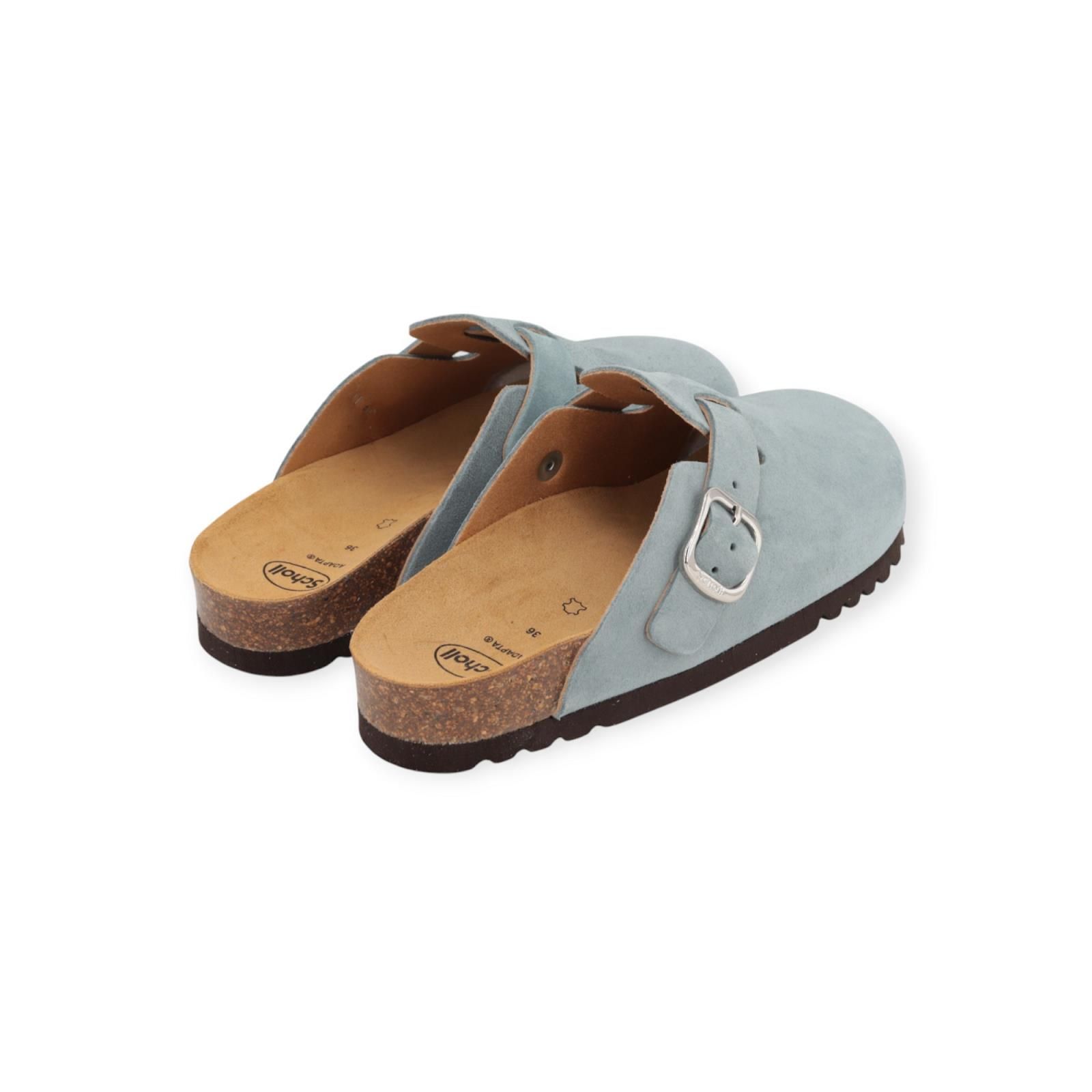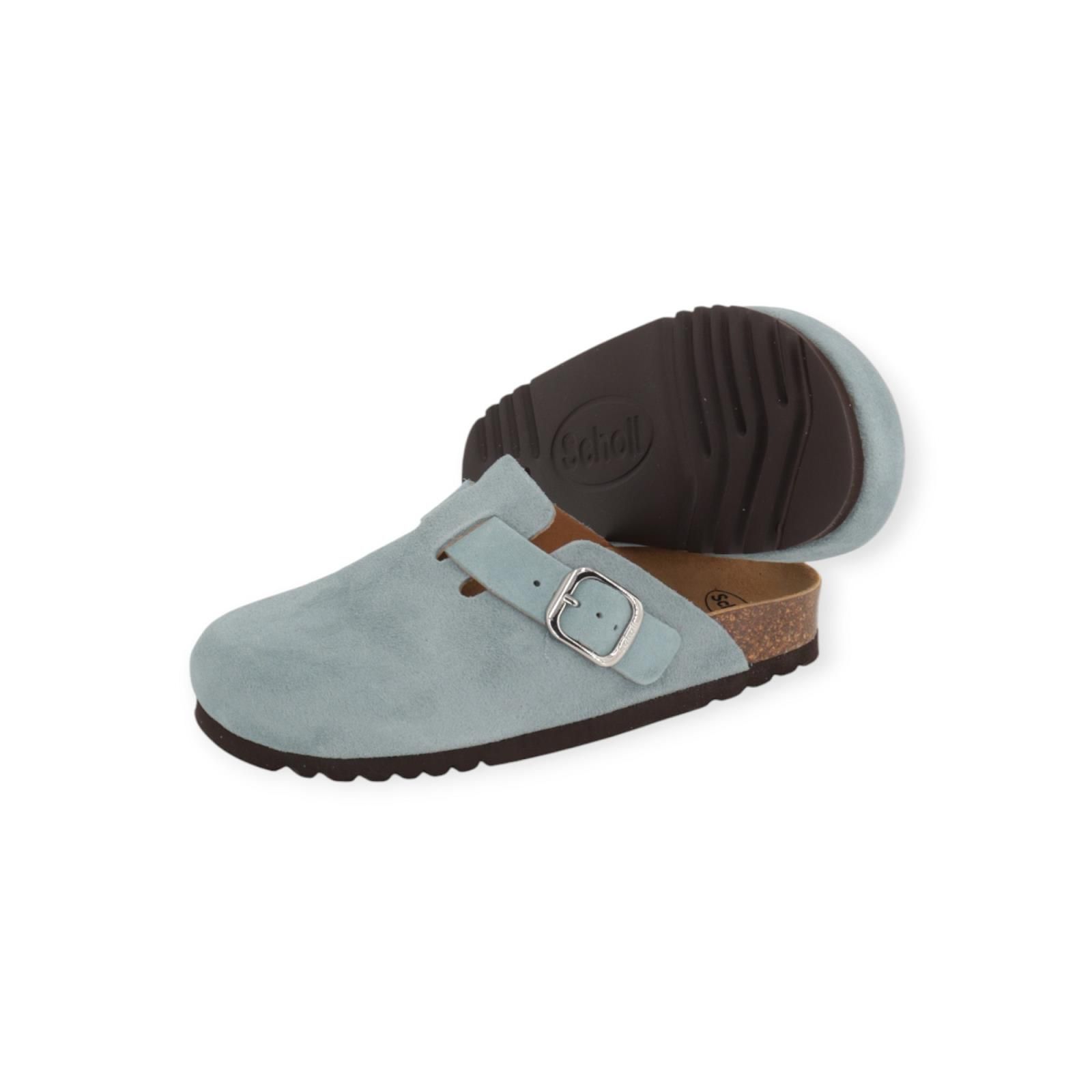 Slipper Fae van Scholl voor dames. Deze slipper is een feilloze samensmelting van mode en functionaliteit. De Fae is gemaakt in licht blauw suède met een verstelbare gesp. Biedt uitstekende flexibiliteit en lichtgewicht comfort. Heeft een ergonomisch voetbed op een donkere antislipzool.