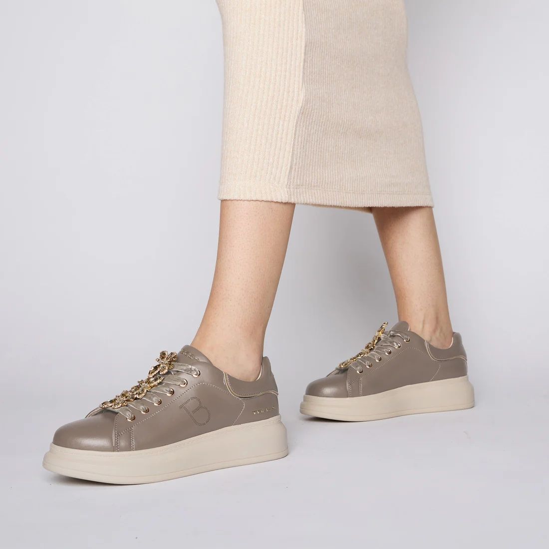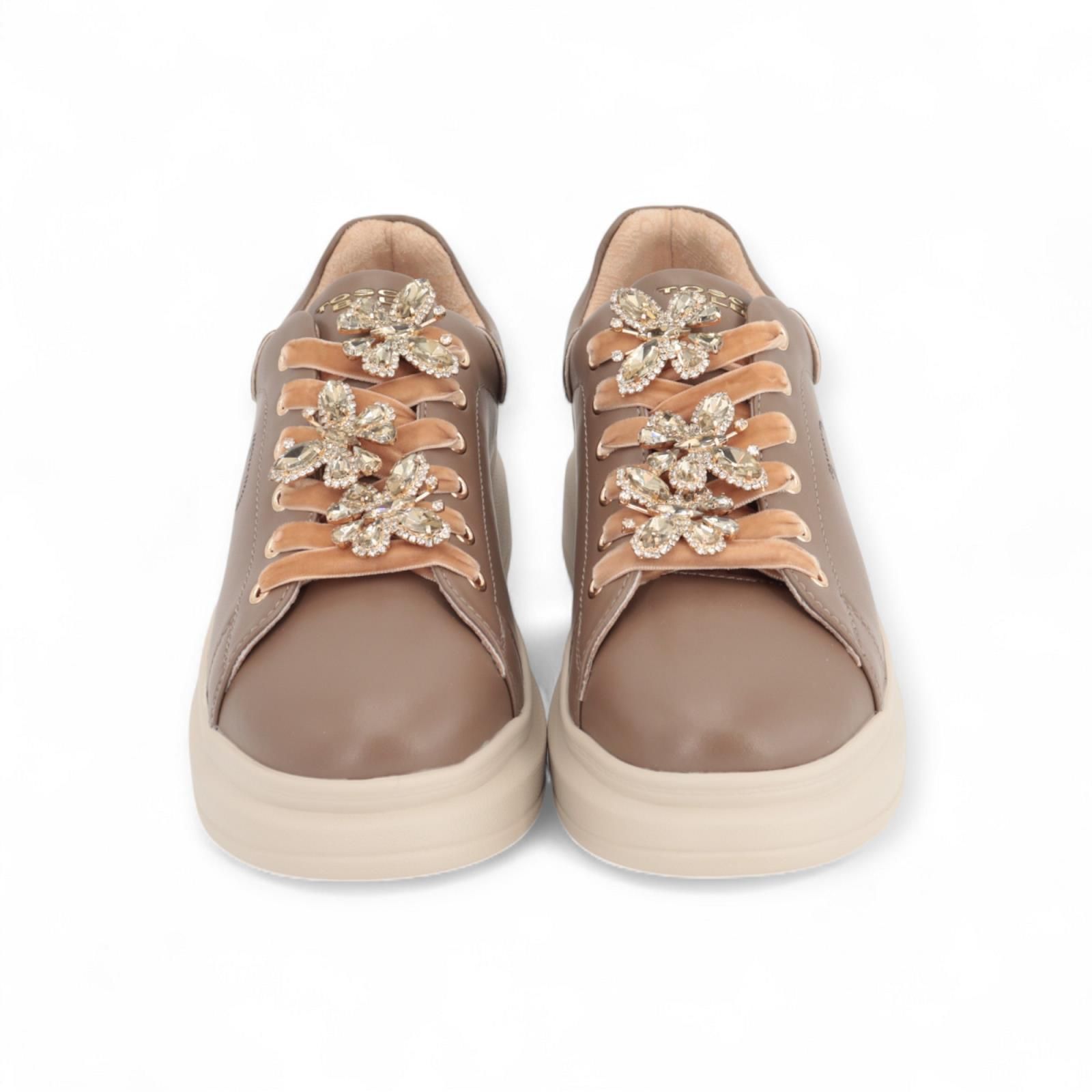 Sneaker Chic van Tosca Blu voor dames. Deze sneaker is in taupe leer met gouden afwerking. Heeft een geperforeerd logo aan de zijkant. De veters zijn in camel kleur versierd met elegante gouden details van vlinders die afneembaar zijn. Is op een plateauzool en de binnenzool is uitneembaar.