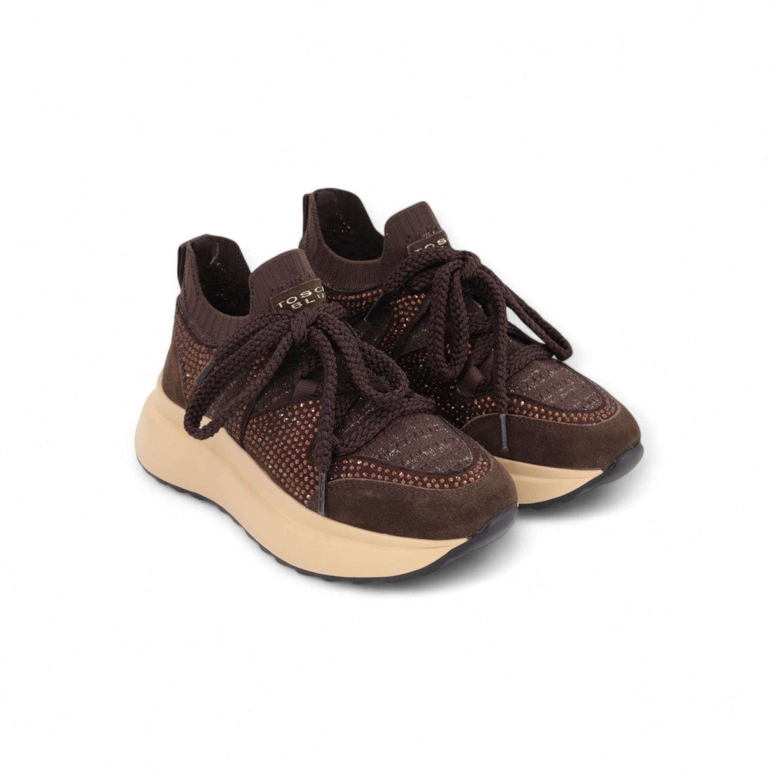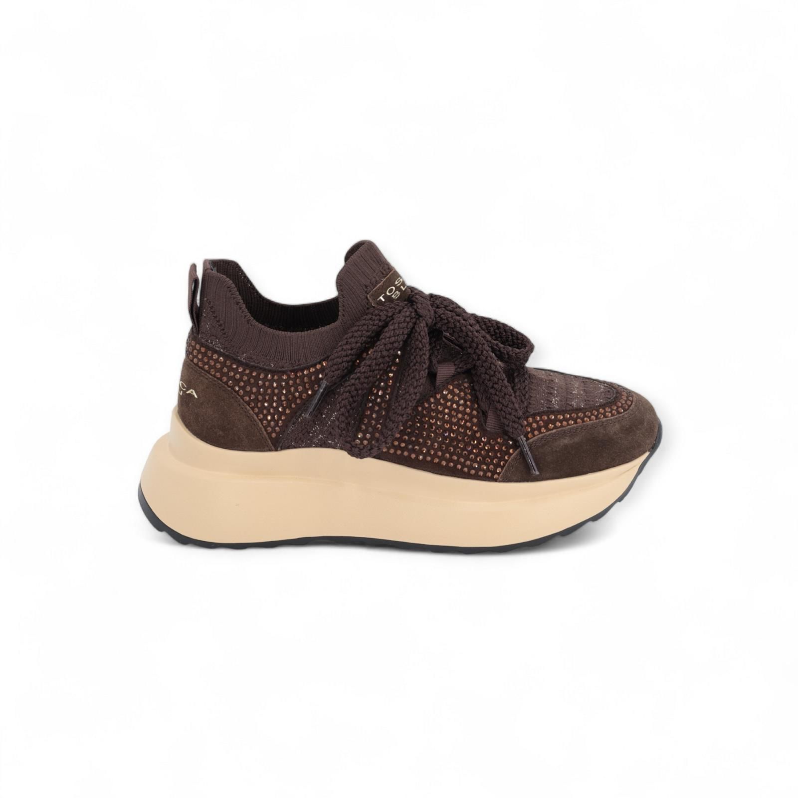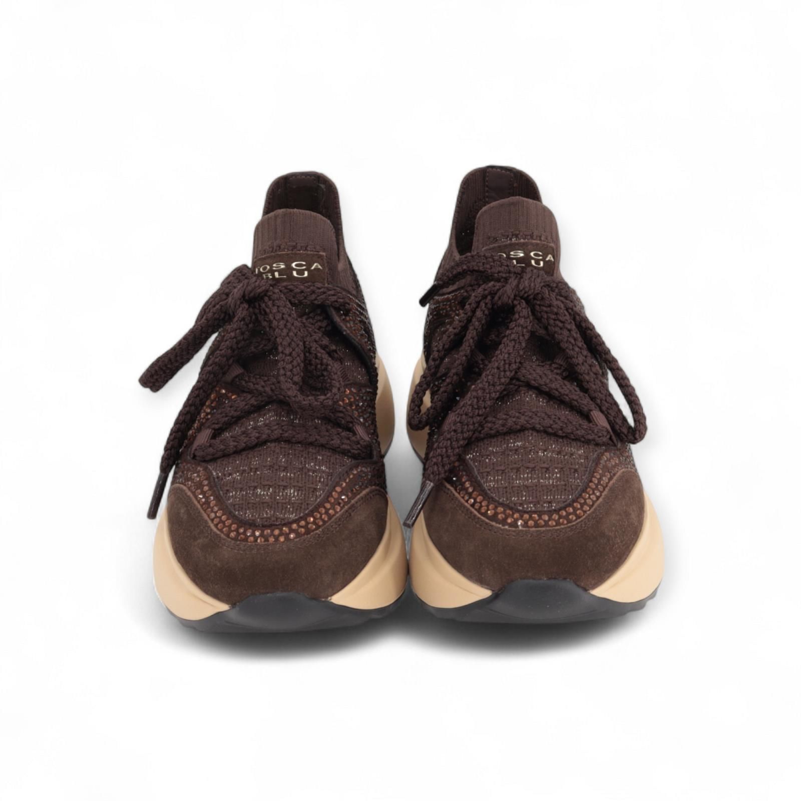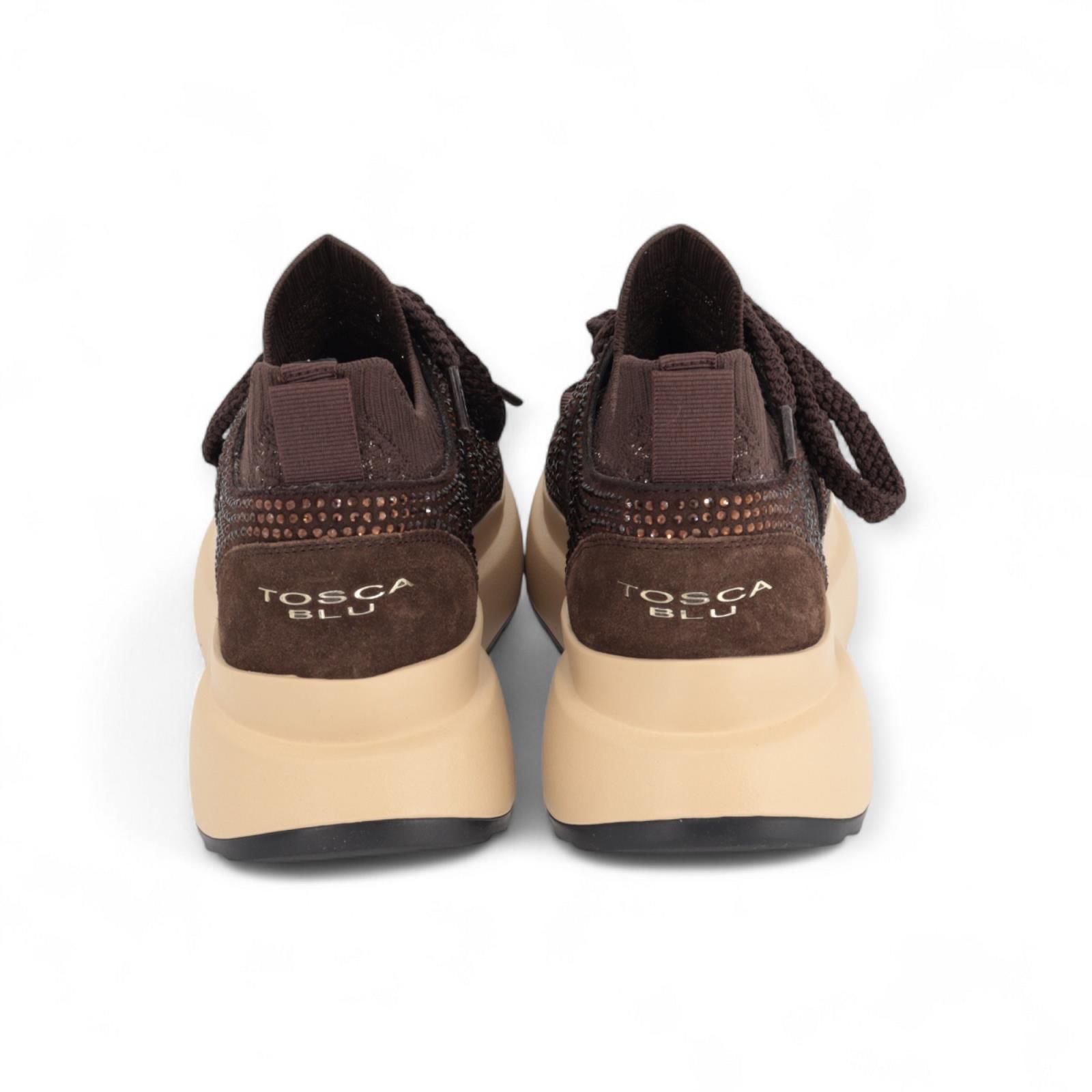 Sneaker Chill Out van Tosca Blu voor dames. Deze sneaker is uitgevoerd in een elegante contrasterende bruin beige combinatie. Maken een mooie indruk door hun bovenwerk van bruin suède met stof. De brede veters passen perfect en de bruine strasssteentjes maken het model nog vrouwelijker. Is makkelijk aantrekbaar door de stretchstof bovenaan. Heeft een plateauzool die aangenaam licht is met een uitneembare binnenzool.