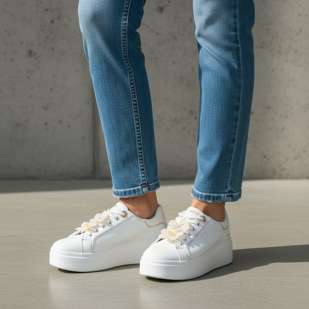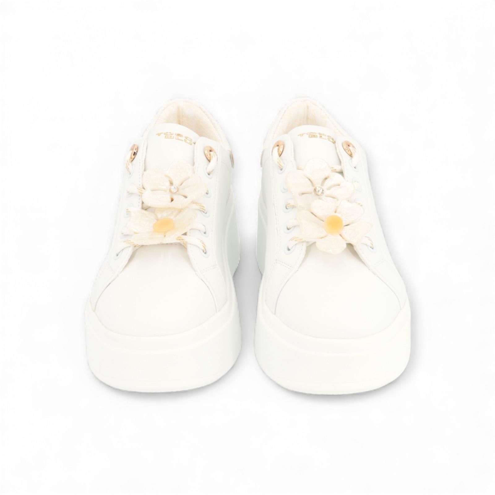 Sneaker Clara van Tosca Blu voor dames. Deze sneaker is in wit leer met gouden details. Heeft aan de zijkanten logo TB geperforeerd. De veters zijn afgewerkt met prachtige accessoires bloemetjes (accessoire is afneembaar) . Is op een plateauzool met een uitneembare binnenzool.