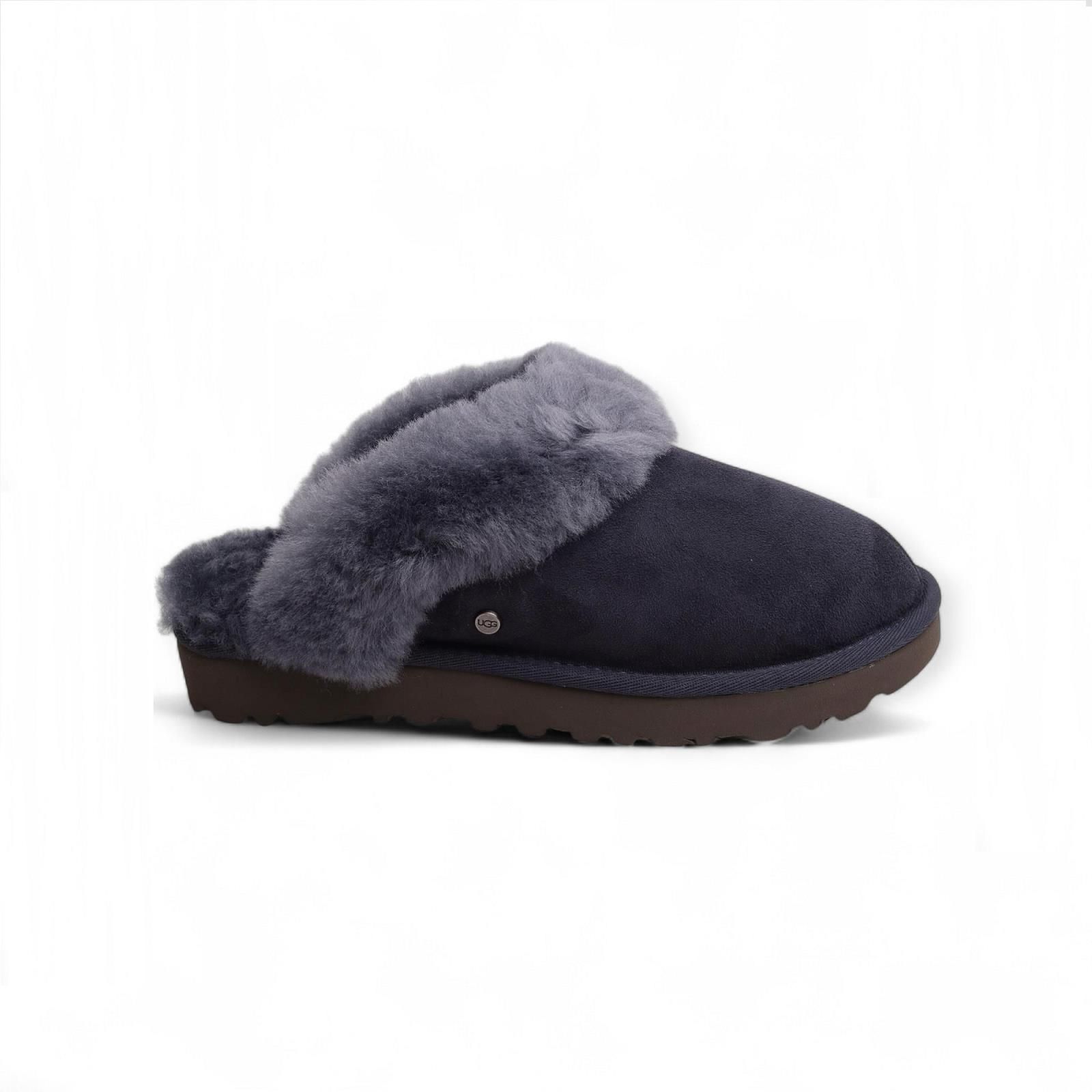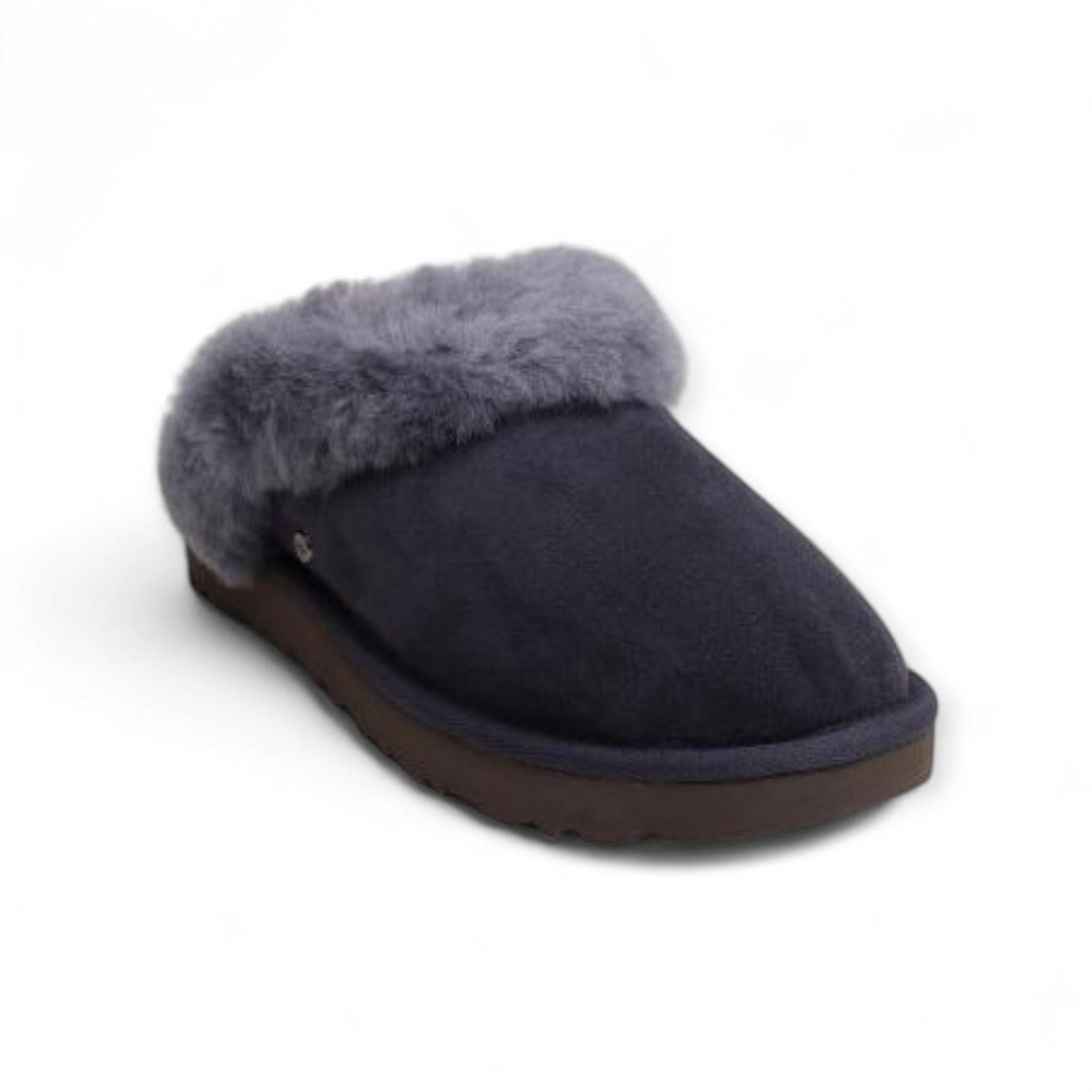 Pantoffel Classic Slipper van Ugg voor dames. Deze pantoffel is de topper bij dames. Is in blauw suède met zachte wol bovenaan. Hij is gevoerd met een warm wol. Heeft een dikke buitenzool die voor een goeie grip, antislip en demping zorgt afgewerkt met een stoffen bies rond de zool.