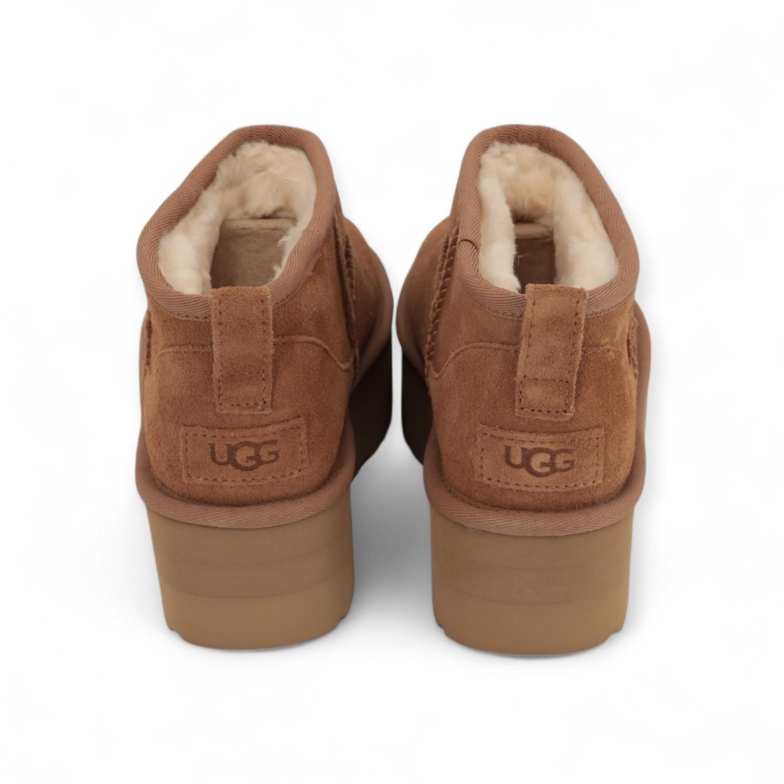 Enkellaars Classic ultra mini Platform van UGG voor dames. Deze populaire Ugg boots zijn in cognac suède met een coole plateauzool en een iets lagere schacht. Is aan de binnenkant gevoerd met wol en de buitenzool is in antislip en een goeie grip met demping.
