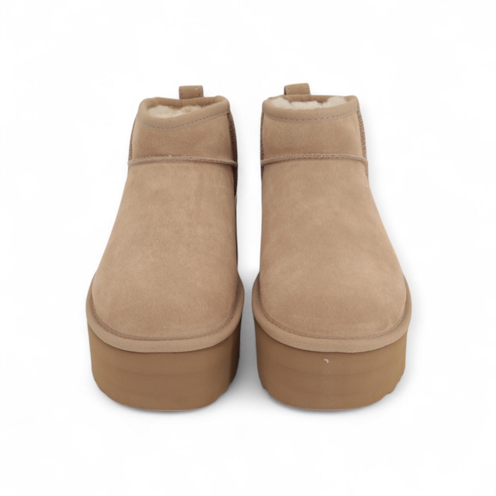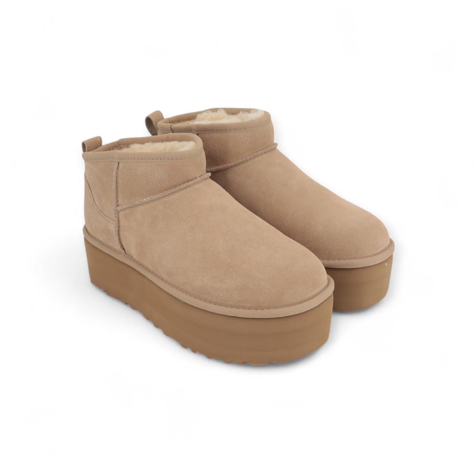 Enkellaars Classic ultra mini Platform van UGG voor dames. Deze populaire Ugg boots zijn in zand suède met een coole plateauzool en een iets lagere schacht. Is aan de binnenkant gevoerd met wol en de buitenzool is in antislip en een goeie grip met demping.