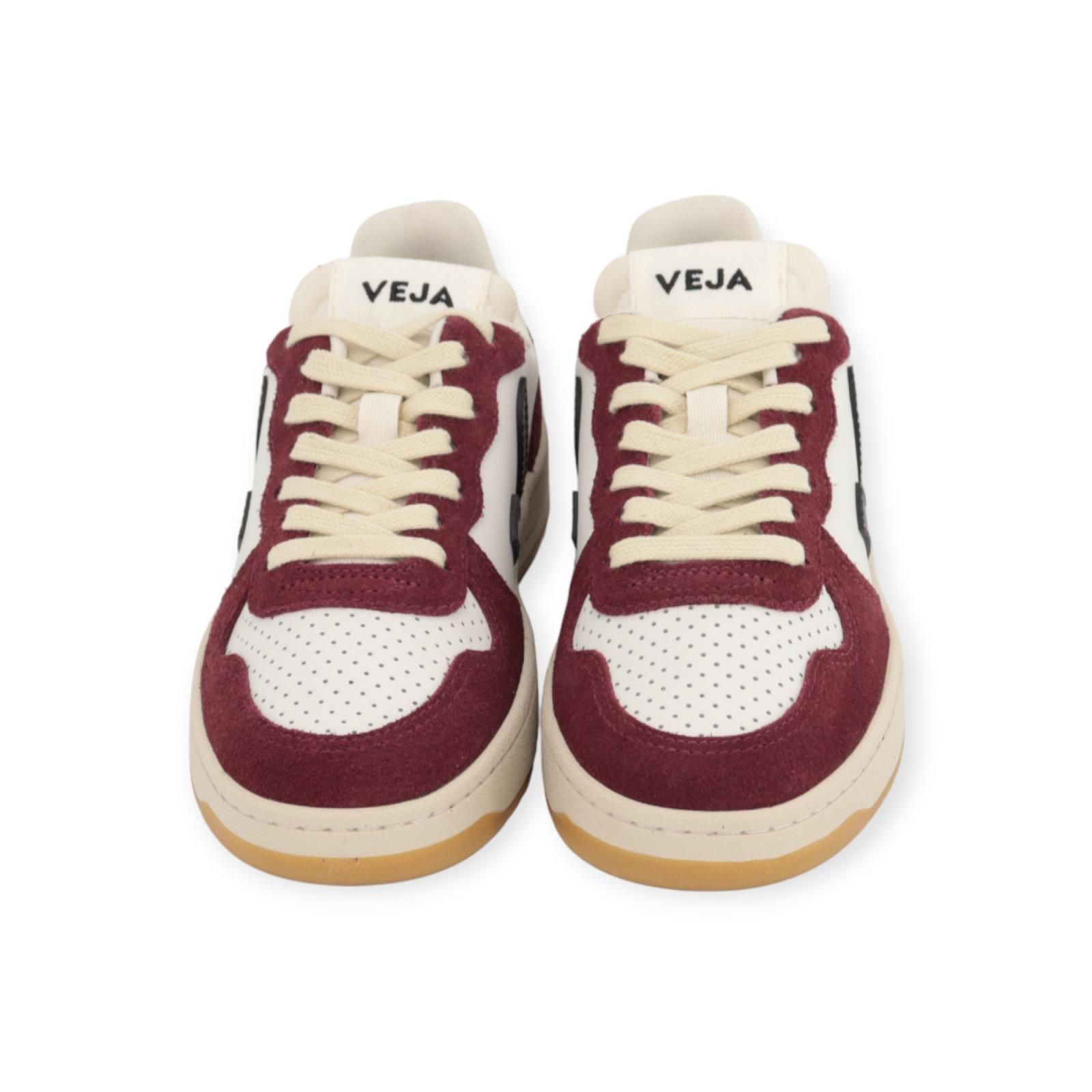 Sneaker V-10 van Veja voor dames. Deze sneaker is in wit leer met bordeaux suède. Heeft een zwarte hiellip en V logo aan de zijkanten. De neus is geperforeerd voor het model iets sportiever te maken. De voering in de schoen is van biologisch katoen en gerecycled polyster. De binnenzool van deze schoen is uitneembaar en de buitenzool is gemaakt van wild rubber. Dit model is de NR 1 bij Veja.