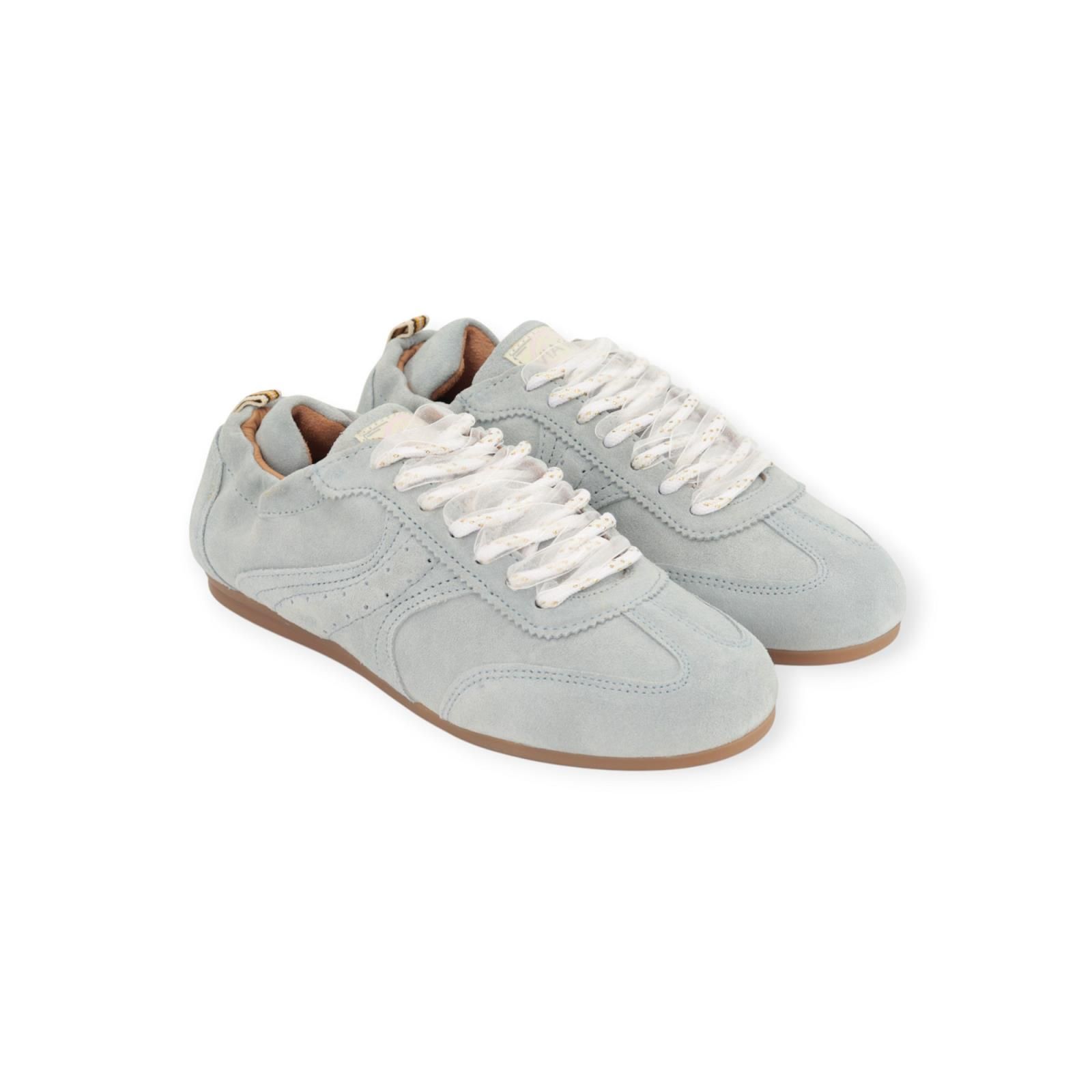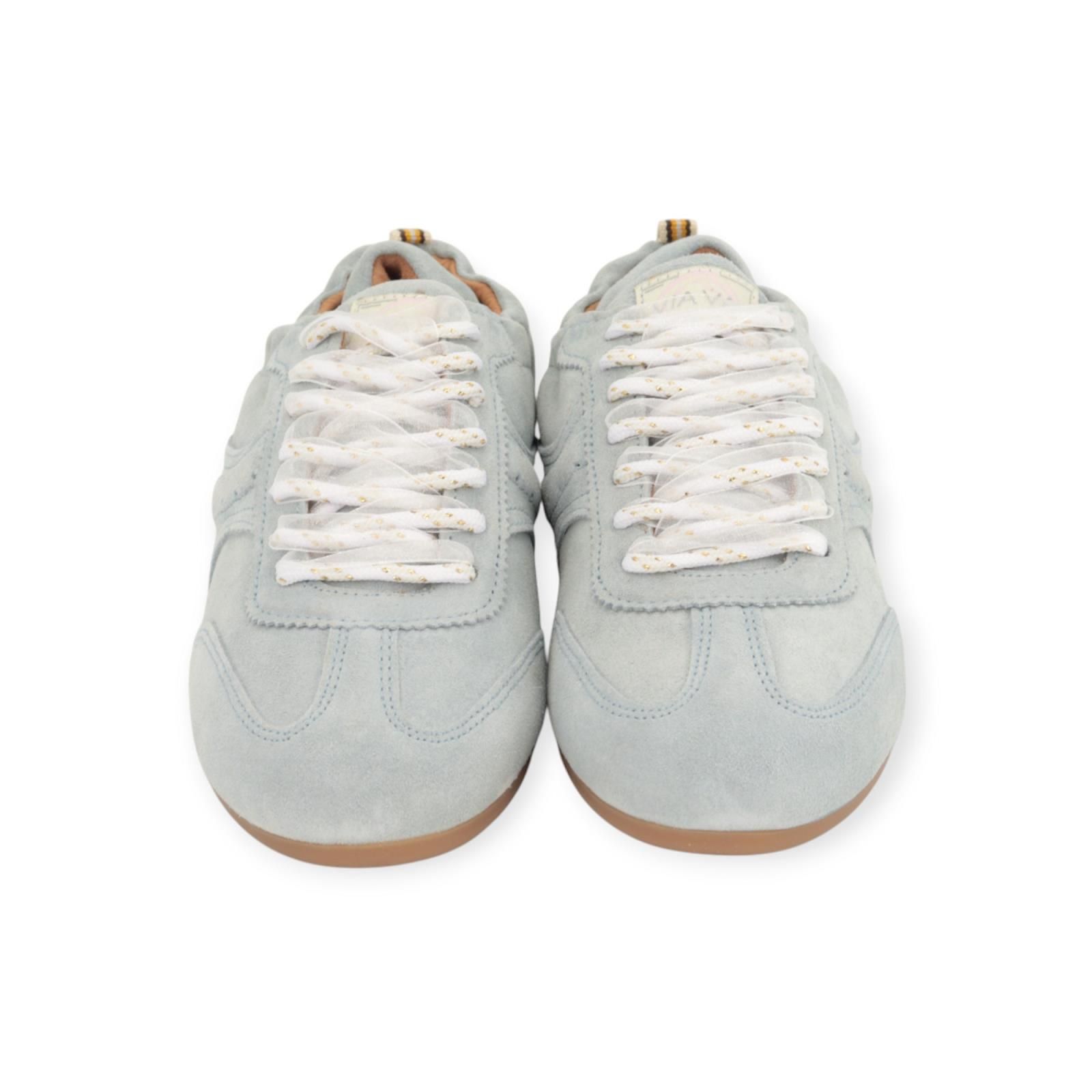 Sneaker June Haylee van Via Vai voor dames. Deze lage sneaker is in licht blauw suède, mooi afgewerkt met gekartelde stiksels en inzetstukken leer. Door het lage profiel oogt de schoen licht en verfijnd, perfect voor een nonchalante en casual stijl. Heeft een elastisch, padded hielstuk achteraan die voor nog meer comfort zorgt. De binnenzool is uitneembaar en is op een lage gummyzool. De veters zijn afgewerkt met een organza lint kan je mixen of apart dragen.