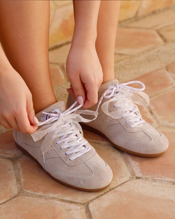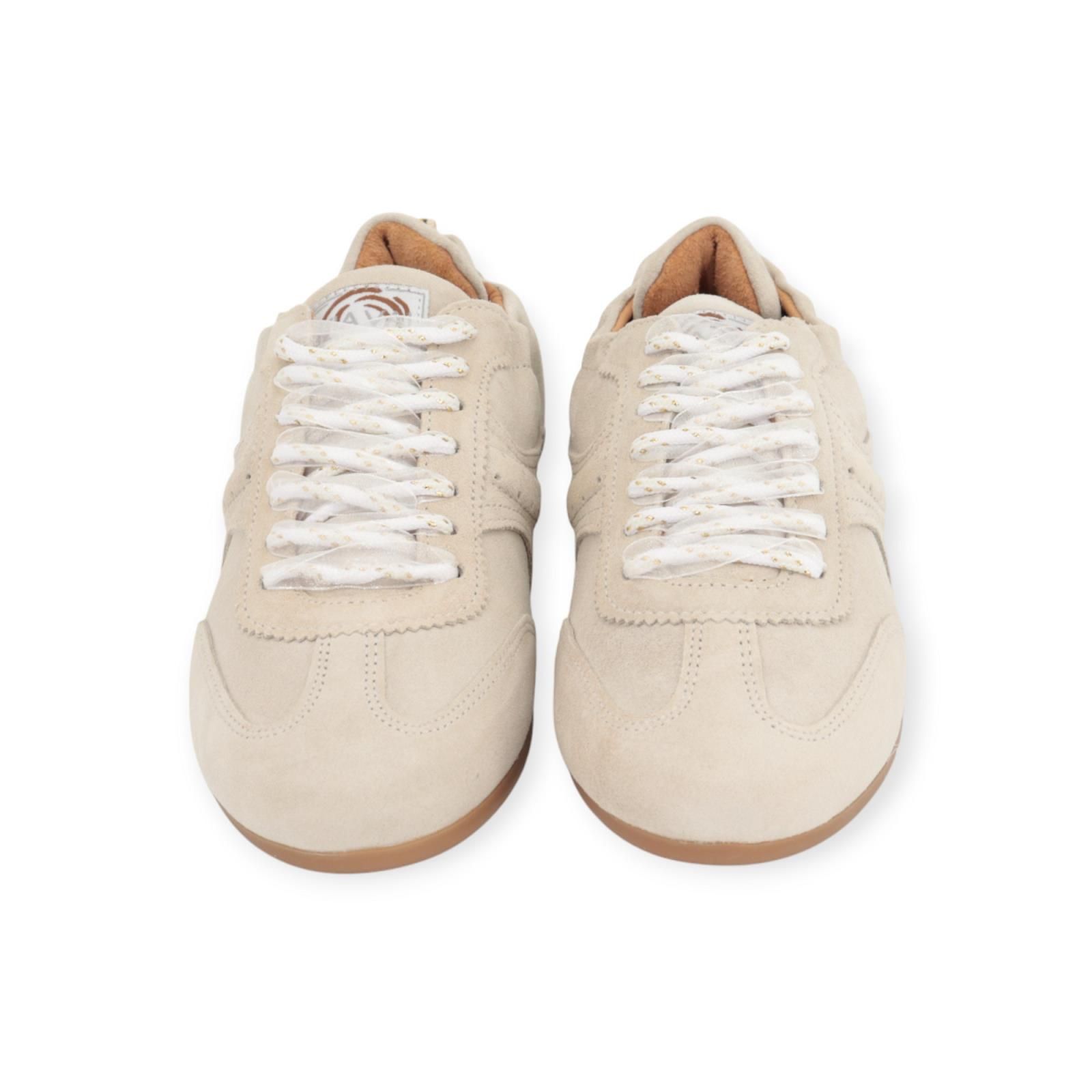 Sneaker June Haylee van Via Vai voor dames. Deze lage sneaker is in zand suède, mooi afgewerkt met gekartelde stiksels en inzetstukken leer. Door het lage profiel oogt de schoen licht en verfijnd, perfect voor een nonchalante en casual stijl. Heeft een elastisch, padded hielstuk achteraan die voor nog meer comfort zorgt. De binnenzool is uitneembaar en is op een lage gummyzool. De veters zijn afgewerkt met een organza lint kan je mixen of apart dragen.