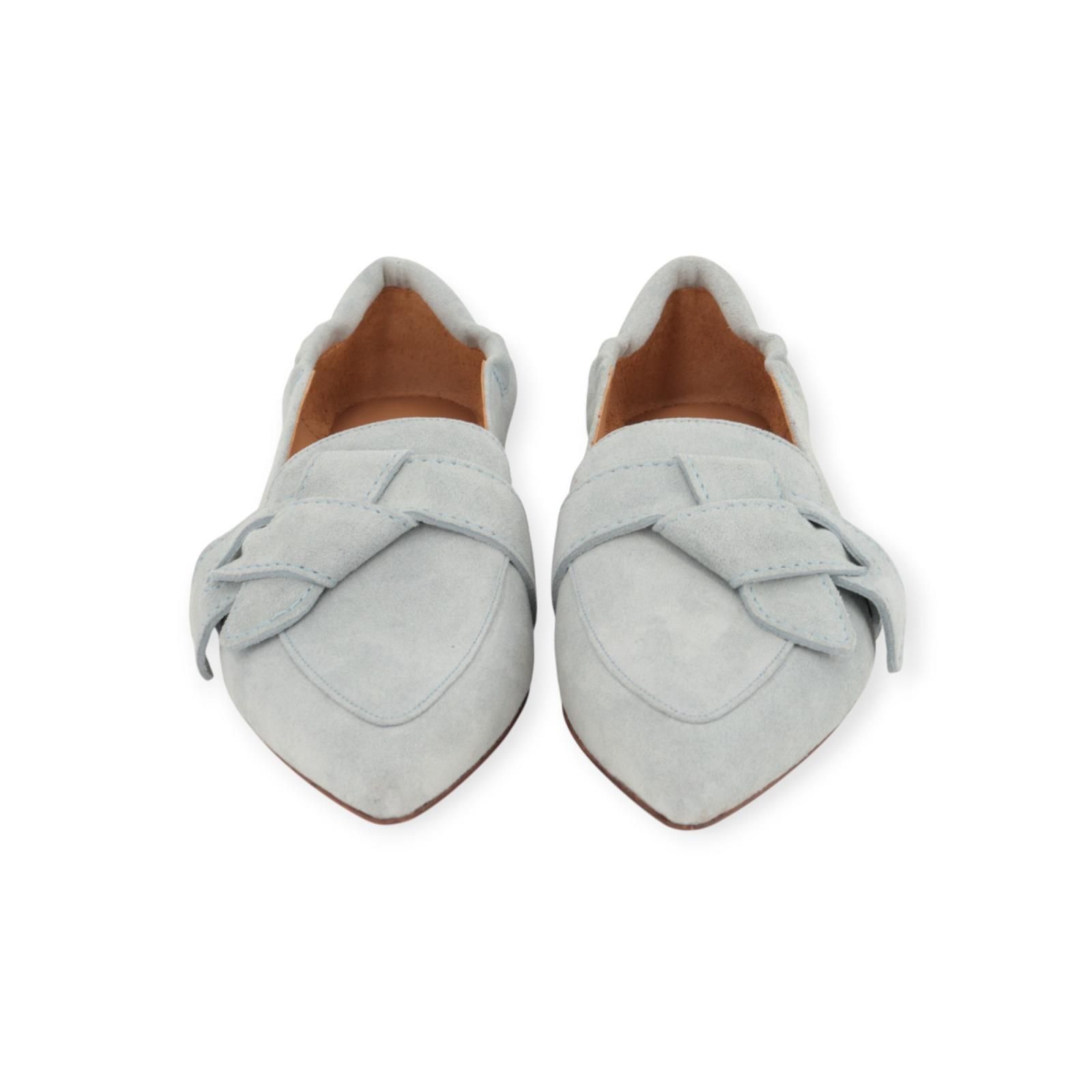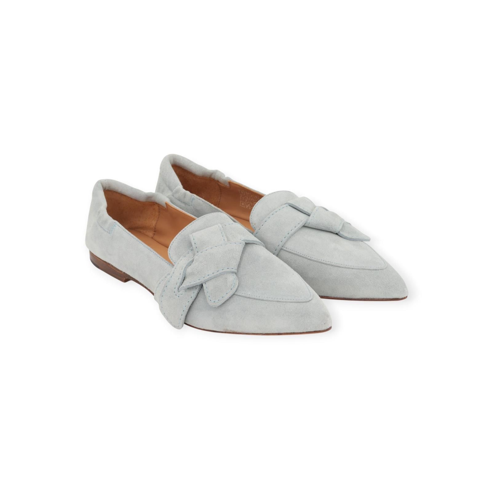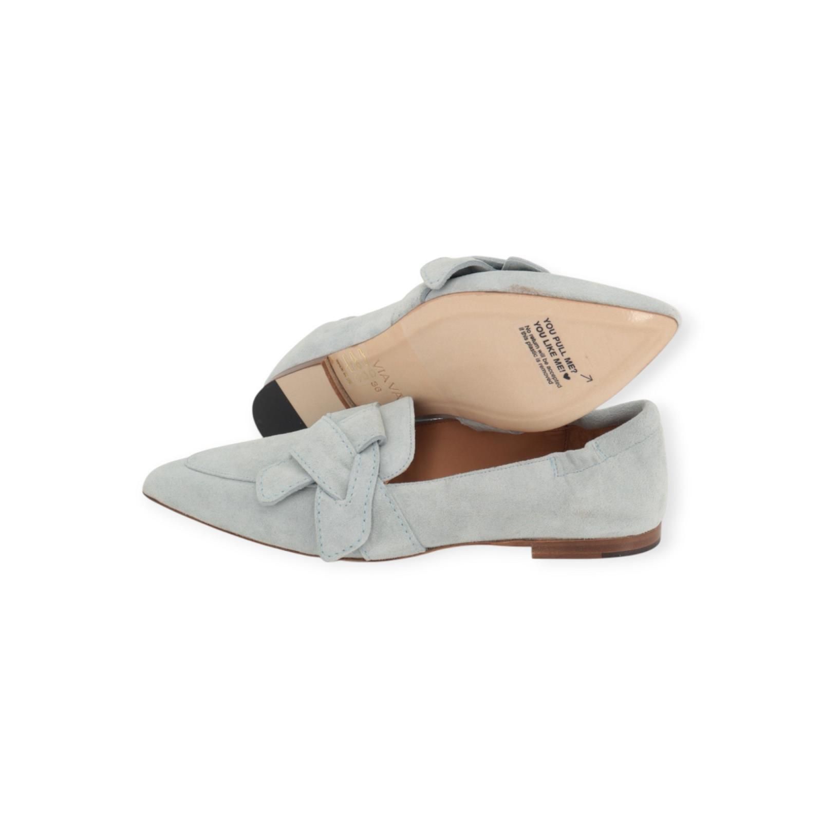 Mocassin Lola Rayne van Via Vai voor dames. Deze elegante mocassin is in lichtblauw suède. Heeft een scherpe neus met een elegante ‘knoop’ op de wreef. Heeft een elastische hiel en een foamed binnenzool die voor extra comfort zorgt. Deze loafers zijn elegant, stylish en klassevol.