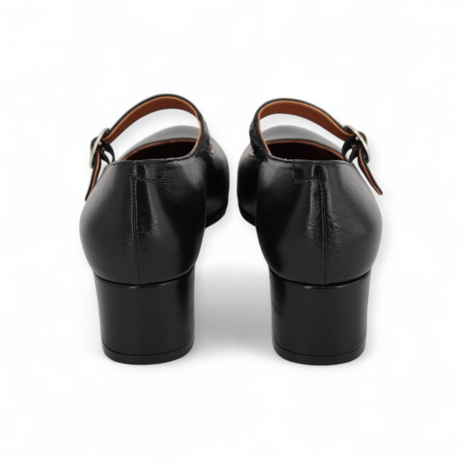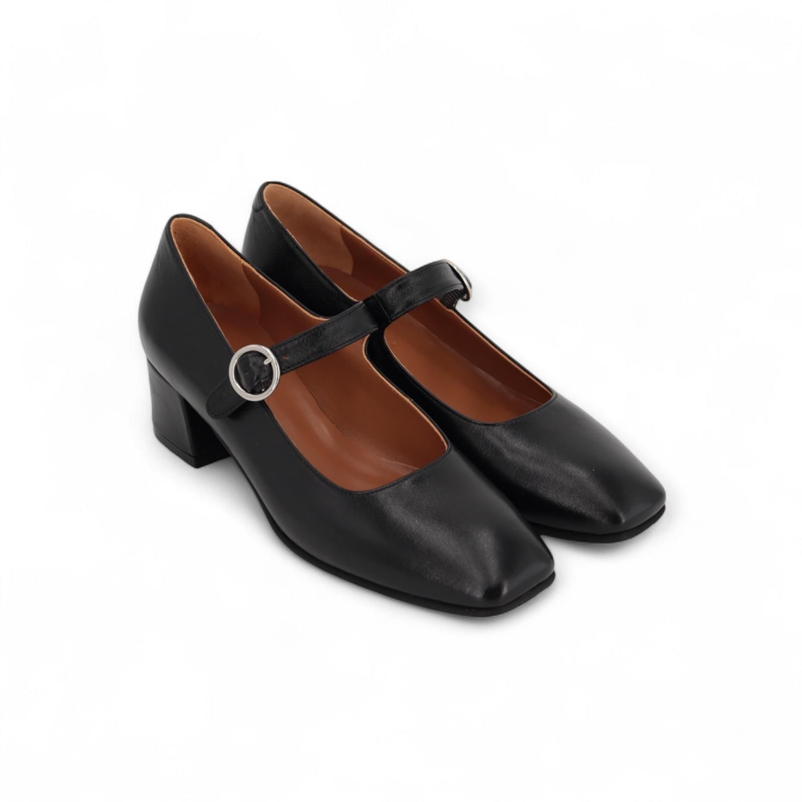 Pump LV439 van Voltan voor dames. Deze pump is in zwart leer met een carré top en een bandje over de wreef met metalen gespsluiting. Heeft een blokhakje van 5cm hoog en is op een antislip buitenzool. Straal klasse uit met deze Voltan pump.