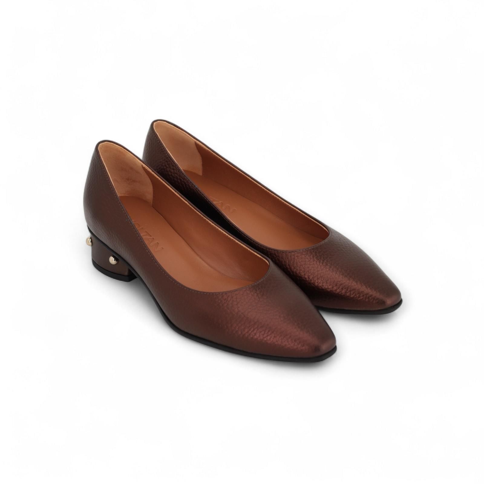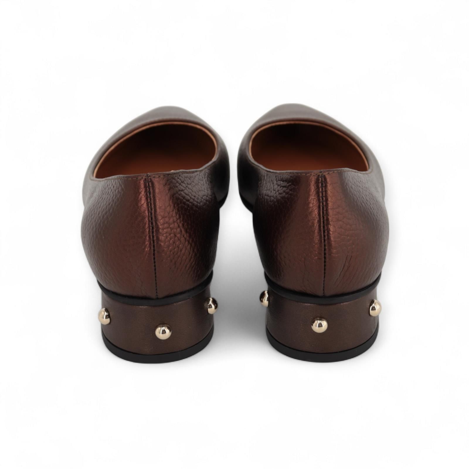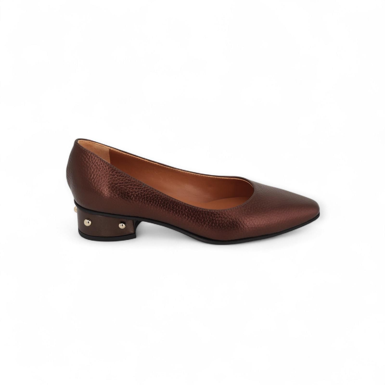 Pump LV442 van Voltan voor dames. Deze pump is in brons zacht leer met een licht scherpe top. Het hakje van 3,5cm hoog is afgewerkt met metalen studs die voor een echte eyecatcher zorgen. Is op een antislip buitenzool.