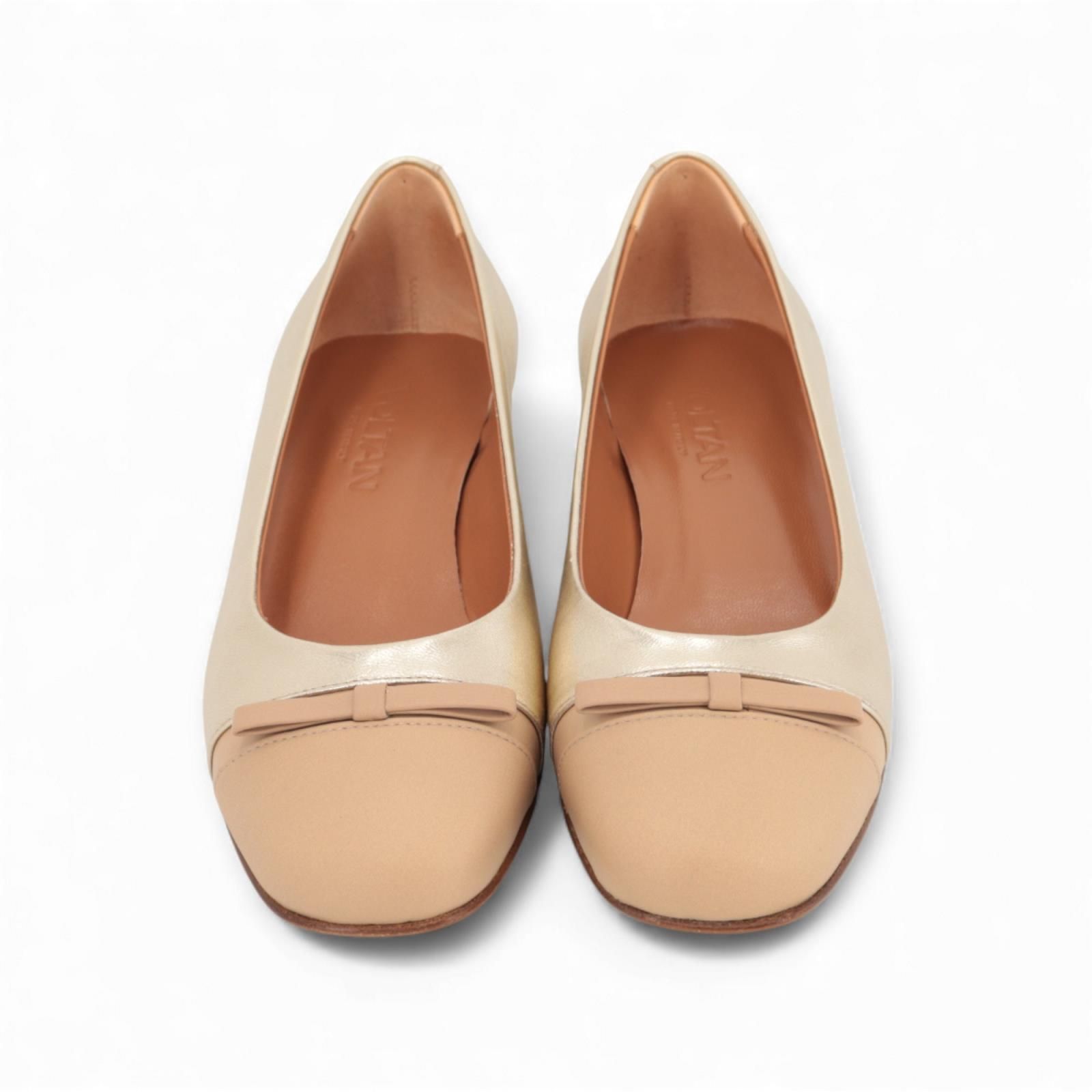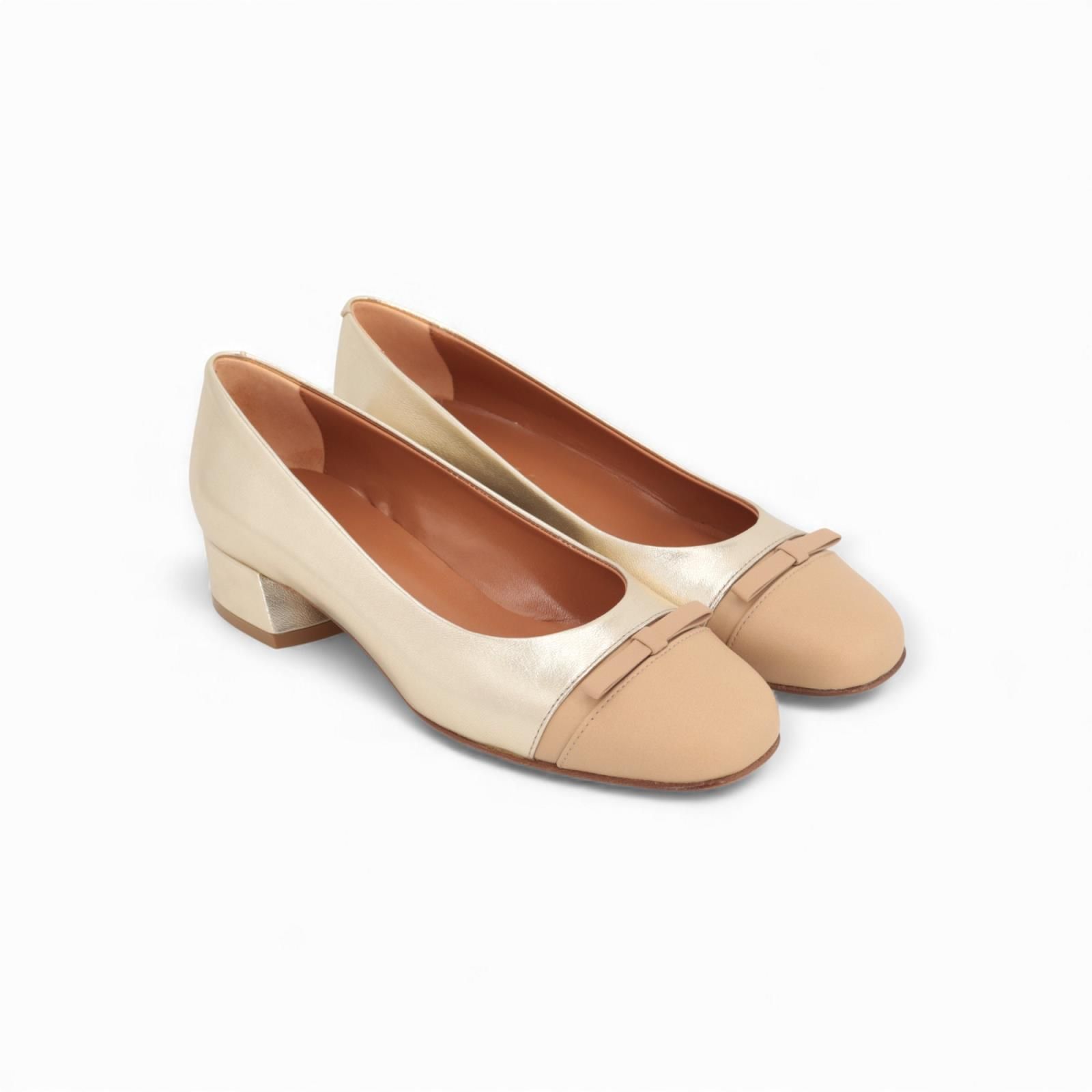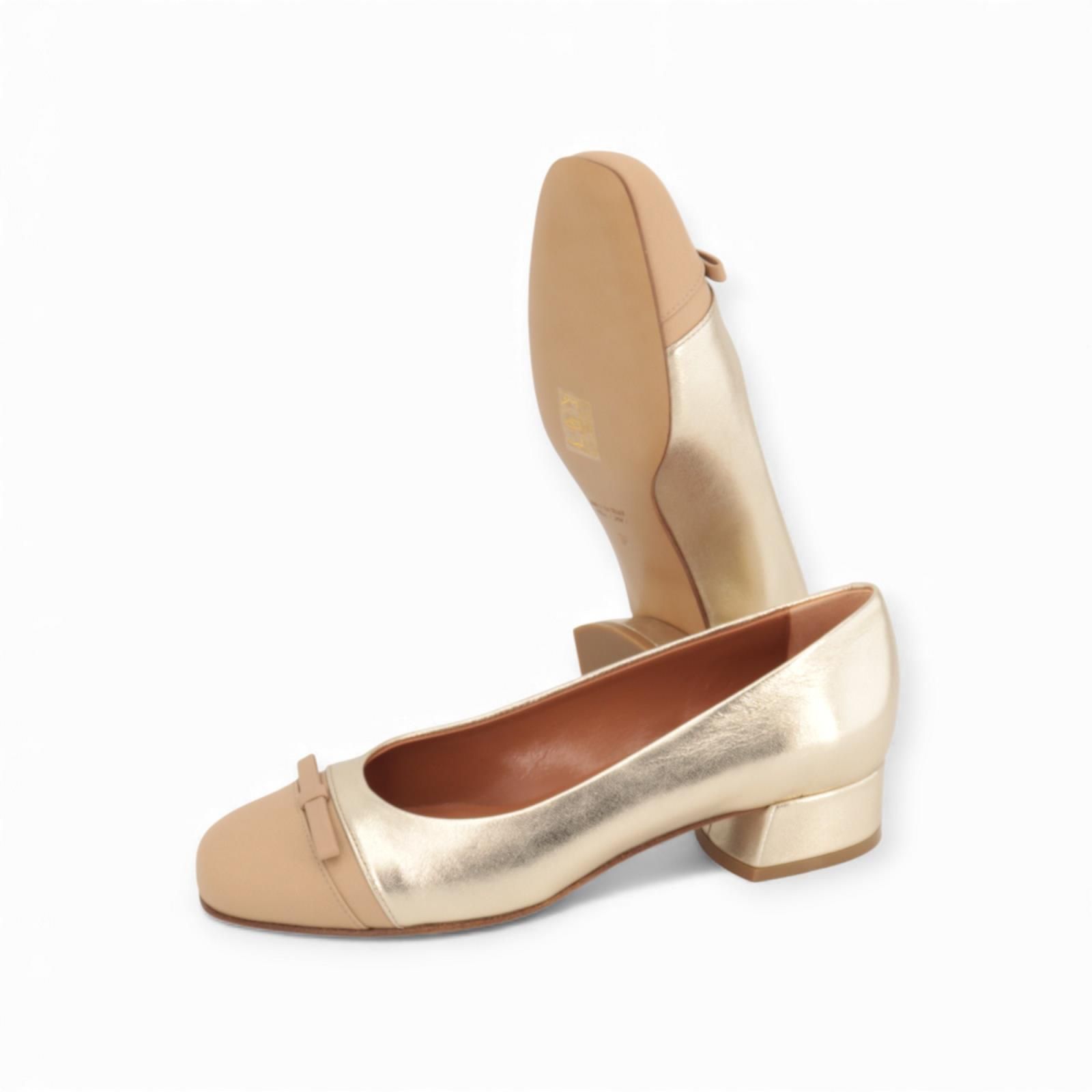 Ballerina LV511F van Voltan voor dames. Is in platino goud shining leer met een beige neus afgewerkt met een strikje. Deze elegante ballerina is op een klein hieltje van 2,5cm hoog, mooi mee afgewerkt in shining goud leer. Het buitenzooltje is in leer.