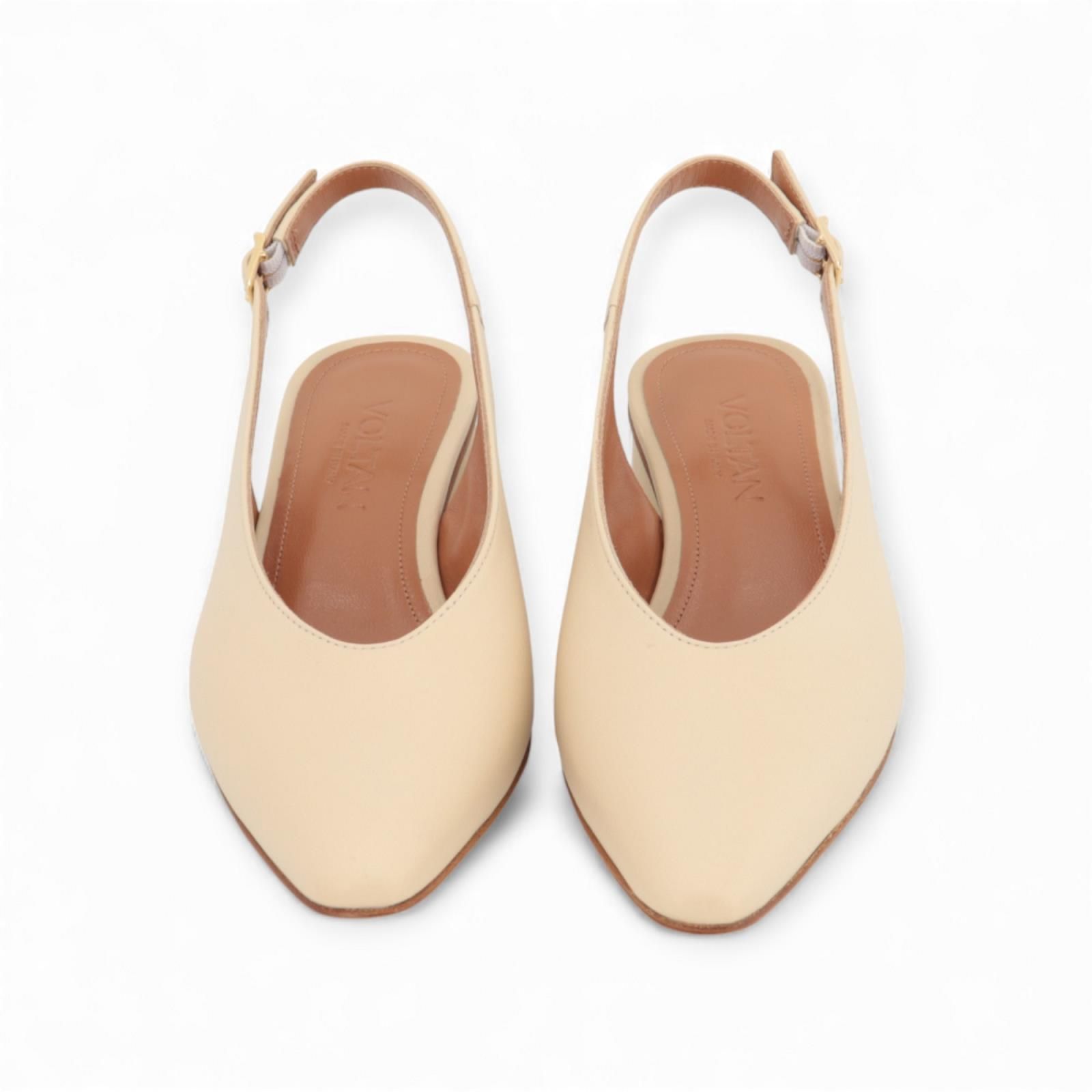 Pump LV576 van Voltan voor dames. Dit elegant slingback model is in ecru ‘panna’ leer. Is diep uitgesneden met een licht scherpe top. Heeft een open hieltje met een gespsluiting rond de hiel. Is op een mooi afgewerkt rond hakje van 3cm hoog met een buitenzool in leer.