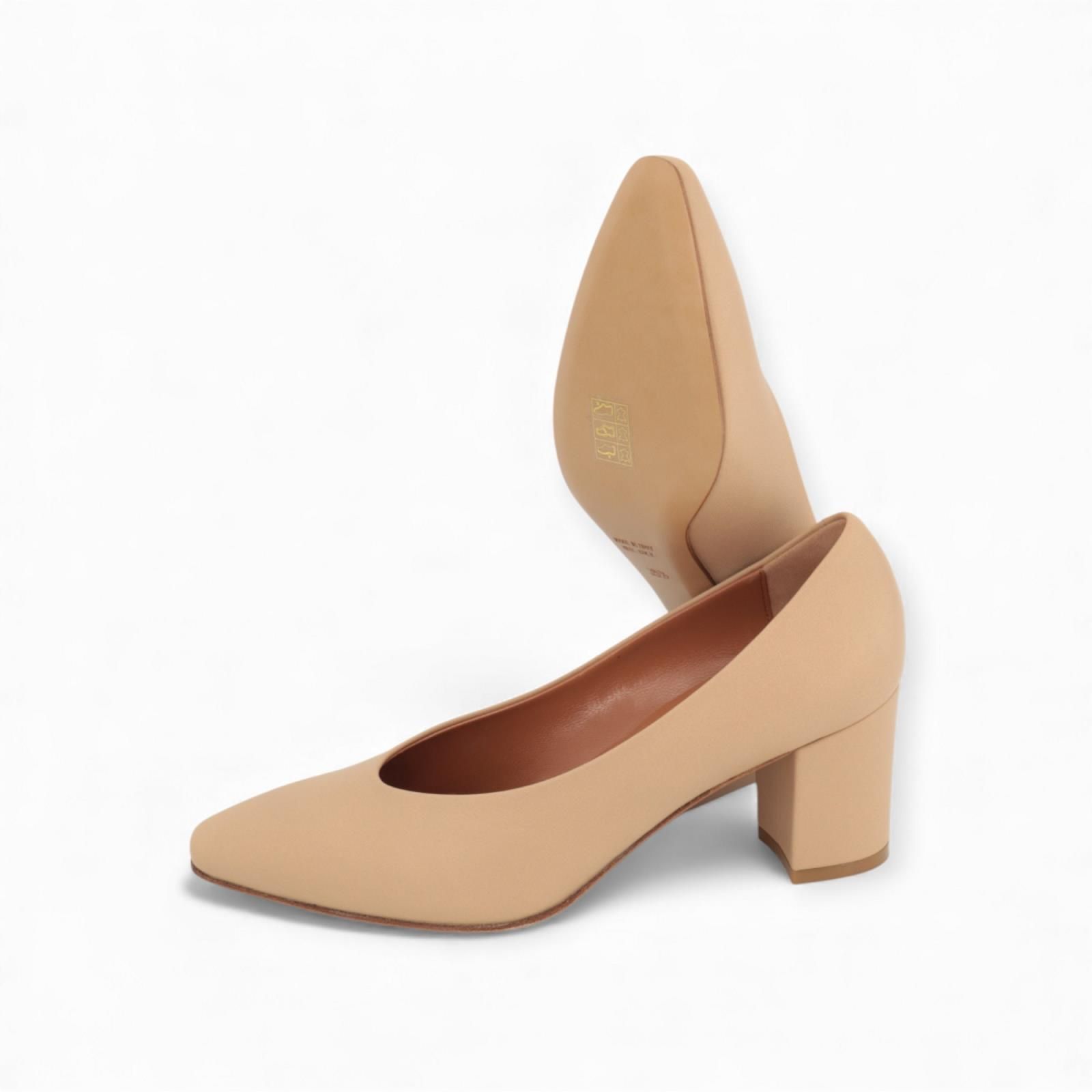 Pump LV582 van Voltan voor dames. Deze elegante pump is in beige leer. Is diep uitgesneden en heeft een licht scherpe top. Heeft een blokhakje van 6,5cm hoog en is op een buitenzooltje in leer.