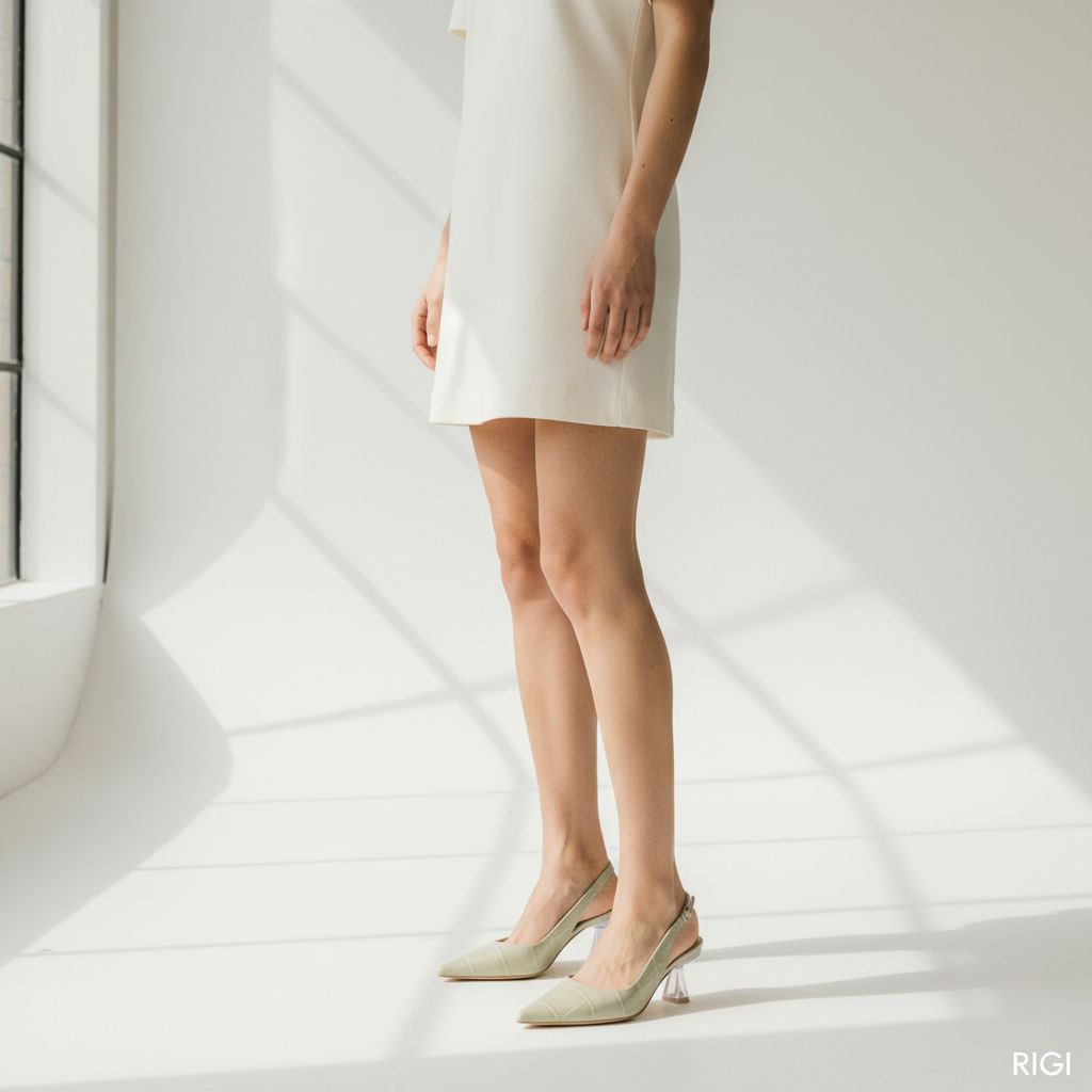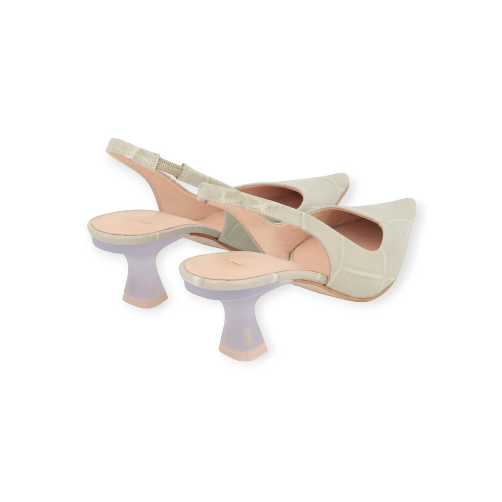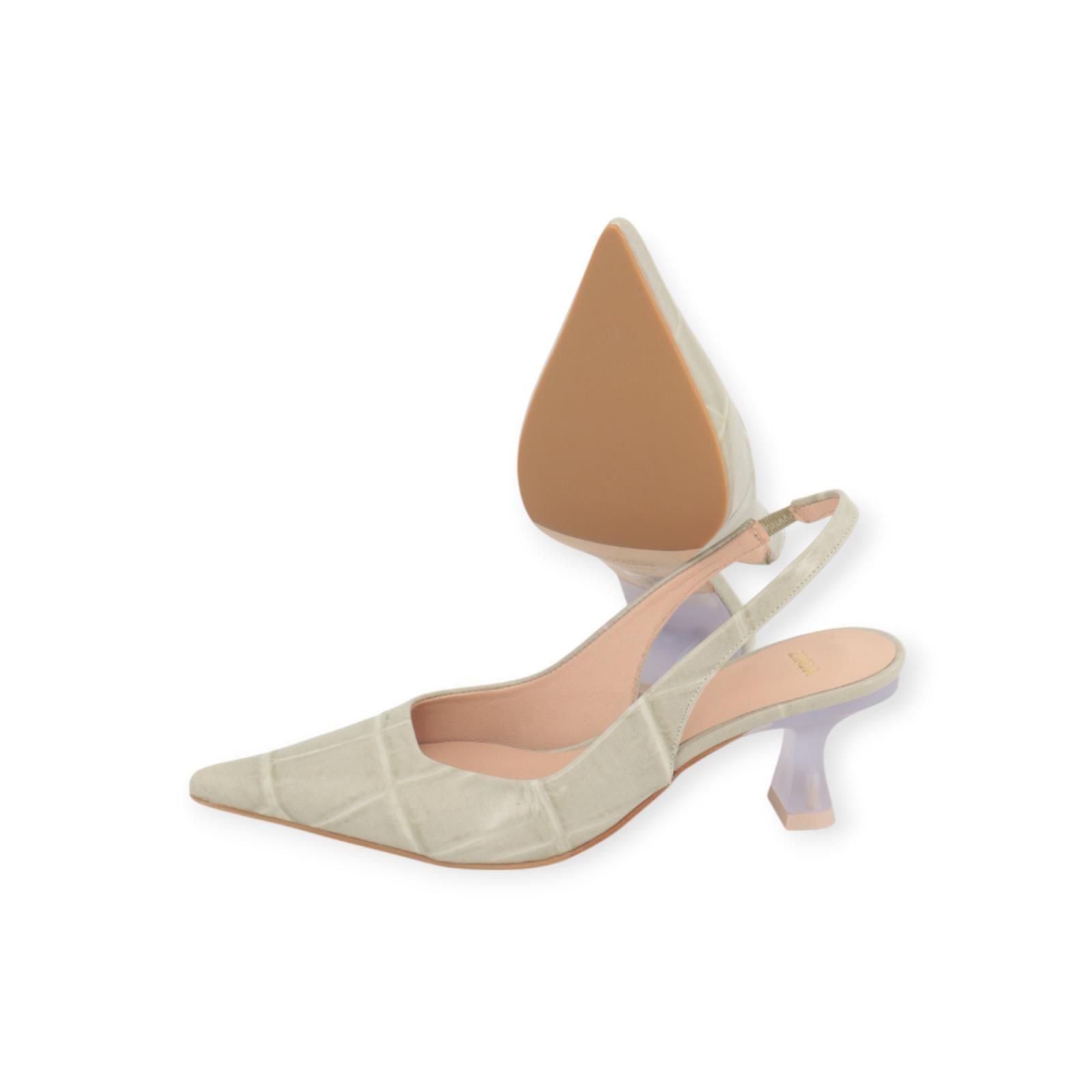 Pump 2748 van Zinda voor dames. Dit slingback model is in licht groen crocco leer. Heeft een scherpe neus met een open hieltje. Blijft mooi vast aan de voet door het elastiek rond de hiel. Heeft een opvallend geometrisch hakje in licht blauw, grijs van 5-5.5cm hoog. Is op een antislipbuitenzooltje.