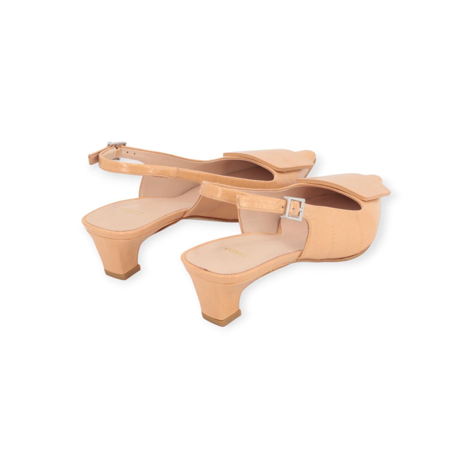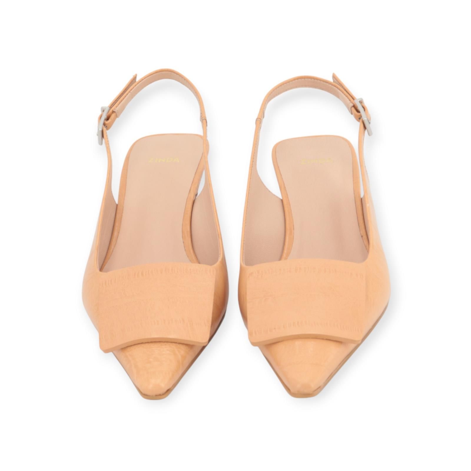 Pump 3427 van Zinda voor dames. Dit slingback model is in camel licht crocco leer. Heeft een scherpe neus met een mooie boekel over de wreef en een open hieltje. Is afgesloten met een gespsluiting rond de hiel en heeft een klein blokhakje van 3-3.5cm hoog. Is op een antislipbuitenzooltje