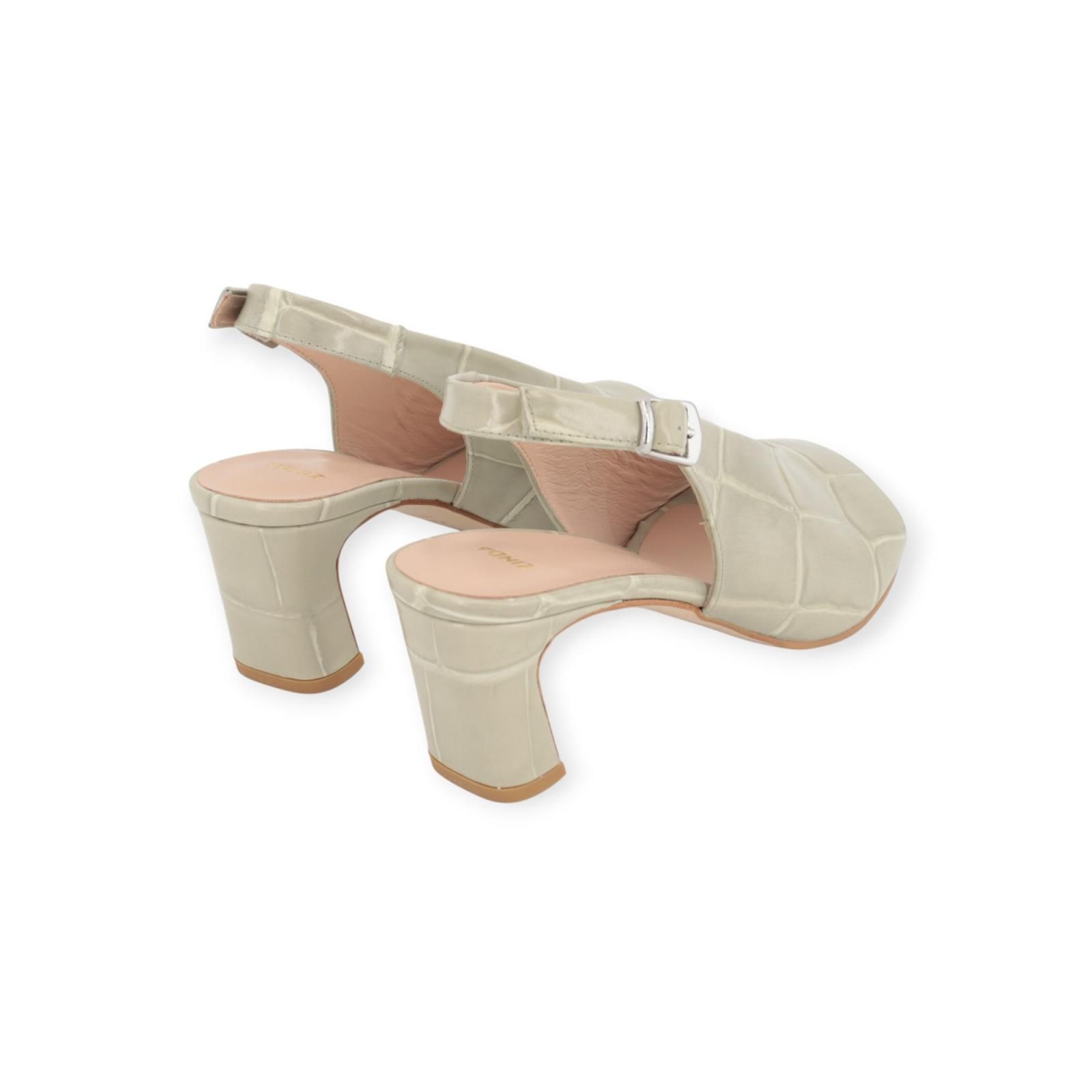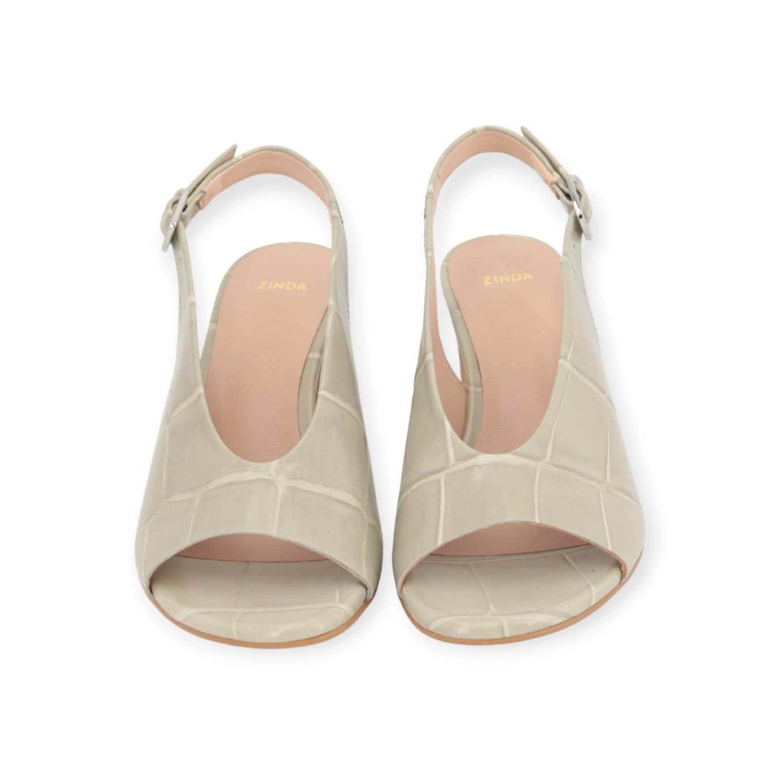 Sandaal 3517 van Zinda voor dames. Deze elegante sandaal is in licht groen crocco leer. Is met een gespsluiting rond de hiel. Heeft een ronde neus met een blokhakje van 7-7.5cm hoog. Is op een antislipbuitenzooltje