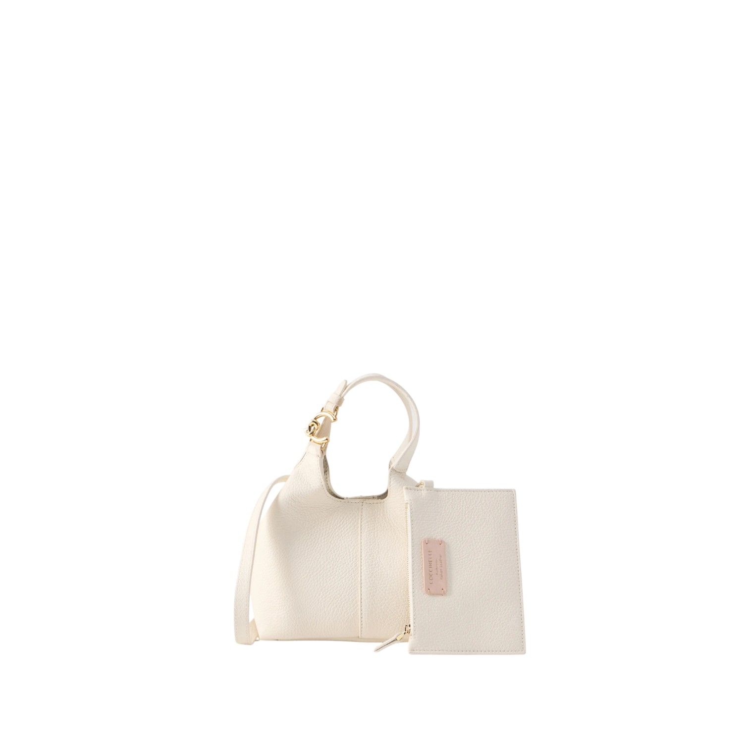 Hand -en schoudertas C-Easy small van Coccinelle voor dames. Deze handtas is in off wit zacht leer. Heeft aan de handvaten Het C met plectrum detail in goud. Is afgesloten met een drukknoop sluiting en een riem met drukknop voor het model terug mooi in zijn vorm te krijgen en als extra afsluiting. De binnenkant is 1 open ruim vak met een aparte etui in off wit leer met ritssluiting die je kan afhalen met behulp van karabijnhaakje.