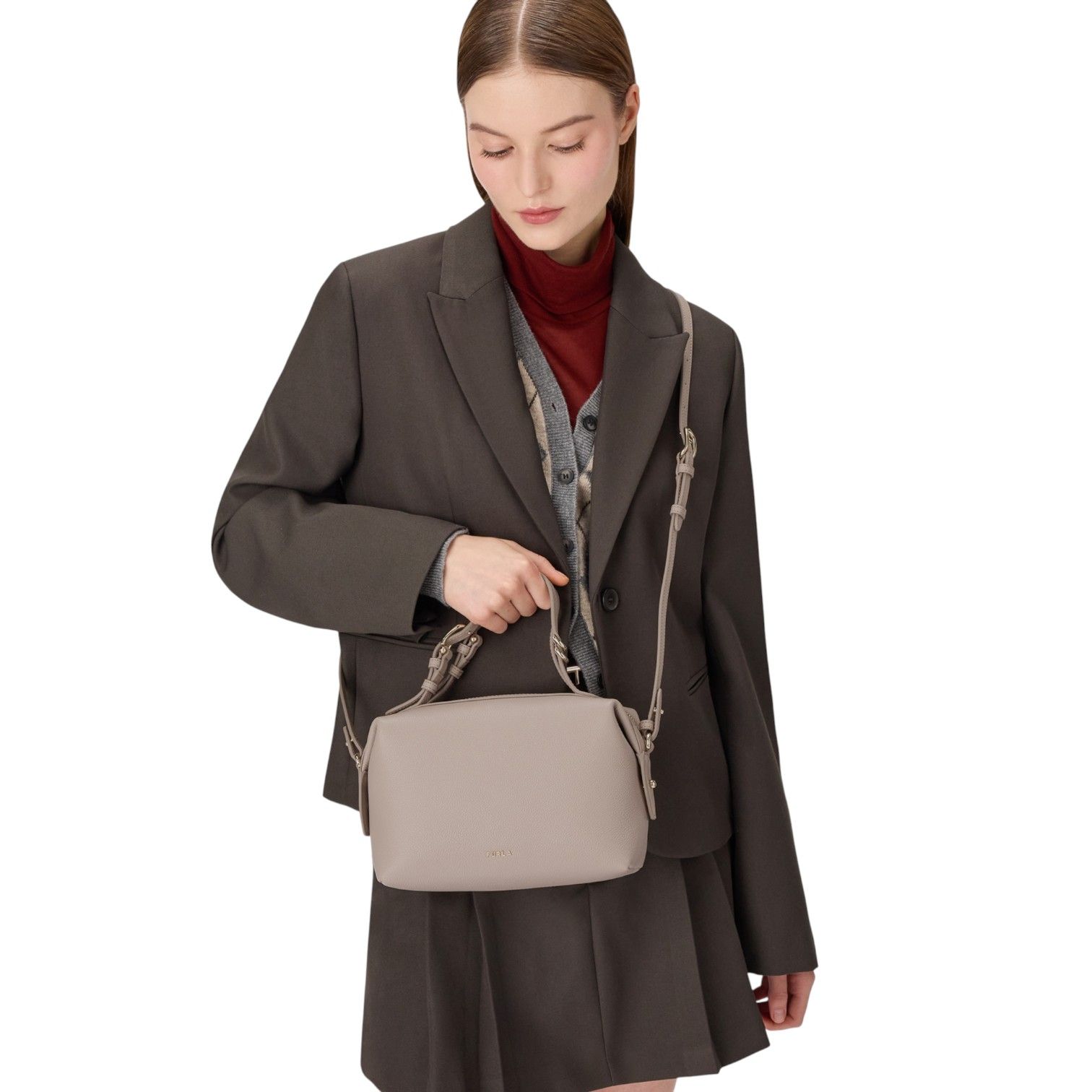 Hand -en schoudertas Double mini Boston van Furla voor dames. Deze handtas is in taup fijn generfd kalfsleer. Deze handtas is met zijn mini-silhouet perfect voor iedere gelegenheid. De bijpassende schouderband is verstelbaar en afneembaar waardoor je hem op verschillende manieren kan stylen. De 2 handvatten zijn versierd met het iconische Arch-logo van Furla en hebben een D ring om je look te personaliseren met bedels. Heeft binnenin een ruim binnenvak met aan de zijkanten een steekvak en vakje met rits. Is afgesloten met een ritssluiting.