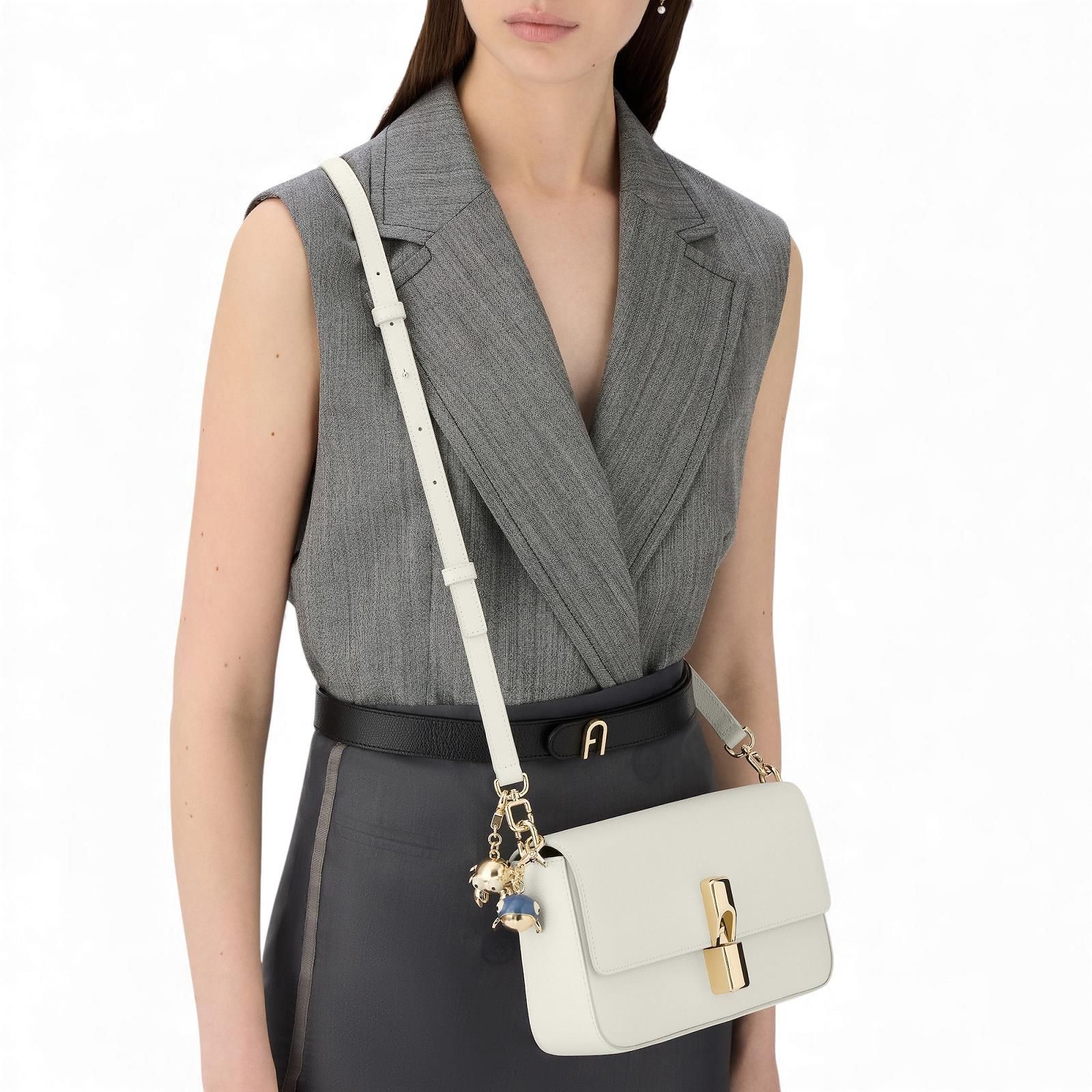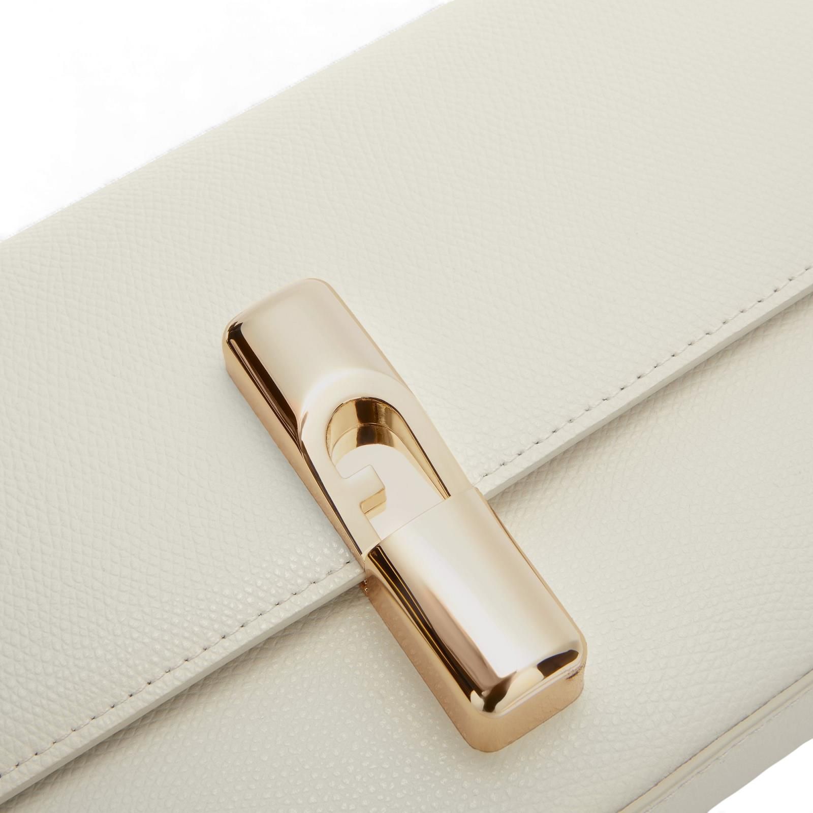 Crossbody Iride van Furla voor dames. Deze crossbody is in off white leer. Gekenmerkt met eigentijds design. Het compacte silhouet is voorzien van een verstelbare en afneembare schouderband voor als clutch, crossbody of schoudertas te gebruiken. De magnetische sluiting is versierd met cilindrische metalen details en afgewerkt met het iconische Furla Arch-logo. Heeft binnenin 1 vak met zijvakje met ritssluiting.