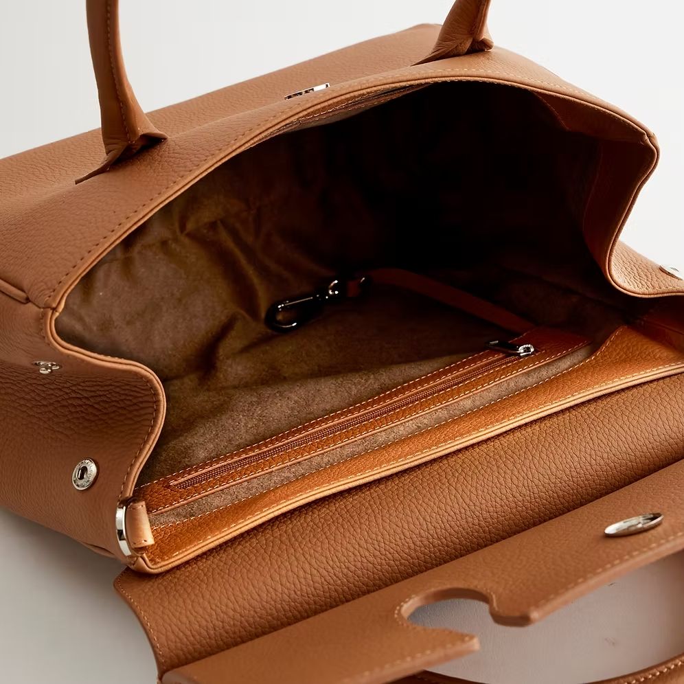 Hand -en schoudertas Clara van Nathan-Baume voor dames. Deze handtas is in cognac leer. Heeft een flap afgesloten met N logo met magneetsluiting onder de flap. Heeft 2 lange handvaten en is voorzien van een afneembare, verstelbare schouderband om over de schouder te dragen. Is binnenin een ruim vak met 2 steekvakjes aan de zijkant, 1 met ritssluiting aan de andere kant, en een karabijnhaakje voor sleutels aan te hangen. De handtas kan makkelijk ruim opengedaan door de drukknopjes aan de zijkant.