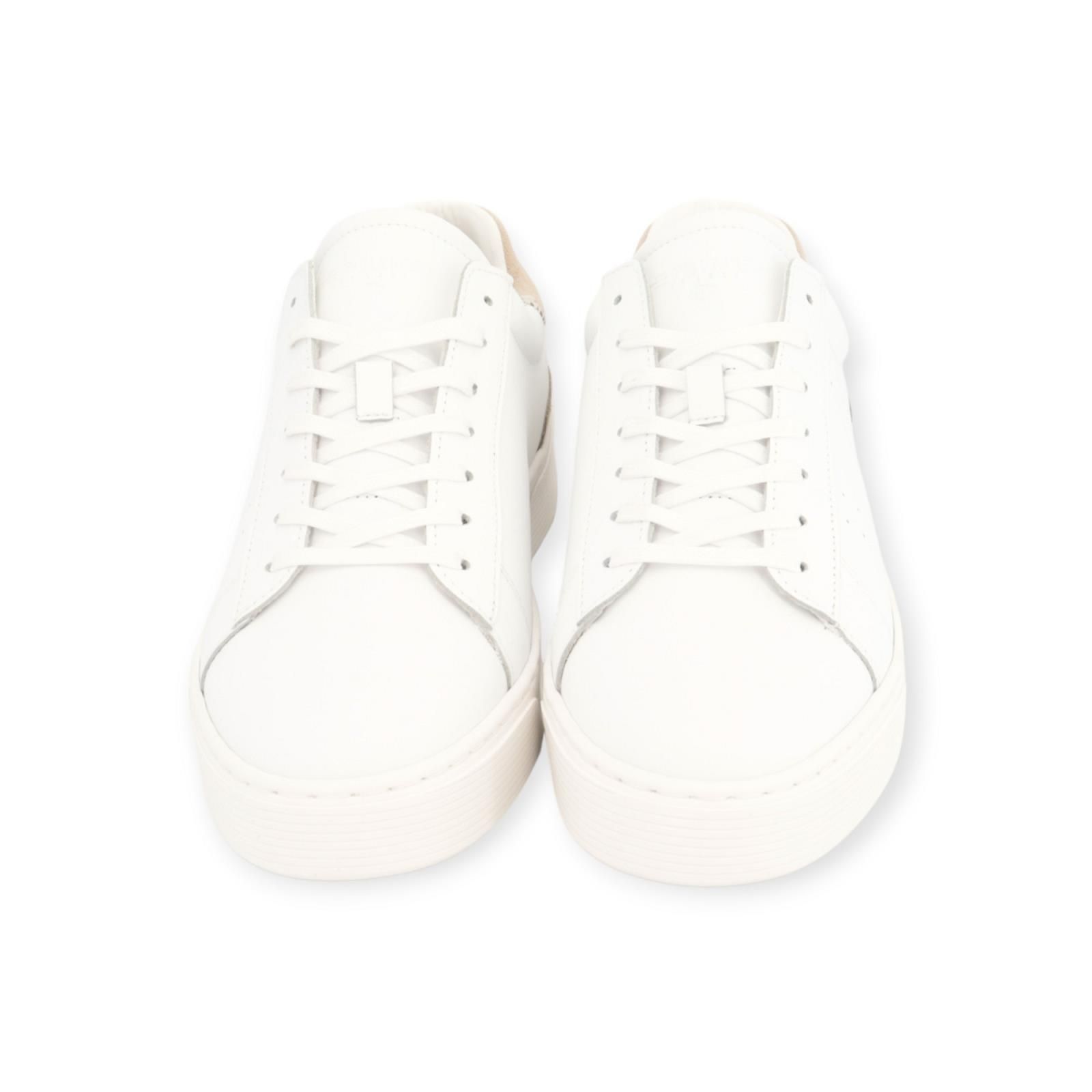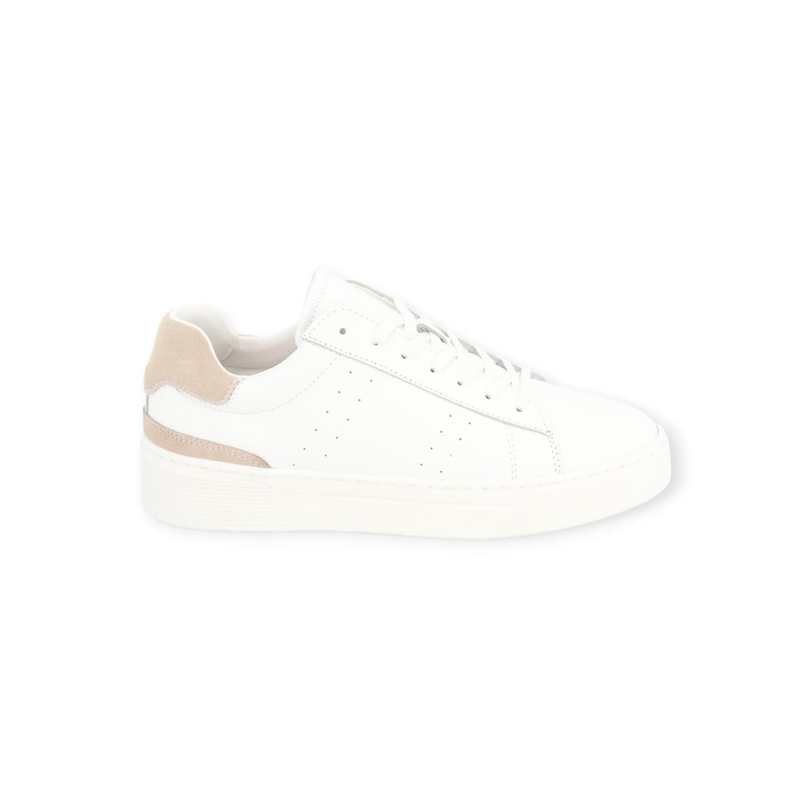 Cycleur de Luxe sneaker T12 voor heren. Deze witte sneaker is volledig in leder met suède zand kleur aan de hiel. Heeft een vaste rubberen zool en een uitneembare binnenzool.