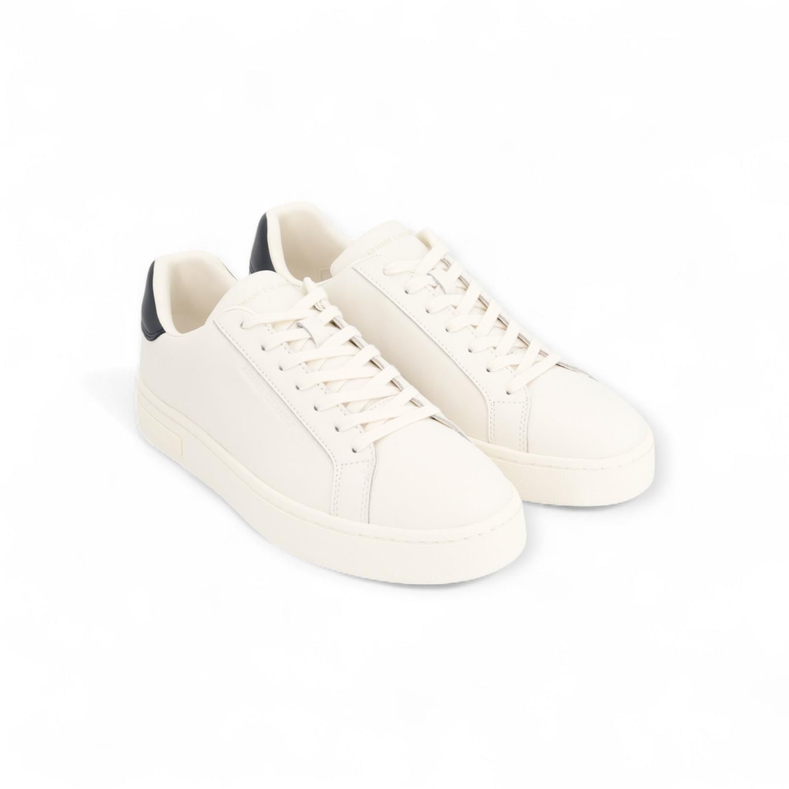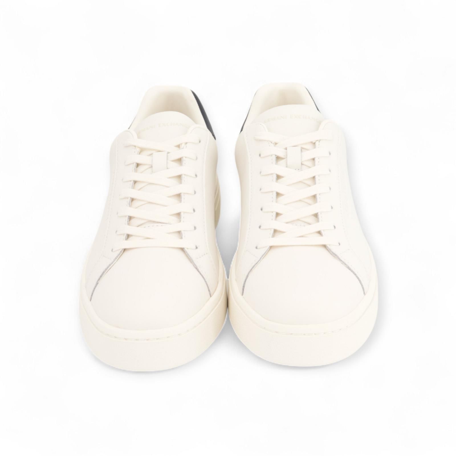 Sneaker van Giorgio Armani voor heren. Deze sneaker is in off wit leer. Is mooi afgewerkt met een blauw hielflap met logo AX. Is op een lichte zool met een uitneembare binnenzool. Dit model is uit de Armani Exchange collectie