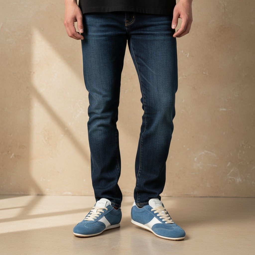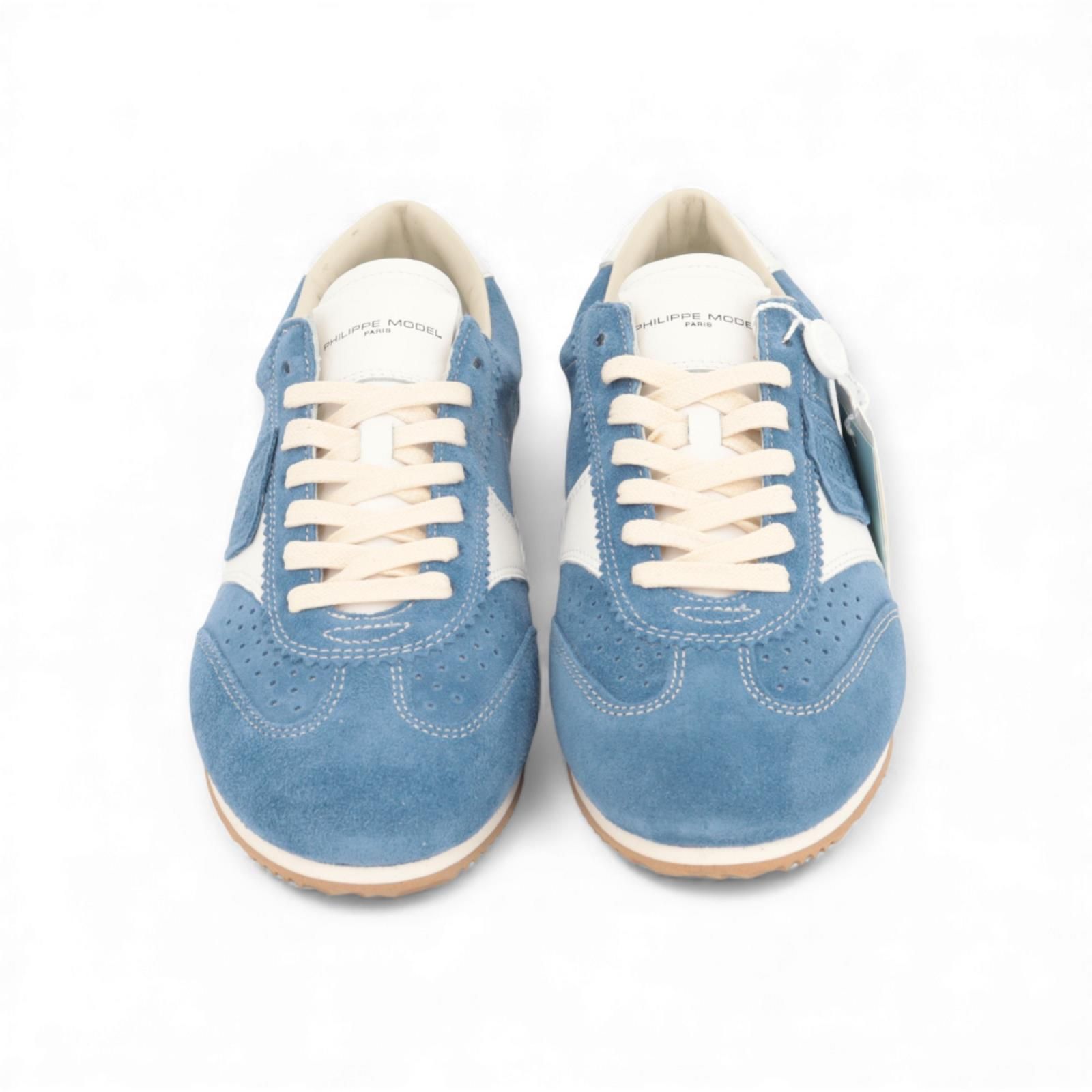 Sneaker Planche van Philippe Model voor heren. Deze nieuwe sneakers combineren de gestroomlijnde vormen van loafers met de praktische eigenschappen van sneakers. Is in blauw jeans denim suède met gekartelde en geperforeerde texturen. De witte stiksels en wit leren inzetstukken zorgen voor extra karakter. Is binnenin in badstof en leer met een uitneembare zool. De buitenzool is ultralicht en in microporeus rubber.