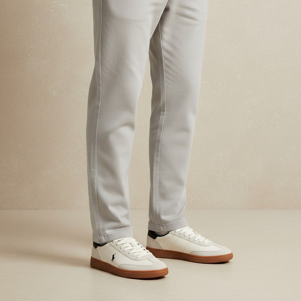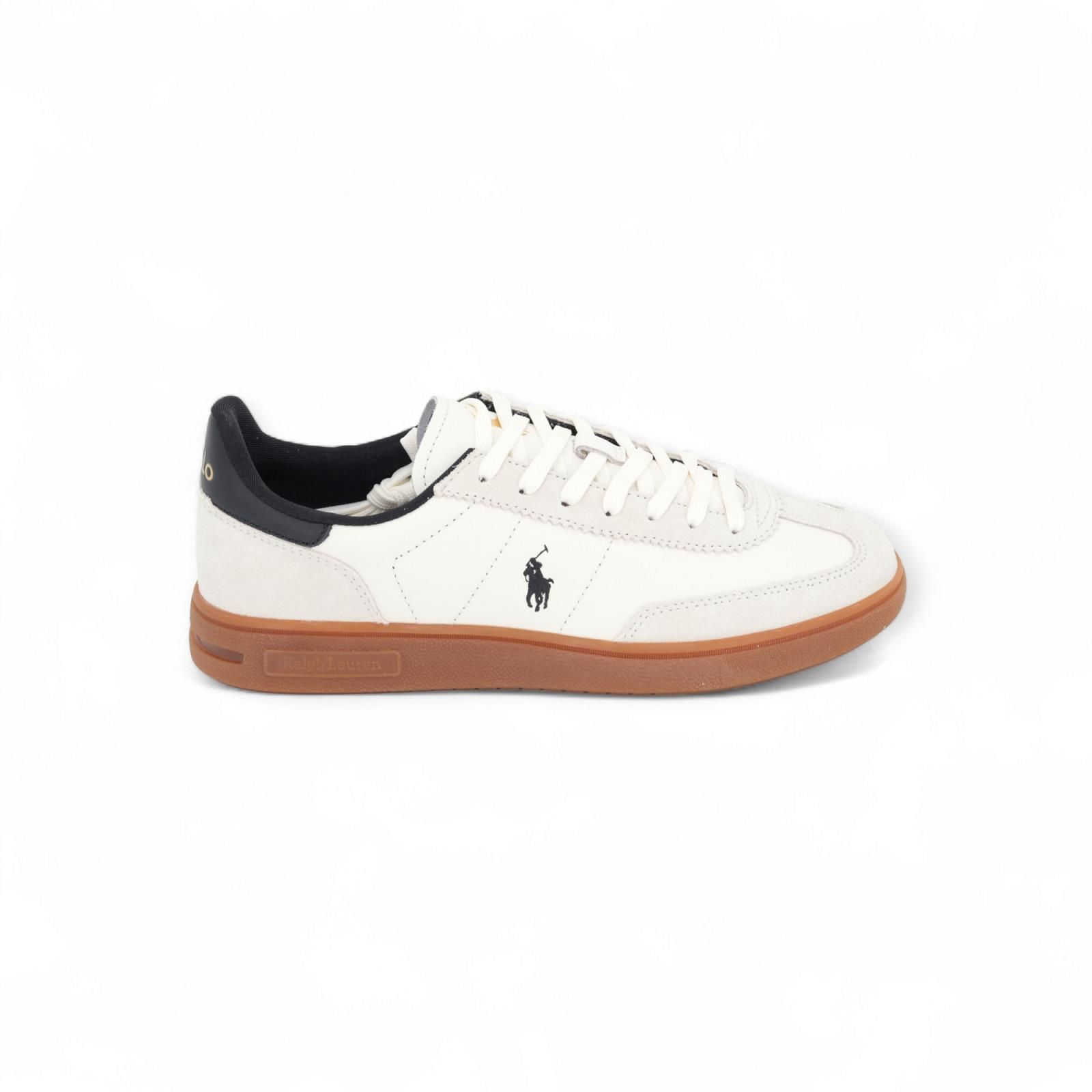 Sneaker Bedford PP van Polo Ralph Lauren voor heren. Deze sneaker is in wit leer met suède. Is verfraaid met gekartelde randen en een gesptreepte grosgrain. Afgewerkt met een zwarte hielflap en het zwarte iconische logo aan de zijkant. Is op een bruine gummyzool en de binnenzool is uitneembaar.