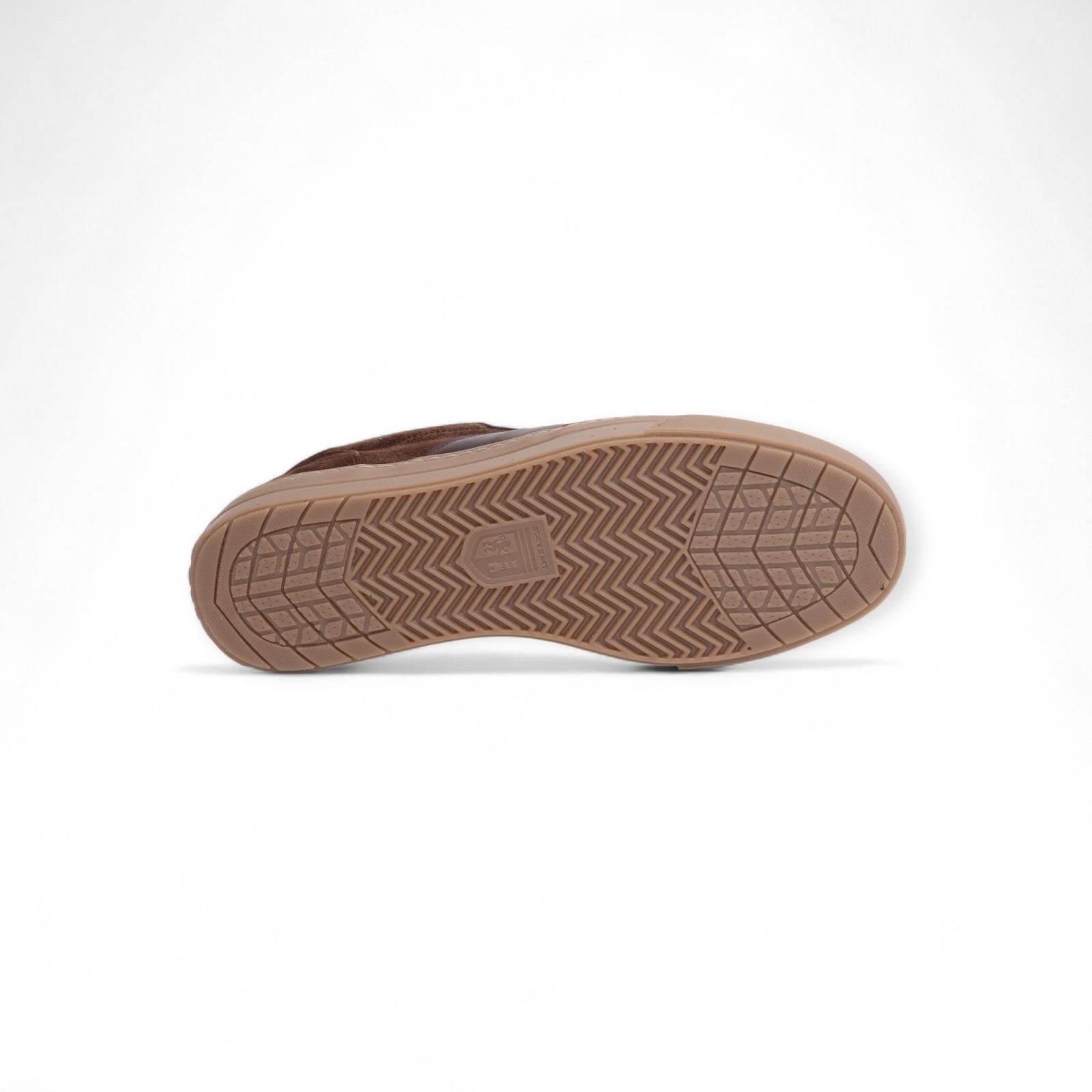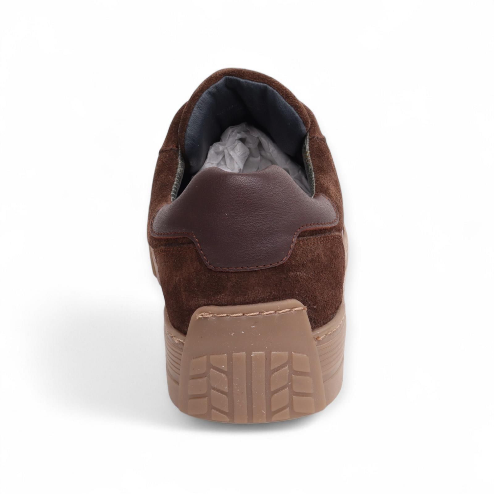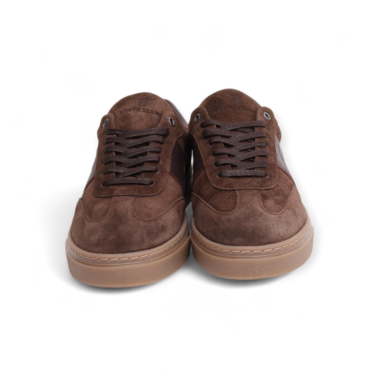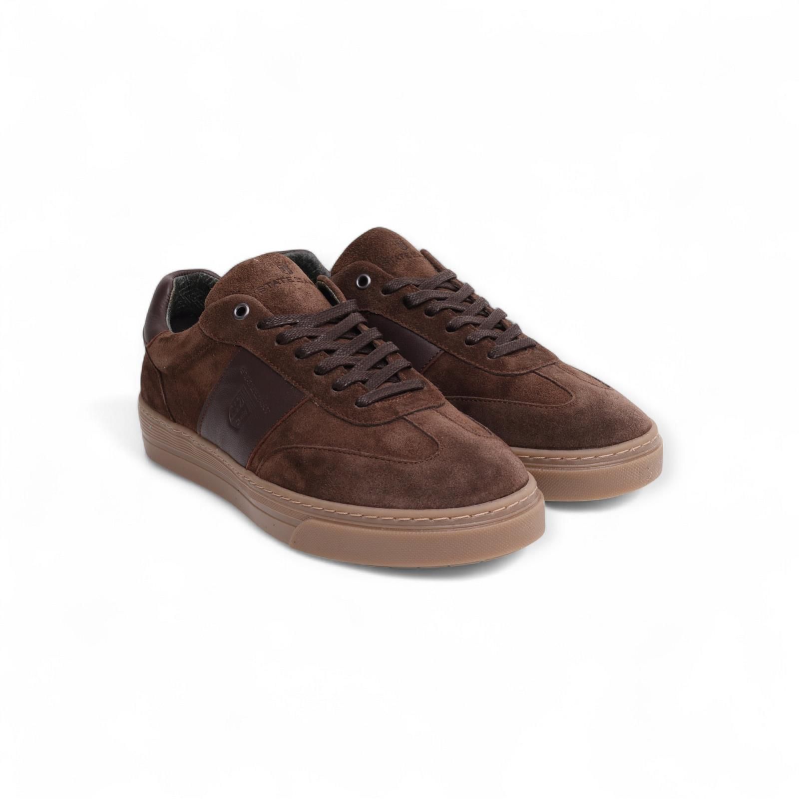 Sneaker Gasket van State Of Art voor heren. Deze sneaker is in donker bruin suède. Heeft een leder band aan de zijkant met het logo in en en hielflap in leer. Is op een aangename gummy zool die makkelijk plooibaar is. De binnenzool is uitneembaar.