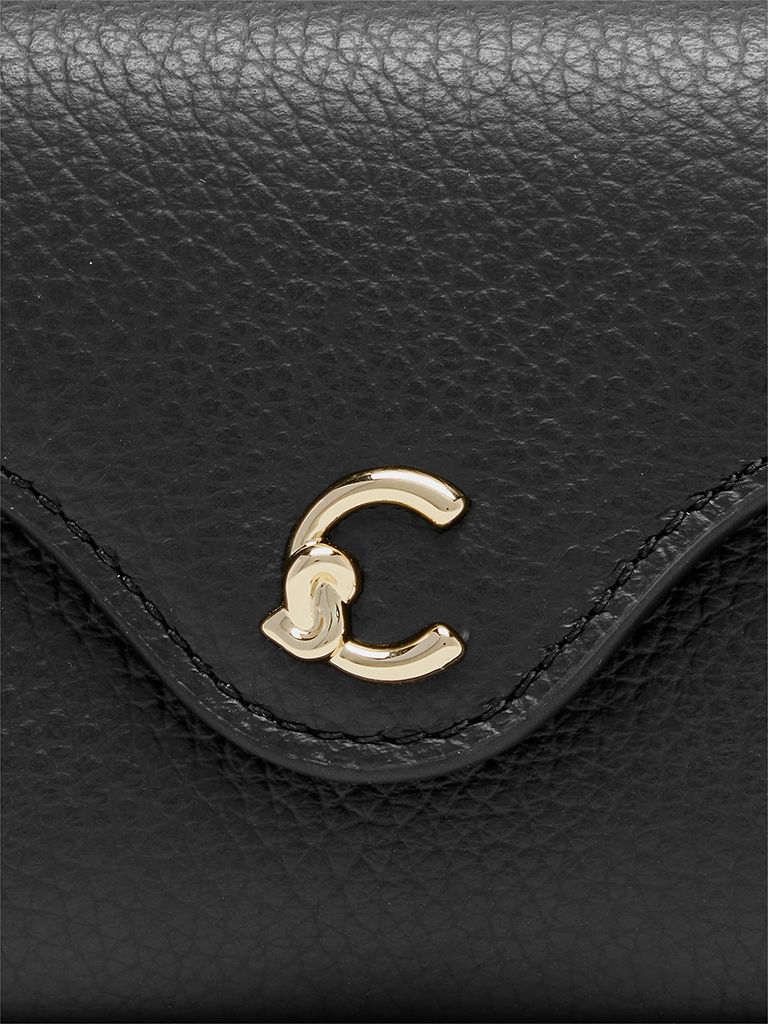 Portemonnee C-ME van Coccinelle voor dames. Deze portemonnee is in zwart gekorreld leer met klep en drukknoopsluiting. Is verfraaid met het gouden C logo. Is onderverdeeld in 1 biljethouder, 3 steekvakjes en 6vakjes voor kaarten.